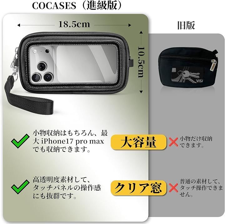 正面はタッチパネルに対応でスマートフォン(最大iphone17 promax 6.9inch)を入れてそのまま操作可能です(*FaceIDのロック解除できません。)。