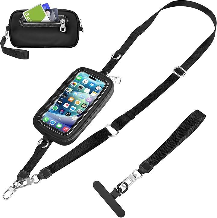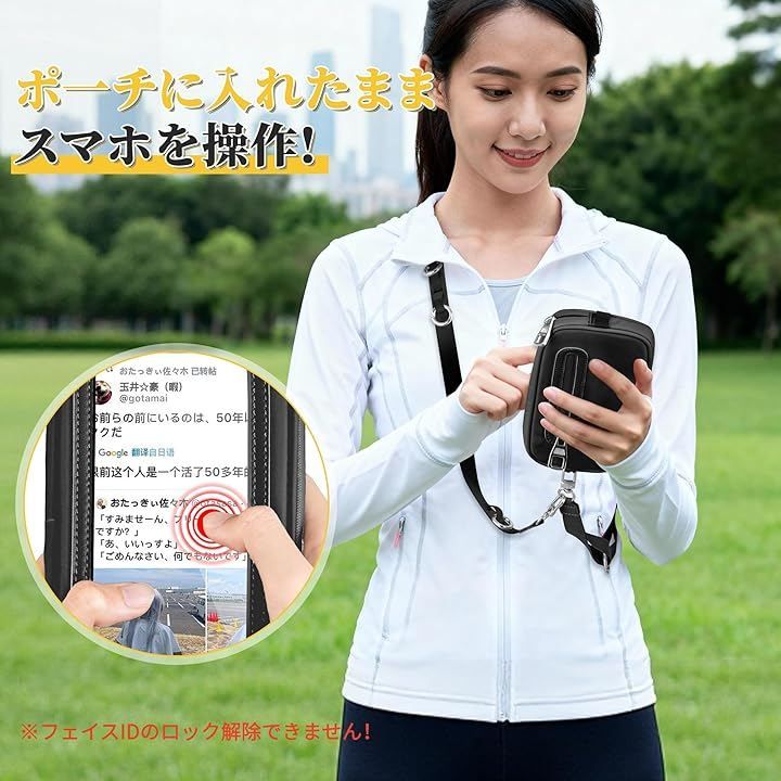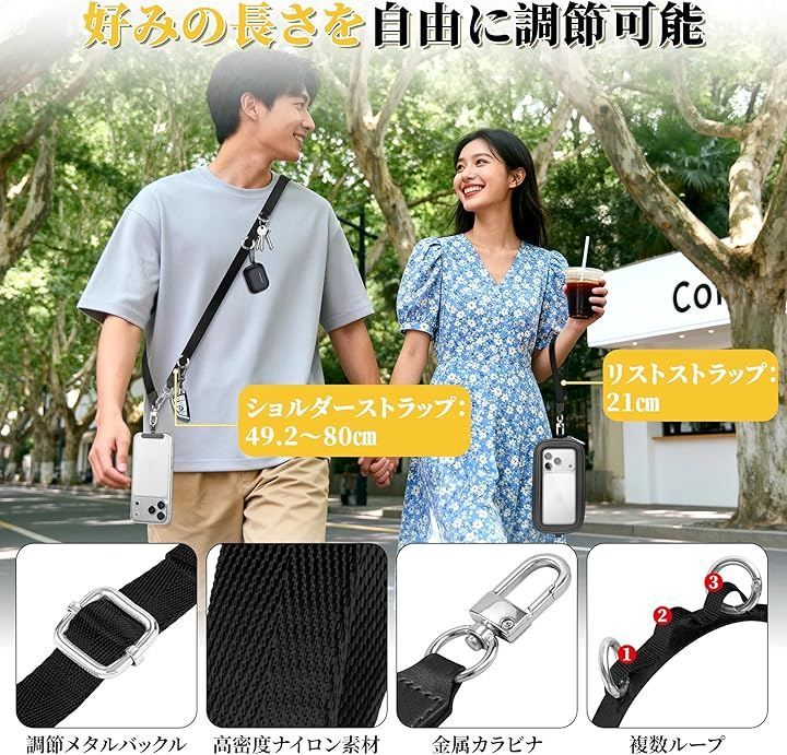 パッケージ内容:ショルダーストラップx1、ハンドストラップx1、スマホポーチx1、ストラップホルダーx1、丸カラビナx4(外径3cmx1+外径2.3cmx3)、日本語取扱説明書x1