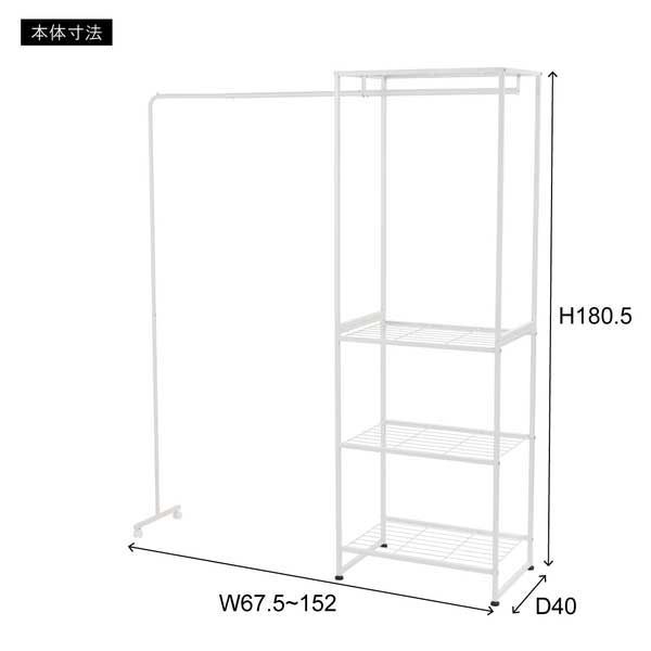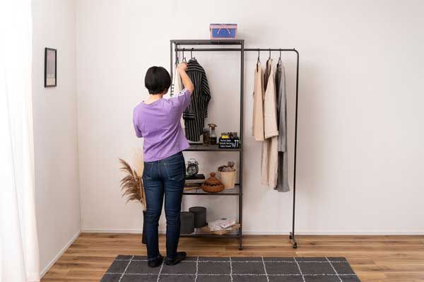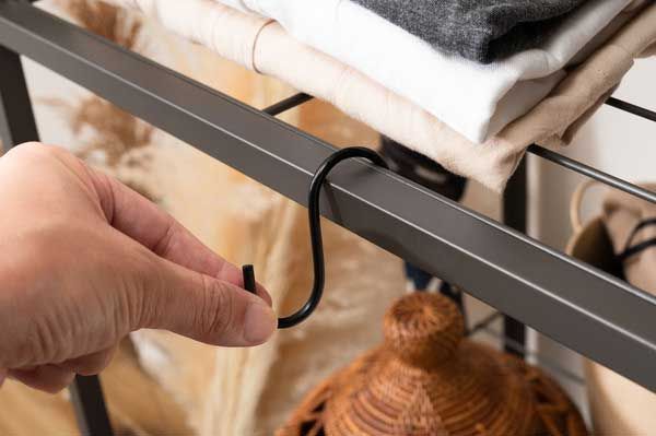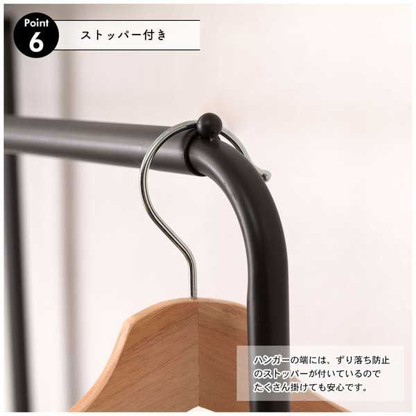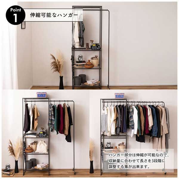 伸縮機能が付いたハンガーが付いており、衣類を掛ける量やお部屋の広さに合わせて、ハンガーの幅を調整する事が出来ます。