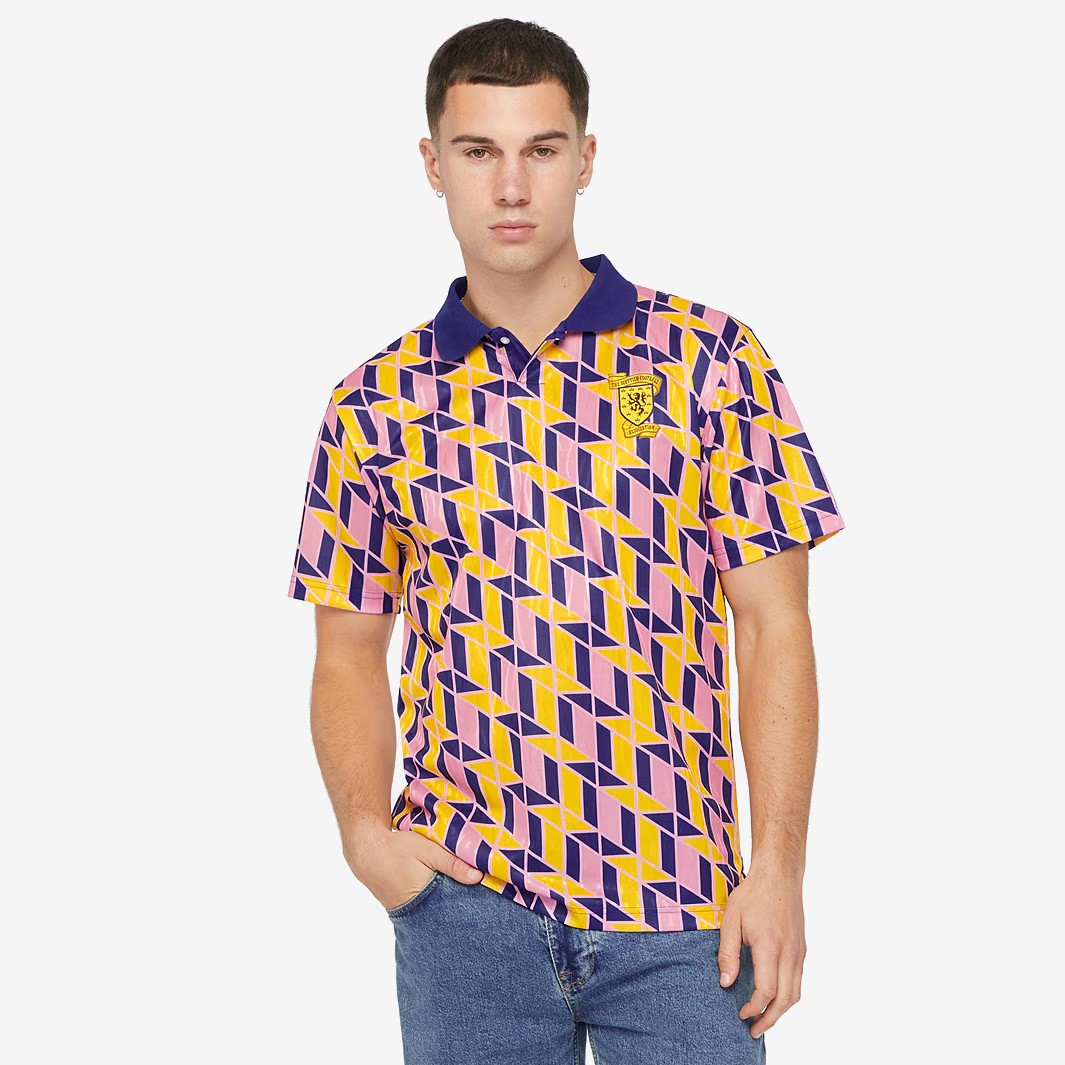 1990年イタリアW杯(Italia 90)の熱狂を呼び起こす、Score Draw サッカー スコットランド代表 1990 サード 復刻シャツです。アリー・マッコイストやロイ・エイトケンといったレジェンドたちが活躍した時代の、アイコニックなマルチカラーデザインを採用しています。