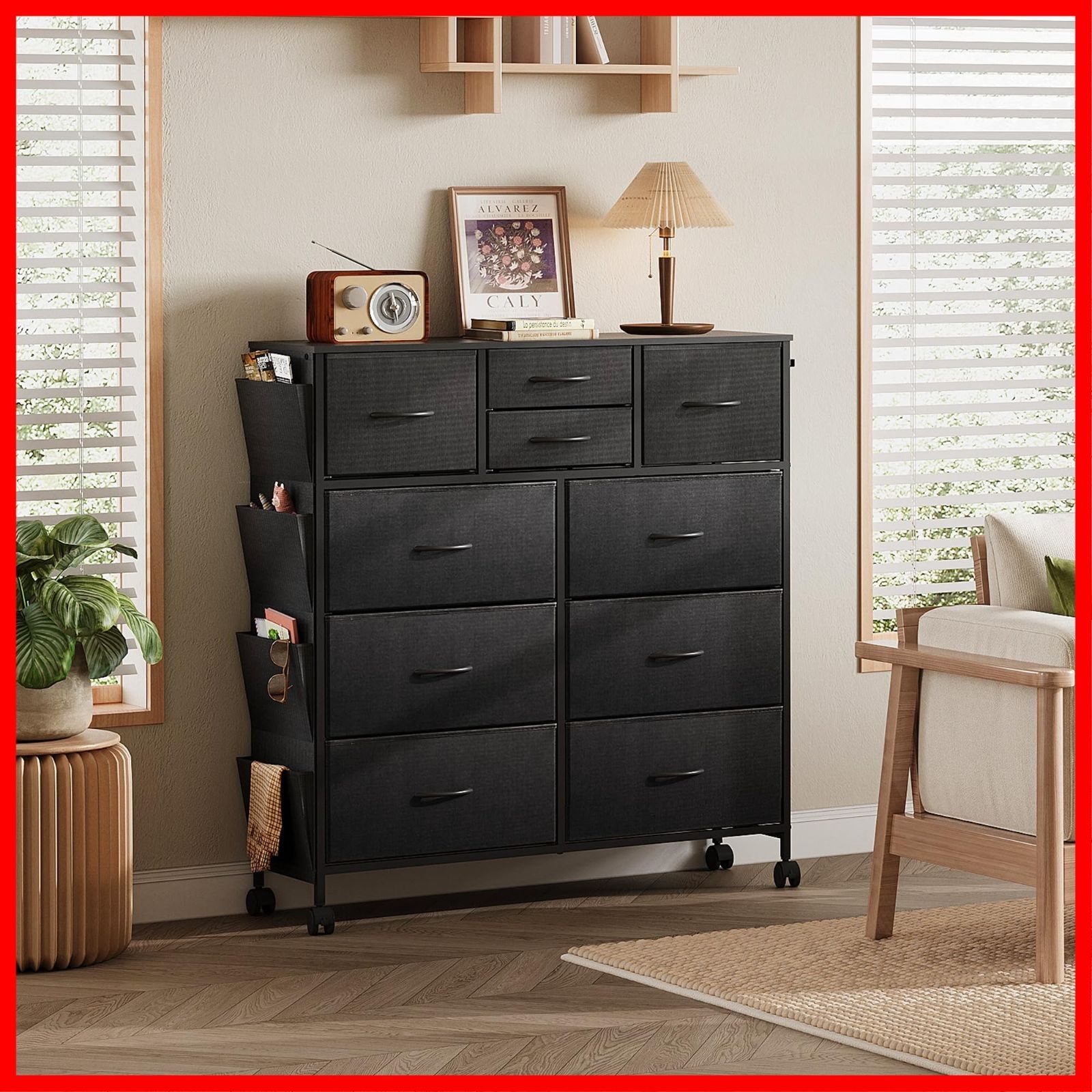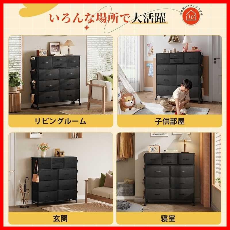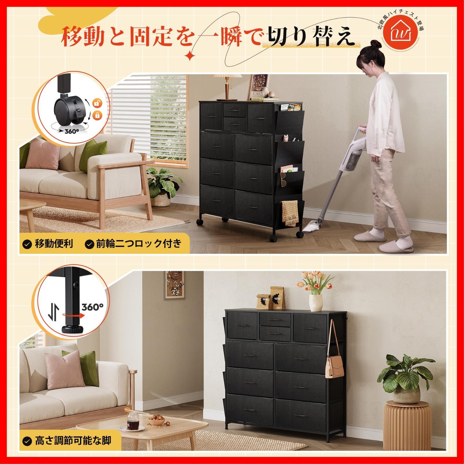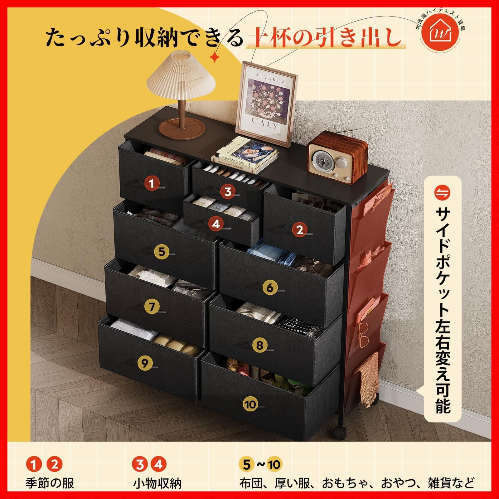 WLIVE チェスト タンス キャスター付き サイドポケット付き 4段10杯 箪笥 ハイチェストチェスト4段 リビング収納 おしゃれ 収納チェスト 引き出し 大容量 洋服タンス 布製 衣類収納 北欧 シンプル ブラック