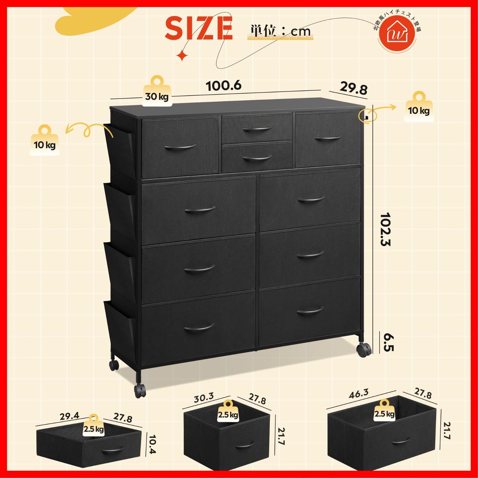 2.収納スペースたっぷり: 見た目はシンプルだけど、10つの引き出しもあり、収納力抜群です。下部の4つの大きな引き出しは、毛布、スカーフ、靴下、子供のおもちゃや衣類などをたっぷり収納できます。上部の小さい引き出しは、身に着ける衣類や靴下などを収納できます。サイドポケットは左右どちらにでも交換可能で、さらに4つの空間があり、靴下や鍵などの小物を収納できます。
