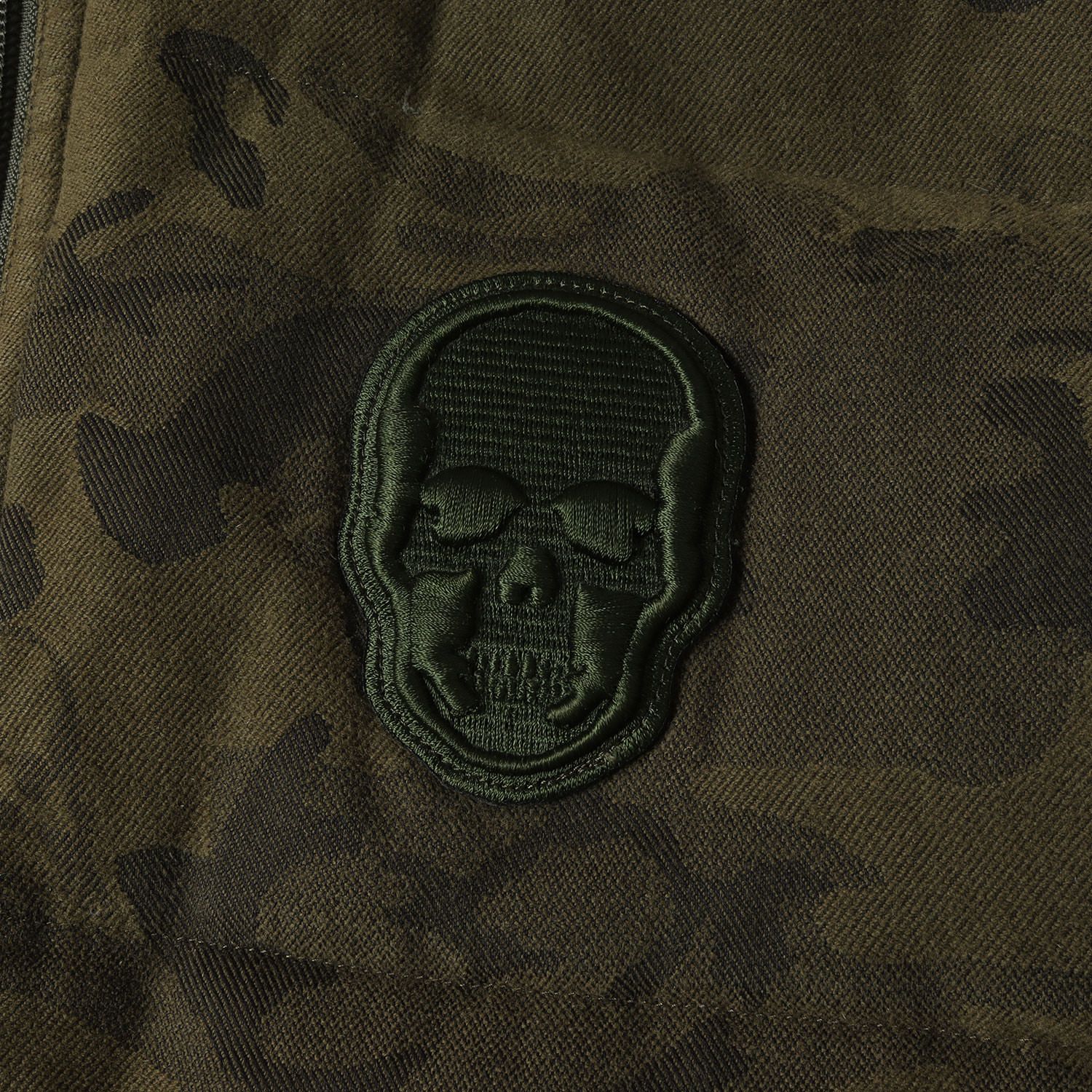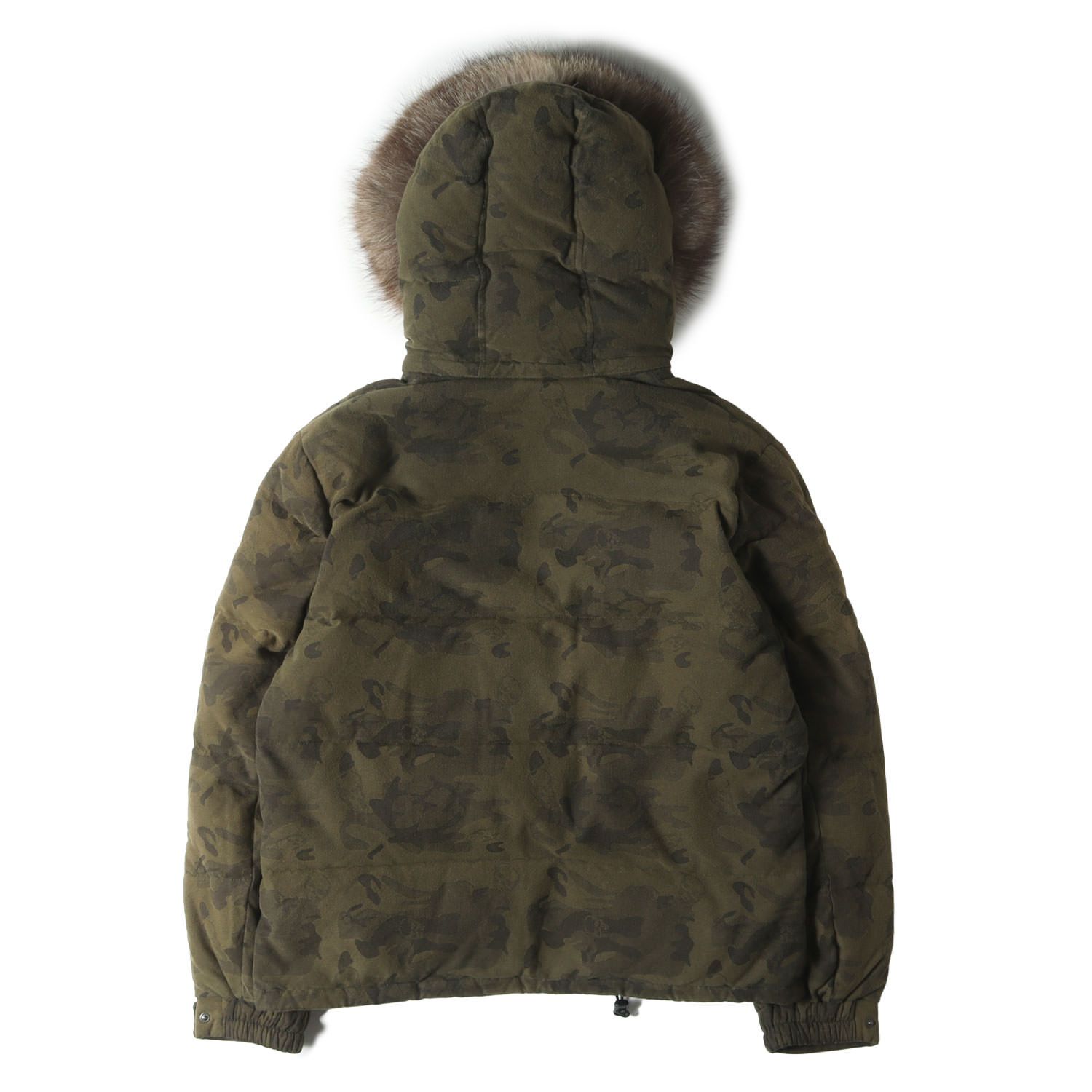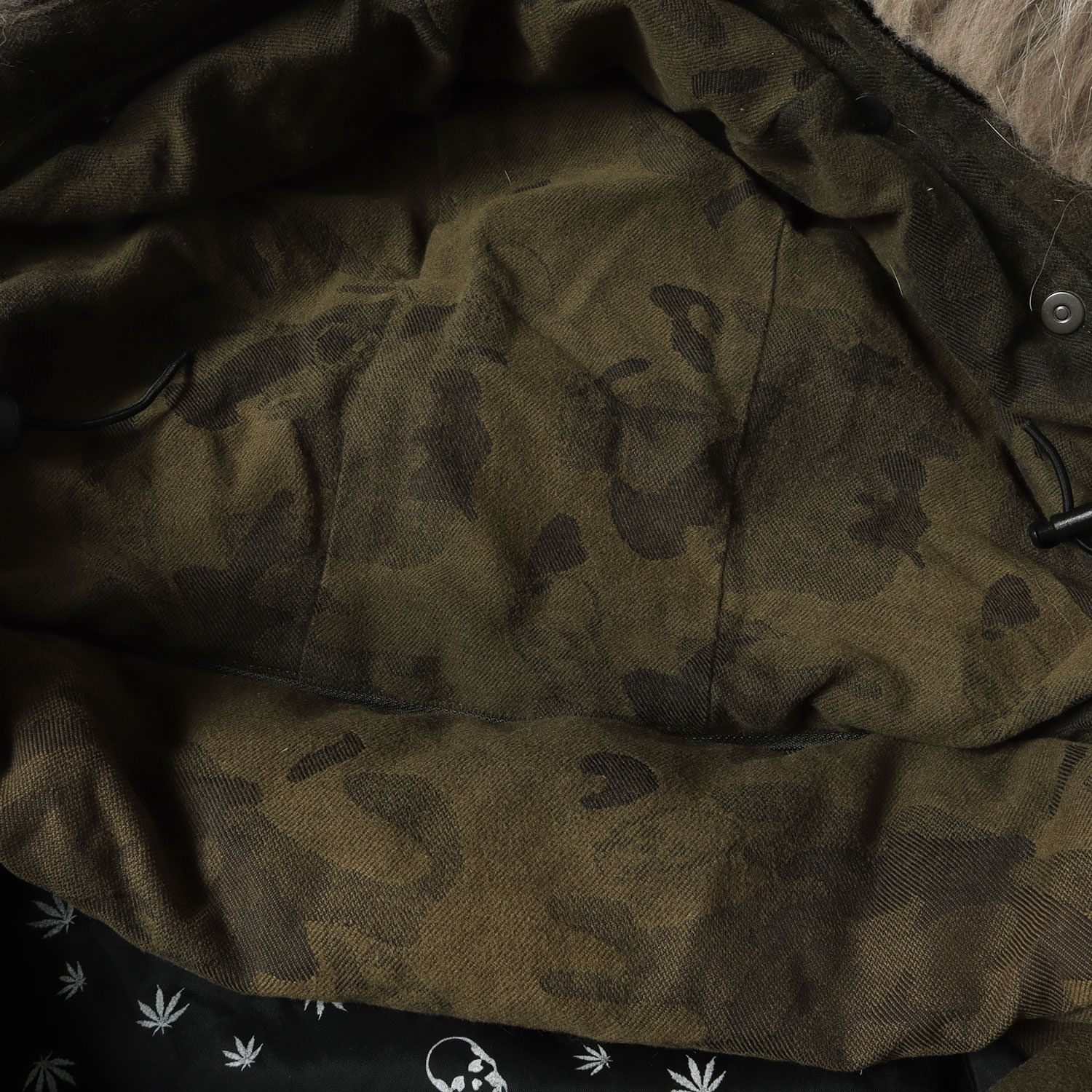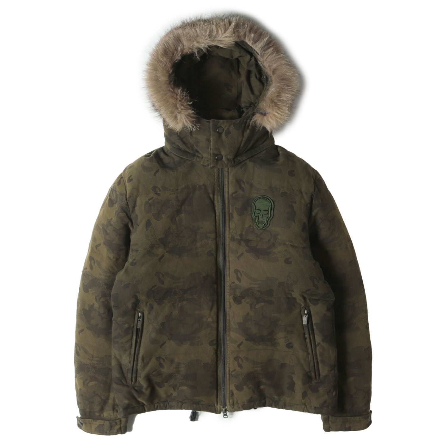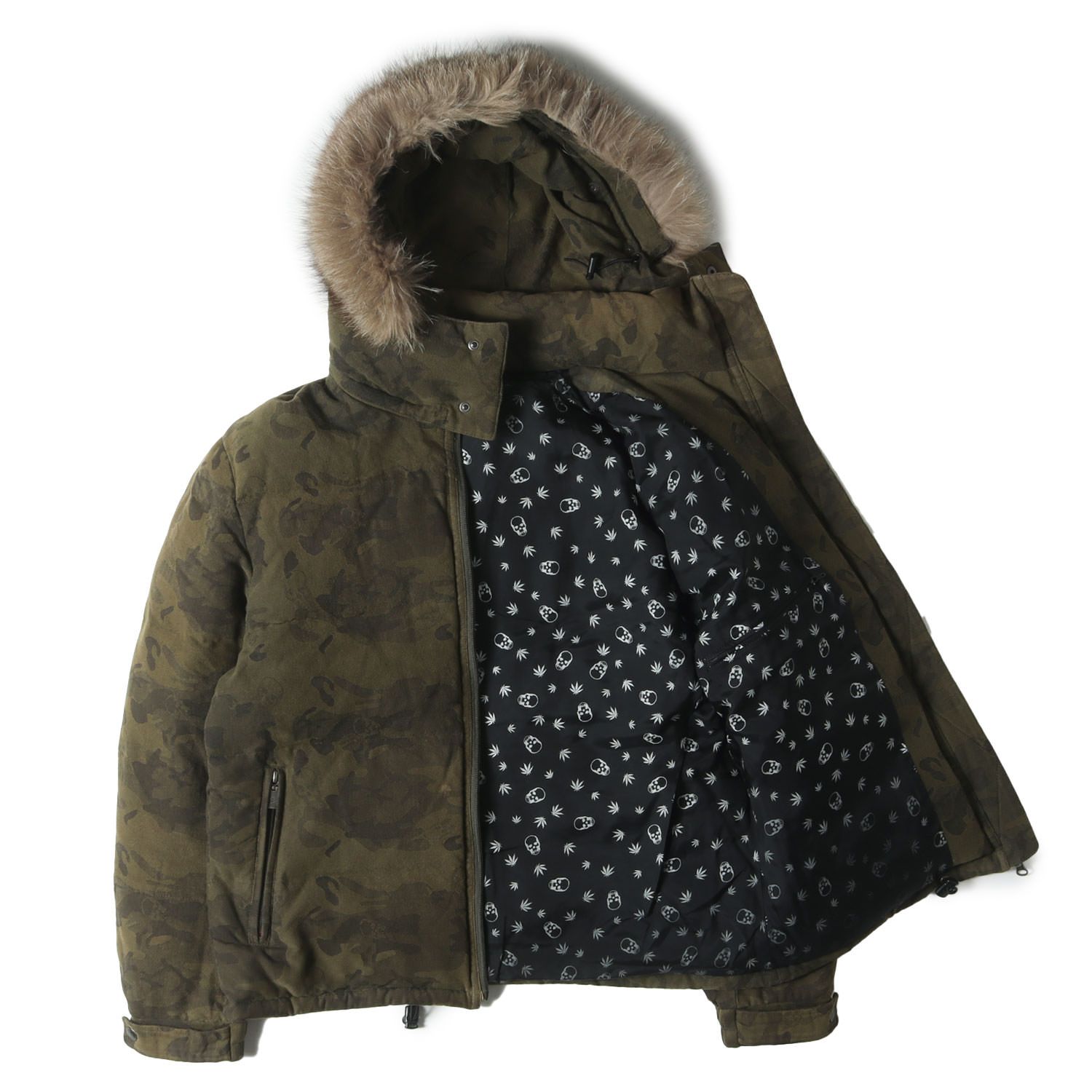 ジャガードカモ総柄のカシミヤウール生地を使用し、ダブルジップで仕上げたフーデッドダウンジャケットです。左胸に立体的なスカルフェイスワッペンをデザインしています。フードに付属したフォックスファー、裏地のモノグラム柄もポイントです。