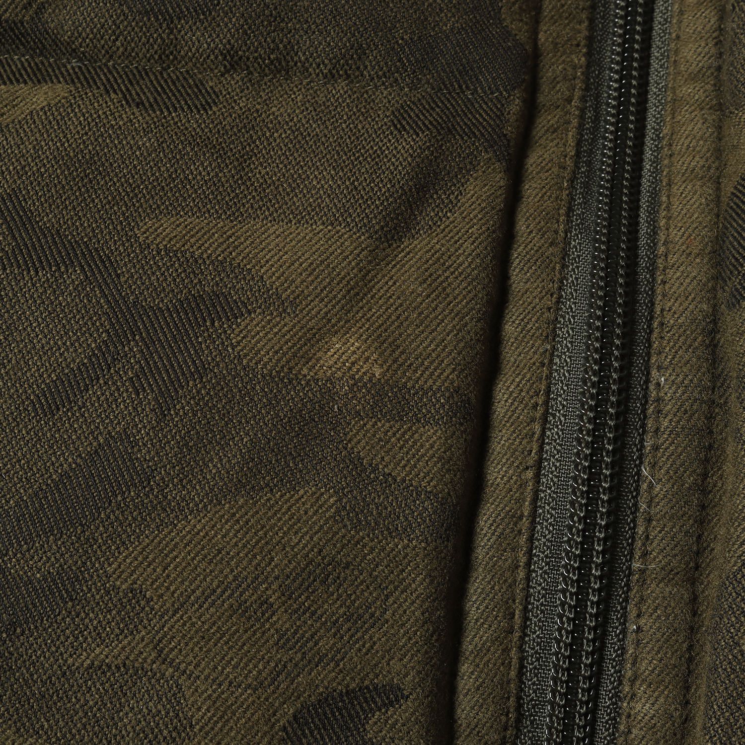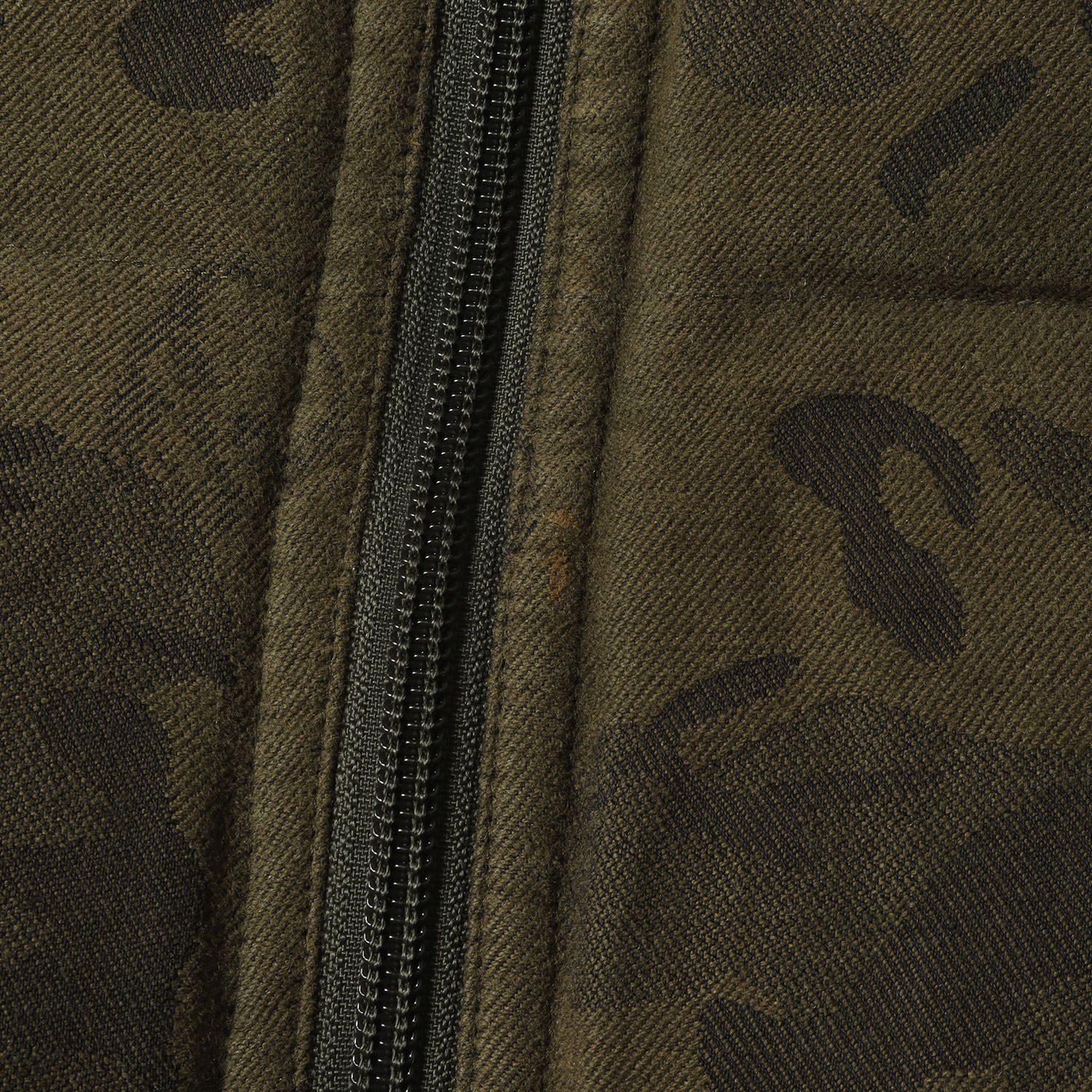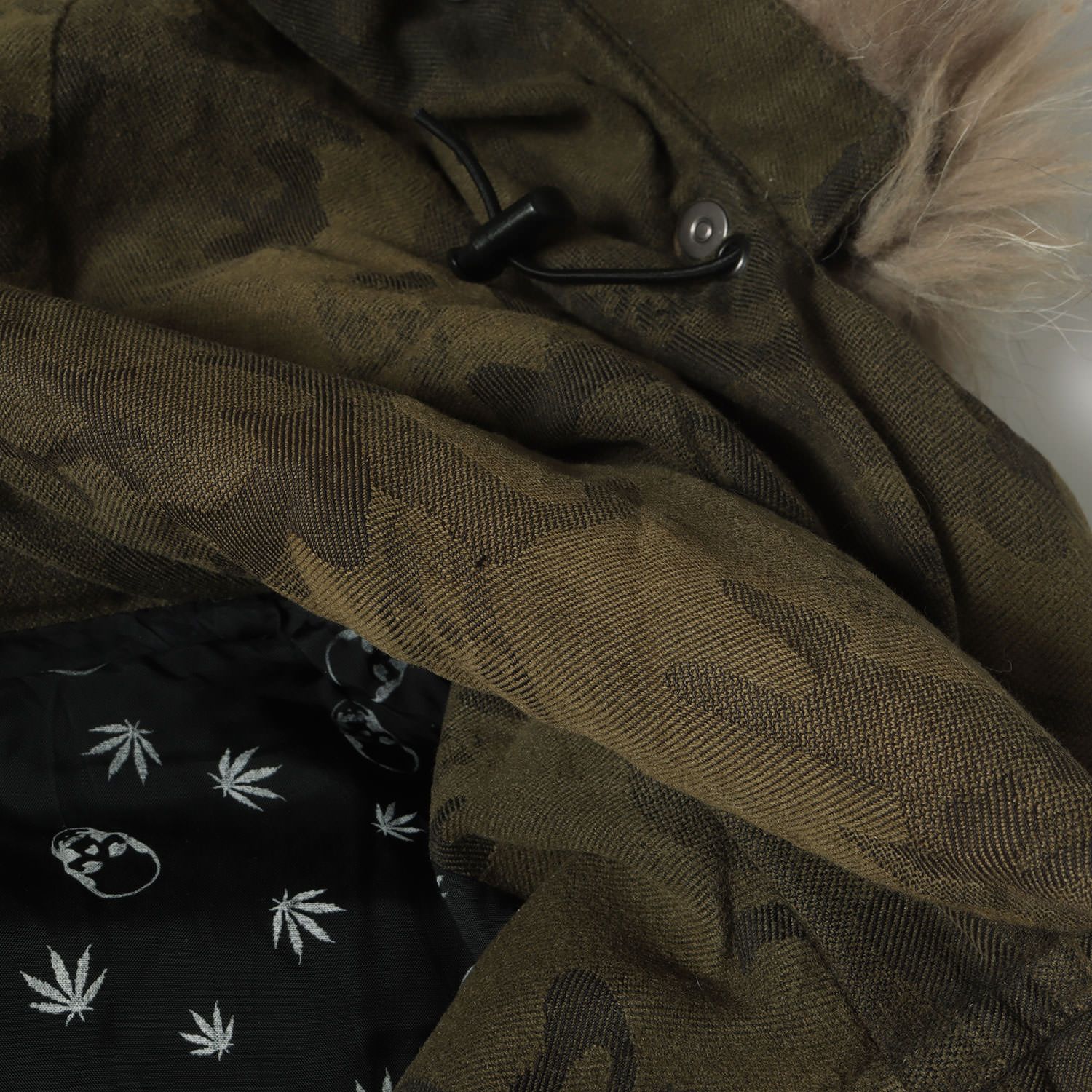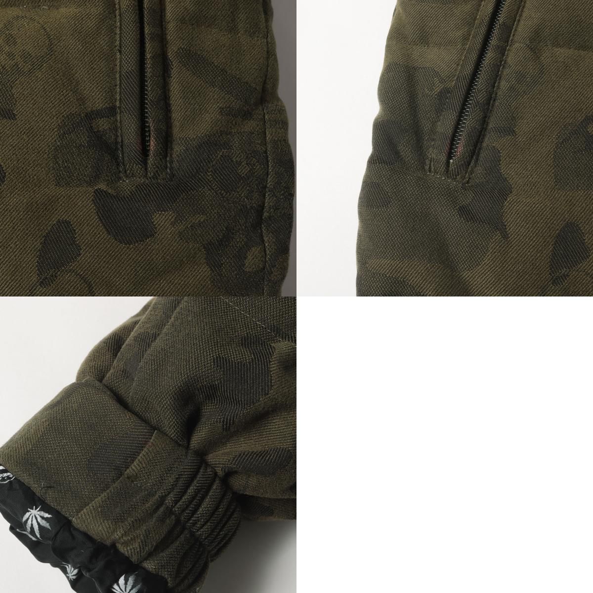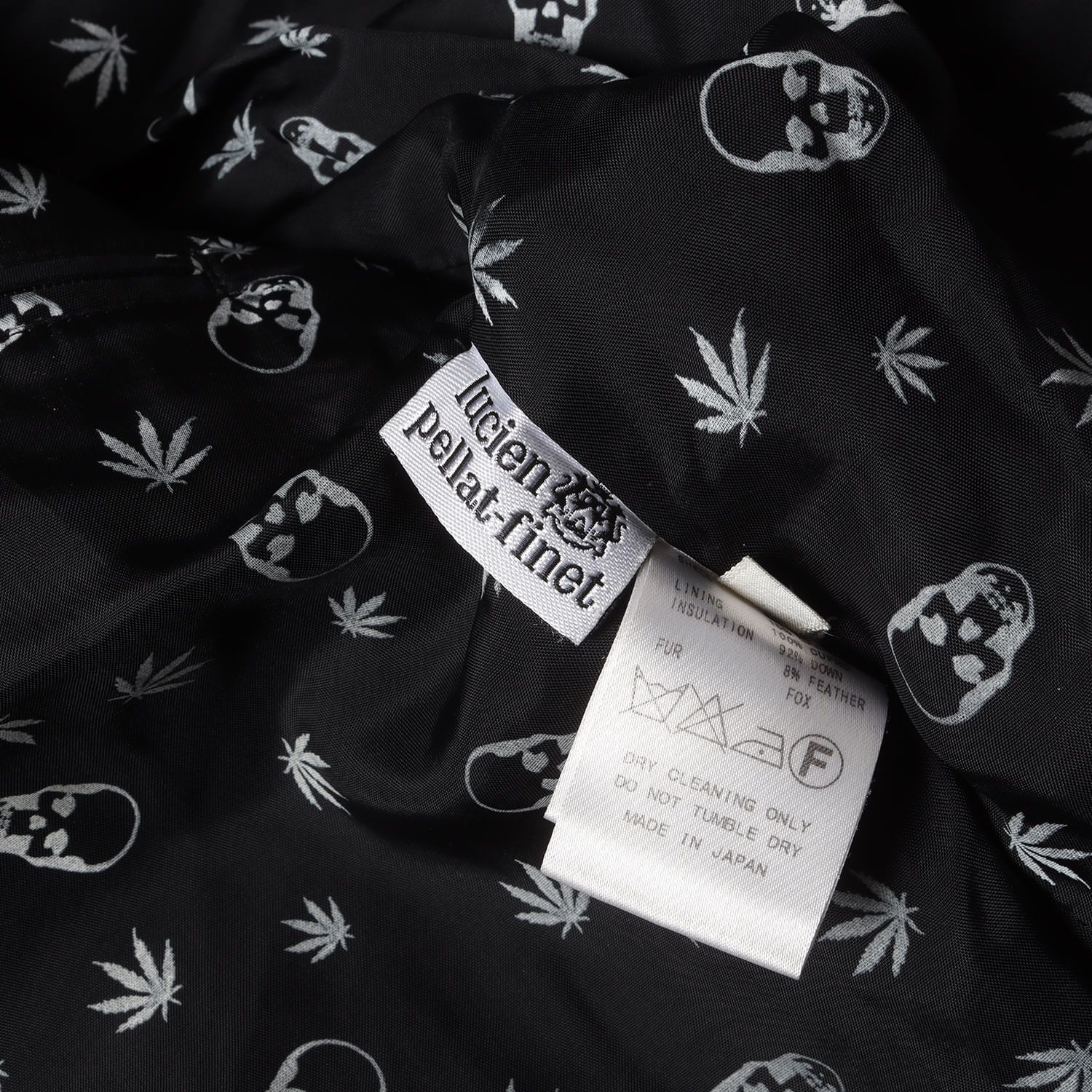 ジャガードカモ総柄のカシミヤウール生地を使用し、ダブルジップで仕上げたフーデッドダウンジャケットです。左胸に立体的なスカルフェイスワッペンをデザインしています。フードに付属したフォックスファー、裏地のモノグラム柄もポイントです。