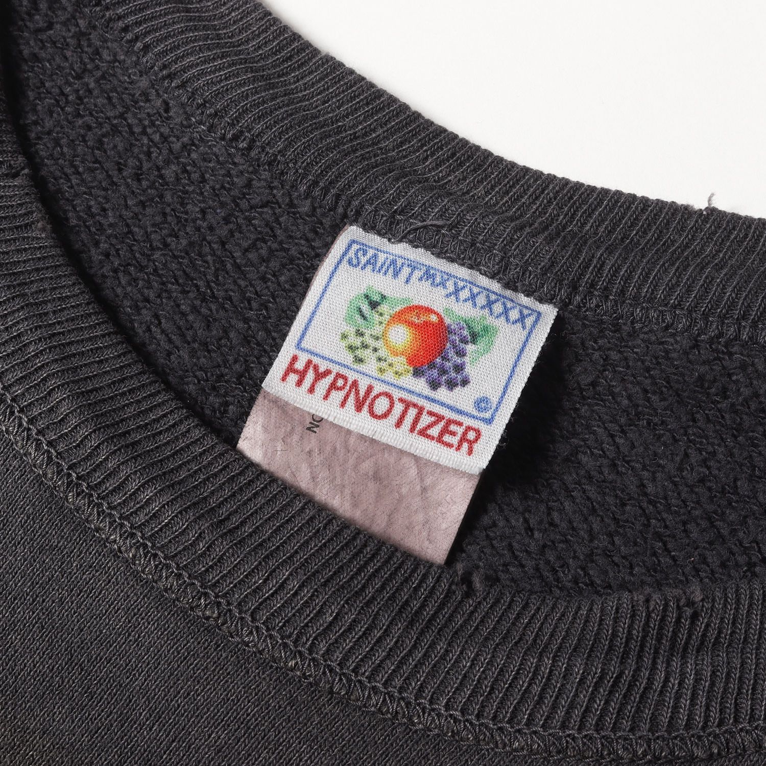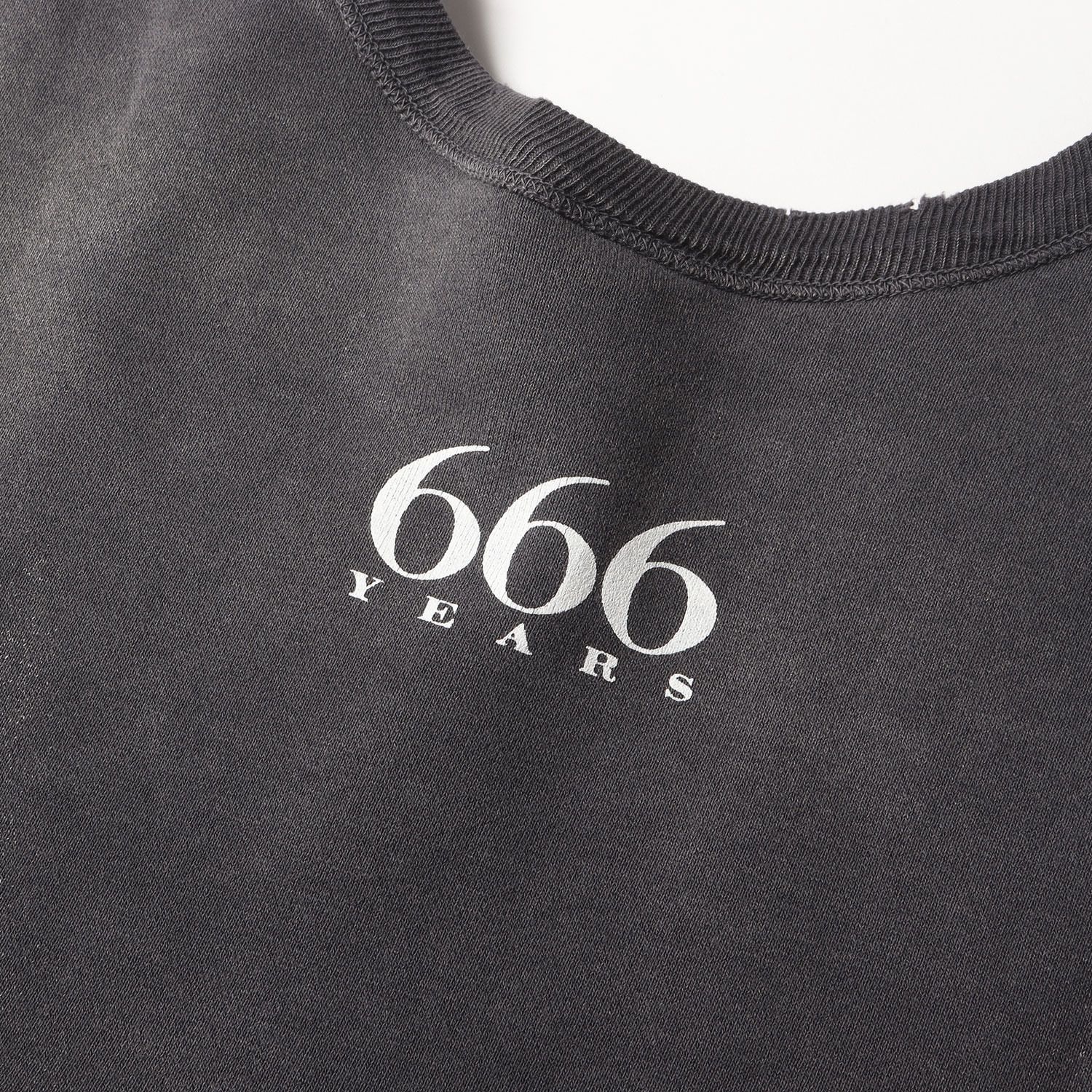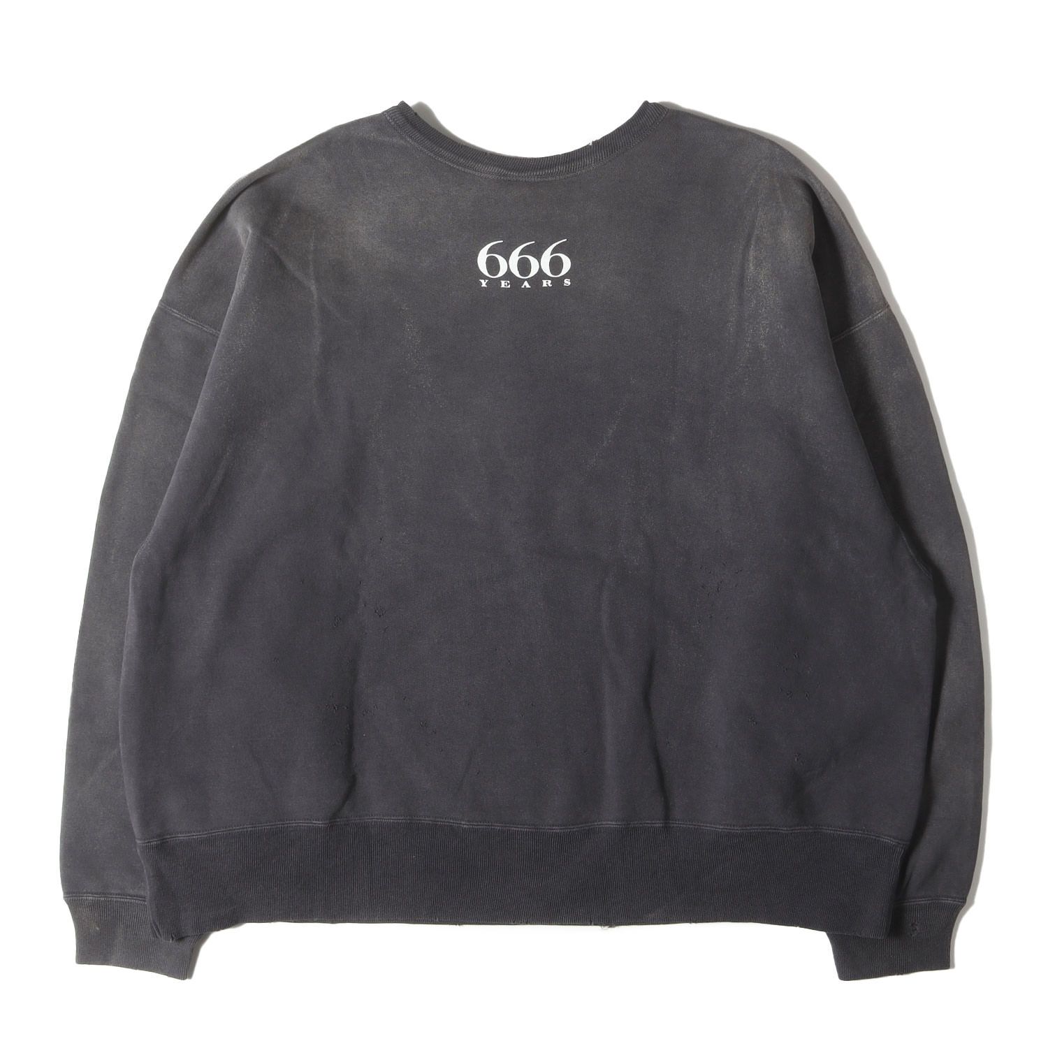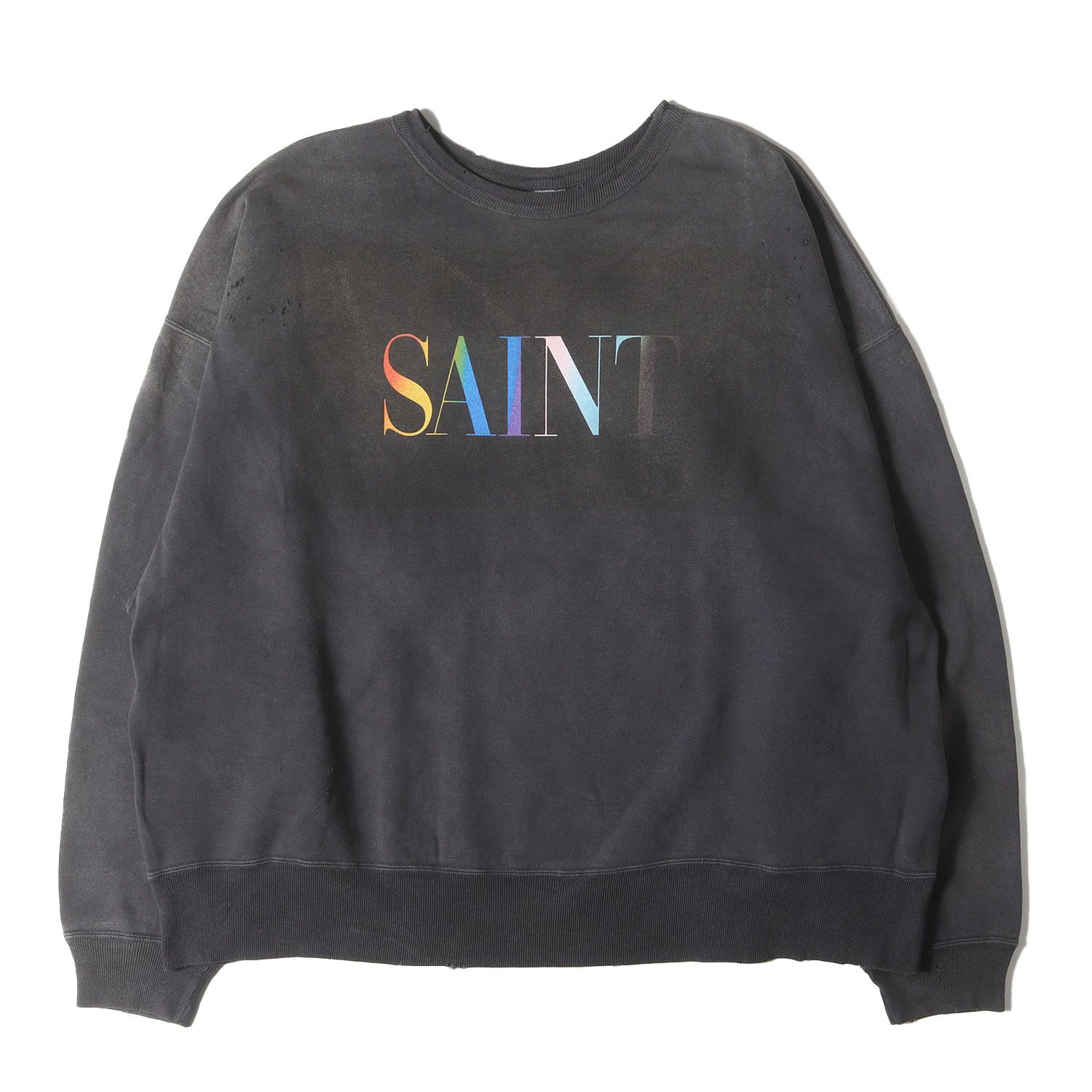 ハードなヴィンテージ、ダメージ、フェード加工を施したルーズシルエットのクルーネック裏毛スウェットです。フロントにレインボーカラーのブランドロゴがデザインされております。