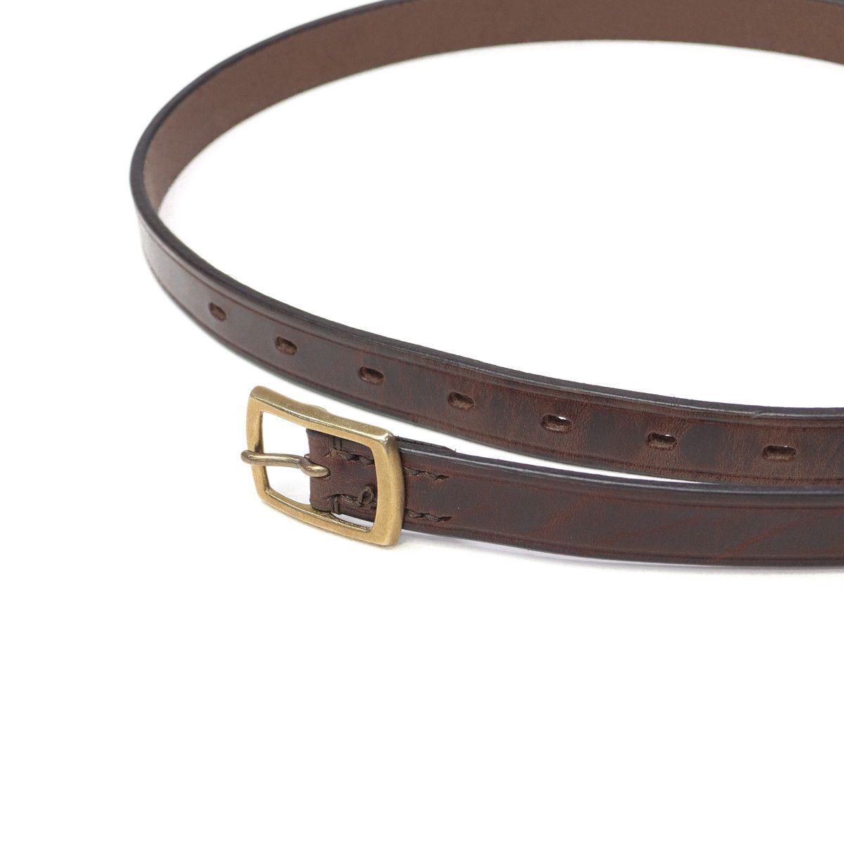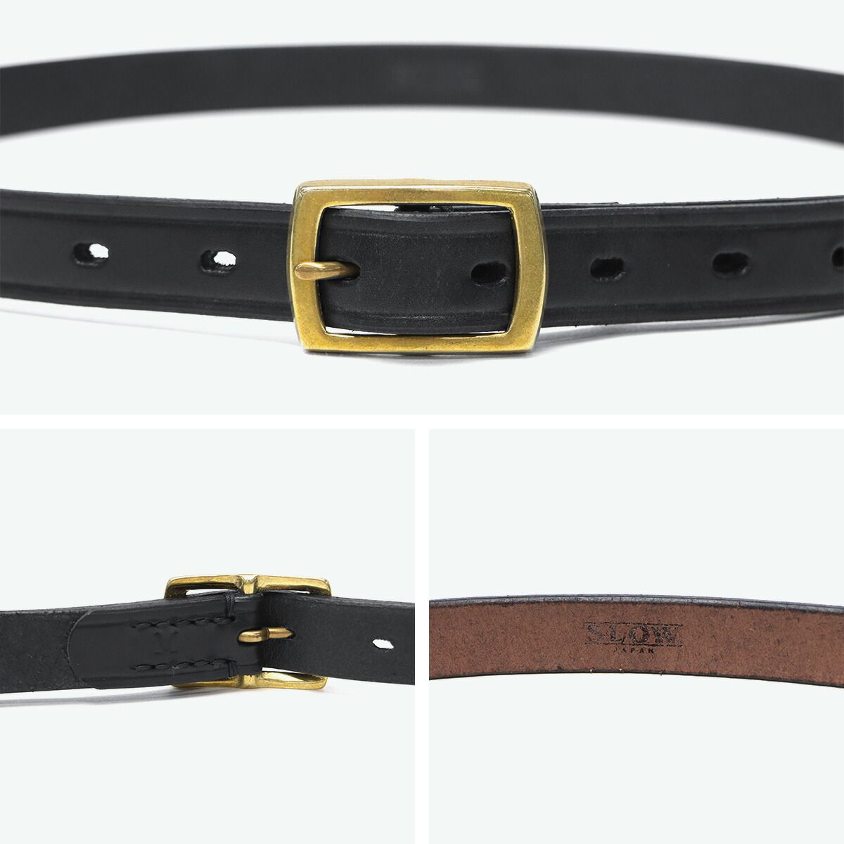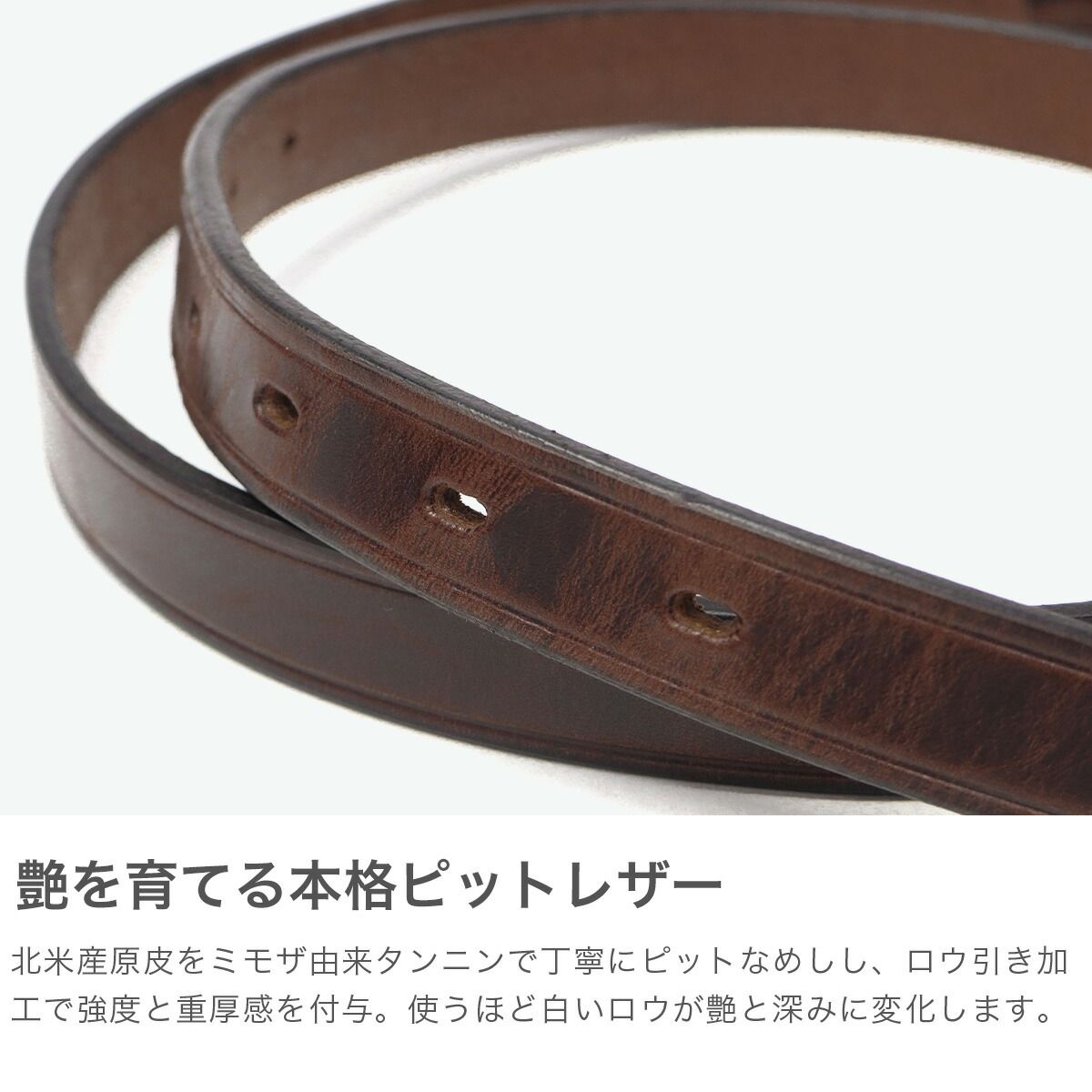 日露戦争後に軍隊の革靴やベルトなど軍事用品向けにスタートした歴史の長いタンナー『山陽社』製のフルベジタブルタンニングレザーを使用。仕上げにロウ引き加工を繰り返し施し、強度と重厚感をプラスしました。華奢なバックルとの組み合わせで上品な印象に仕上げており、太いベルトに抵抗がある方やきれいめなスタイルを好む方、また女性にもおすすめです。細身ながらも、上質なハービーレザーの質感はしっかりと伝わり、シンプルな装いにも程よいアクセントを加えてくれます。