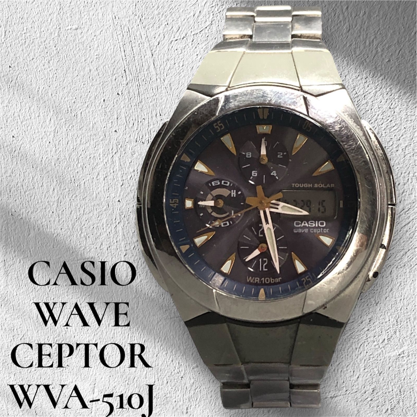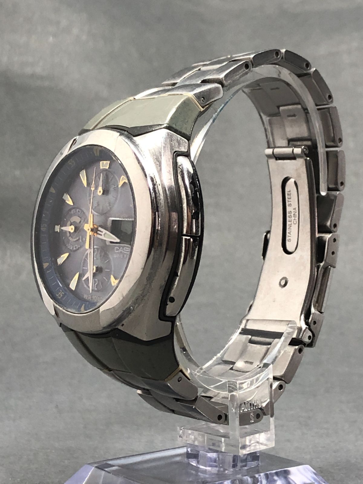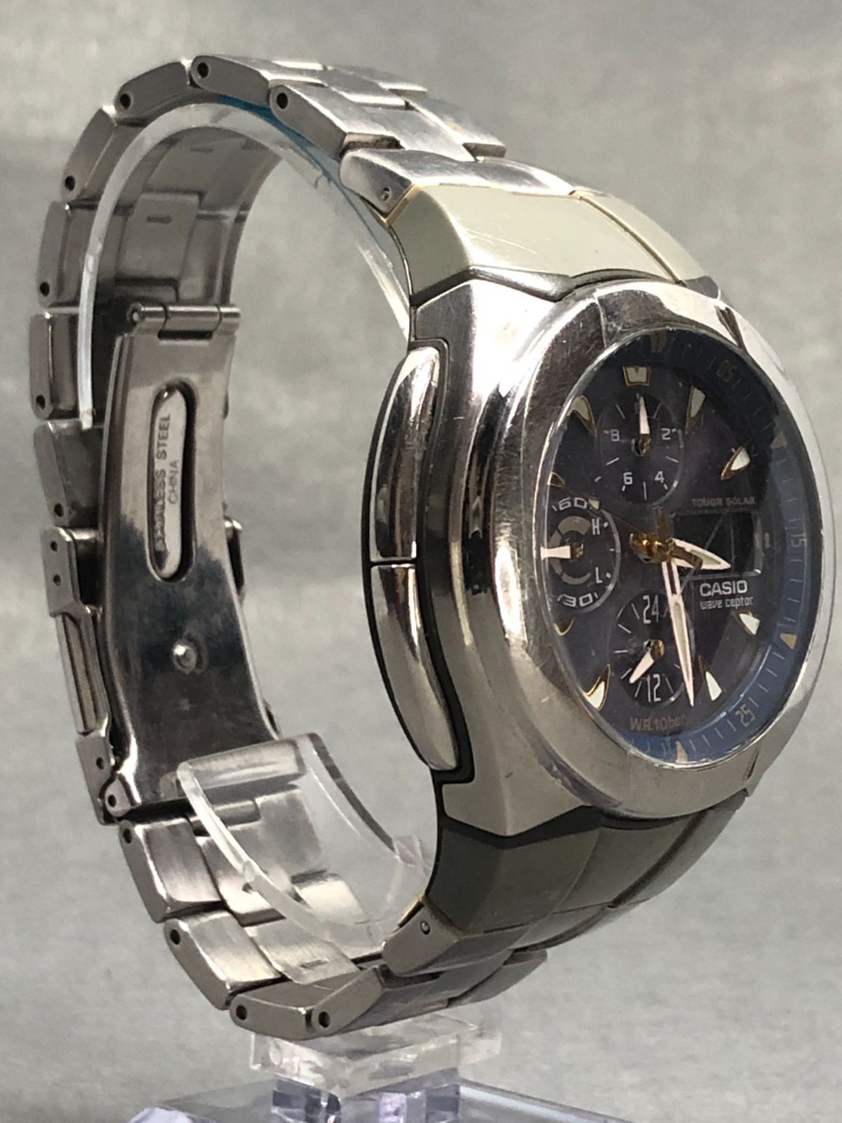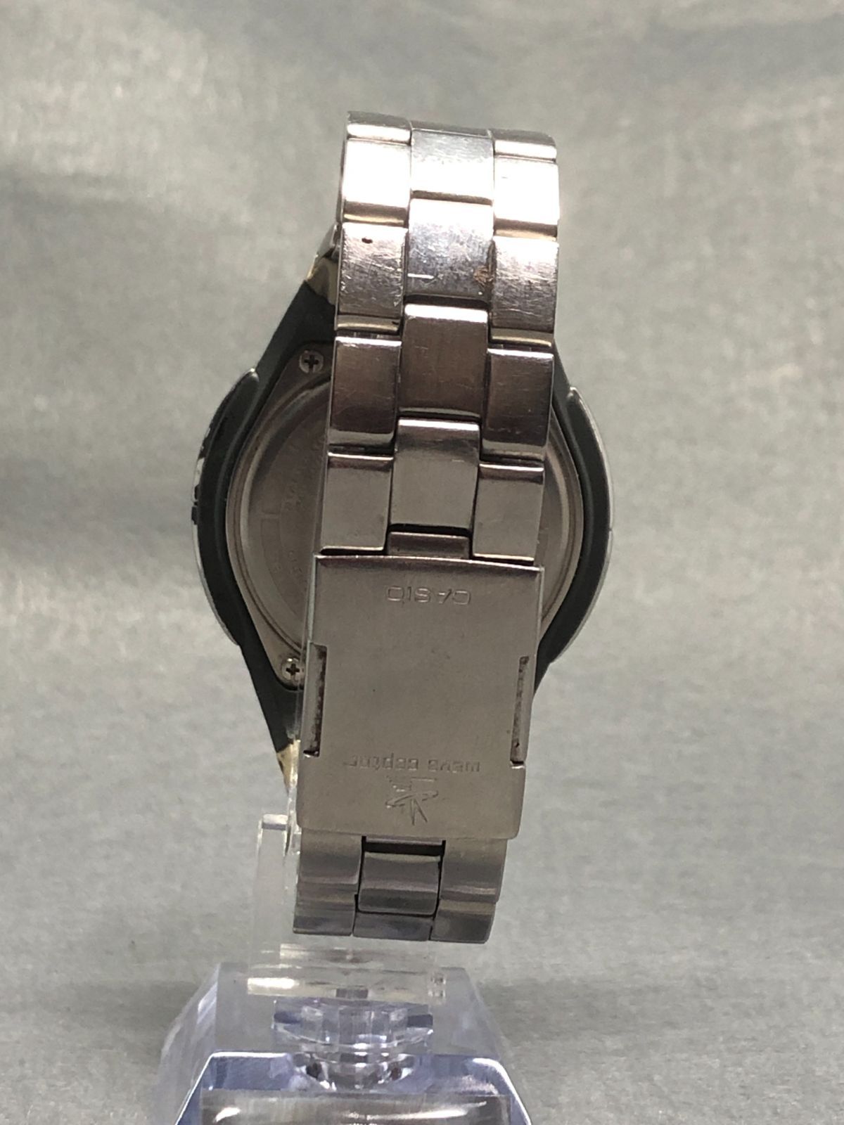 ダークブルーの文字盤とステンレススチール製のケースを持つCASIOのクォーツ腕時計、10気圧防水仕様。