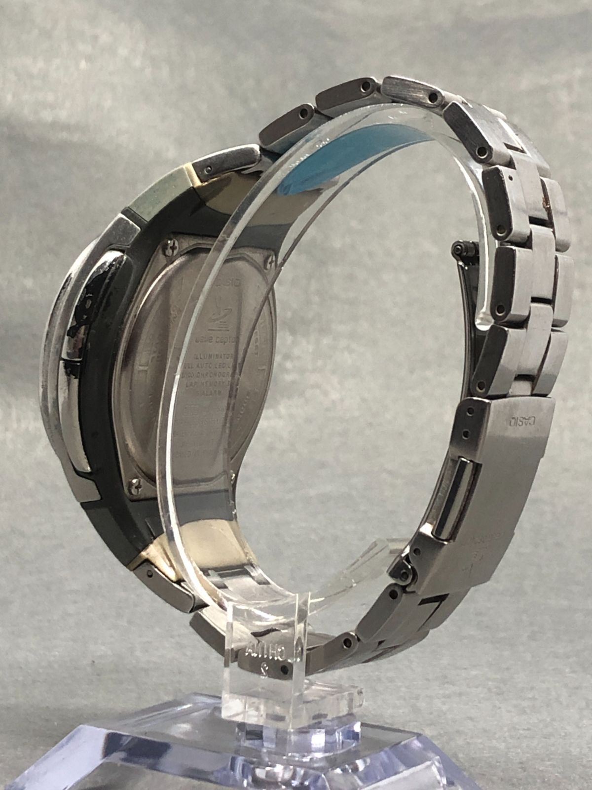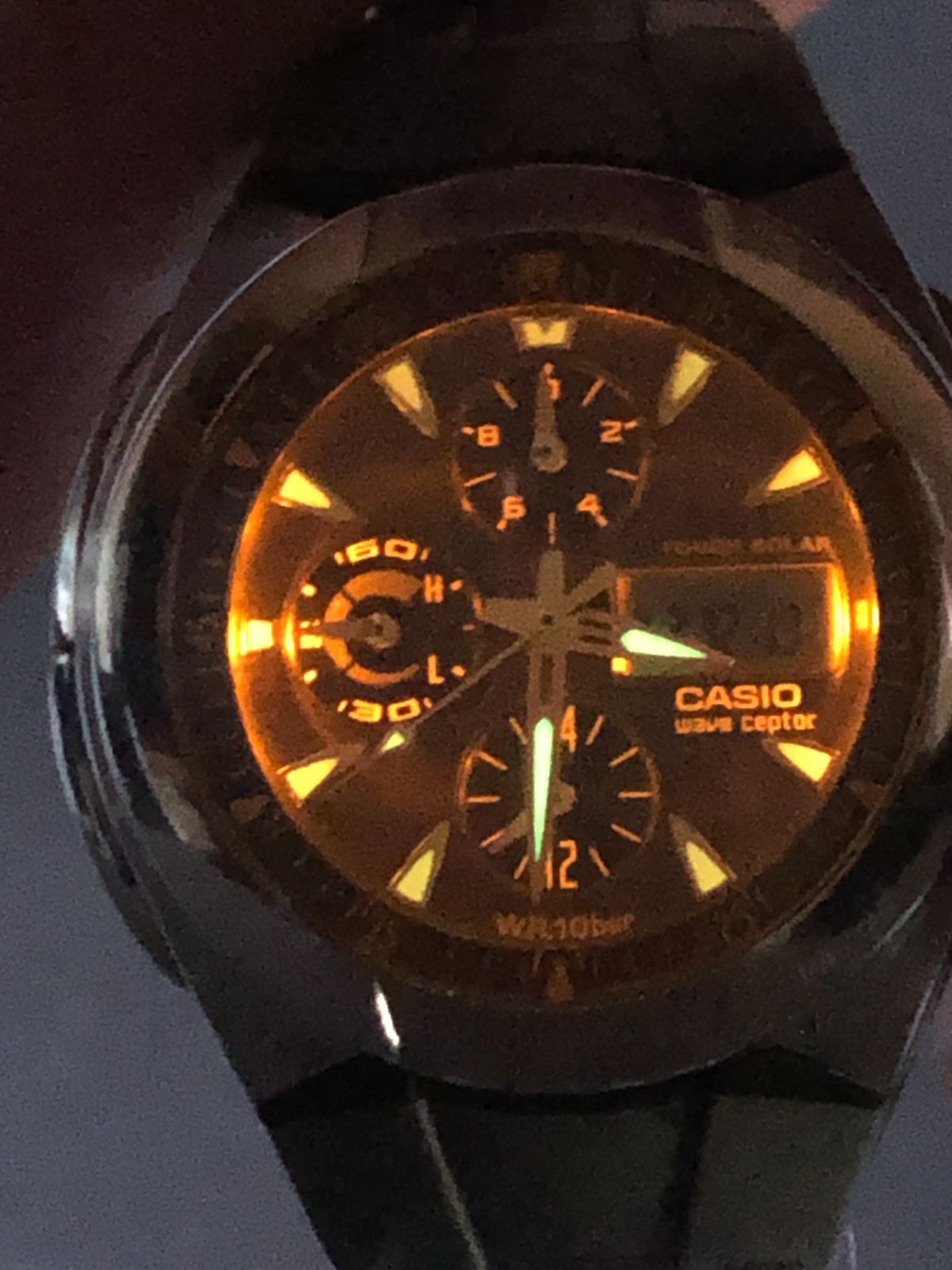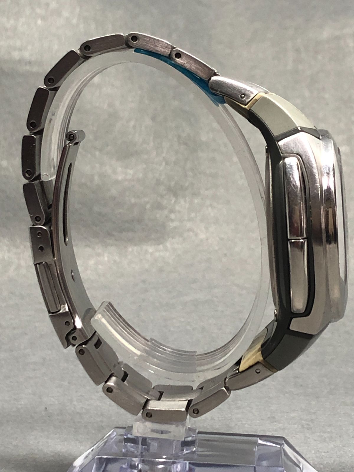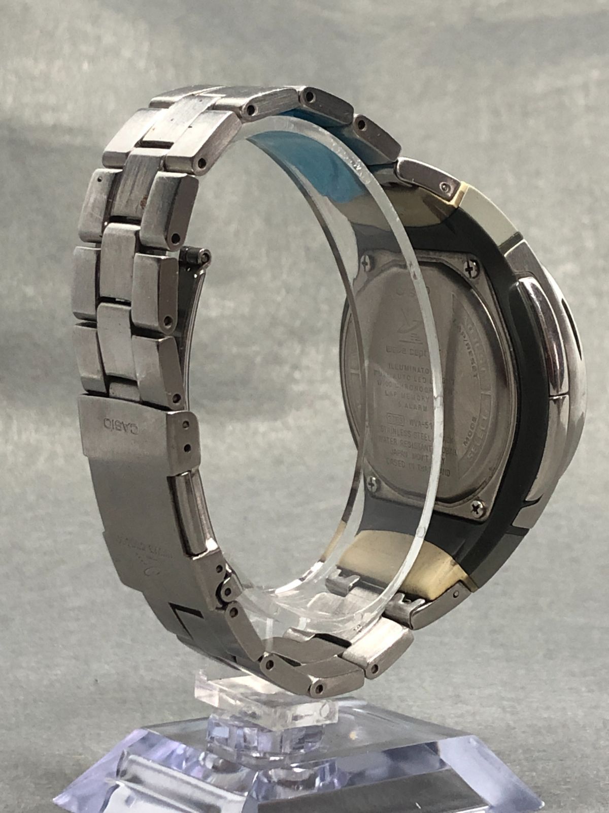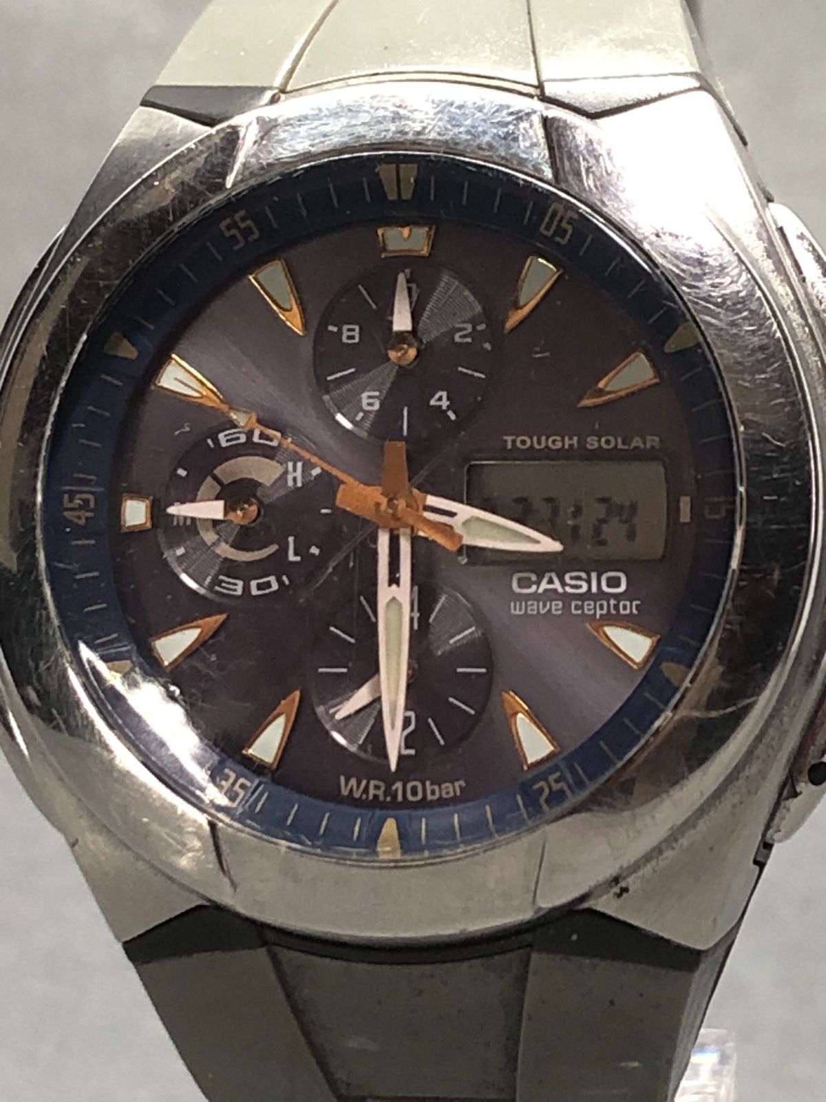 ダークブルーの文字盤とステンレススチール製のケースを持つCASIOのクォーツ腕時計、10気圧防水仕様。