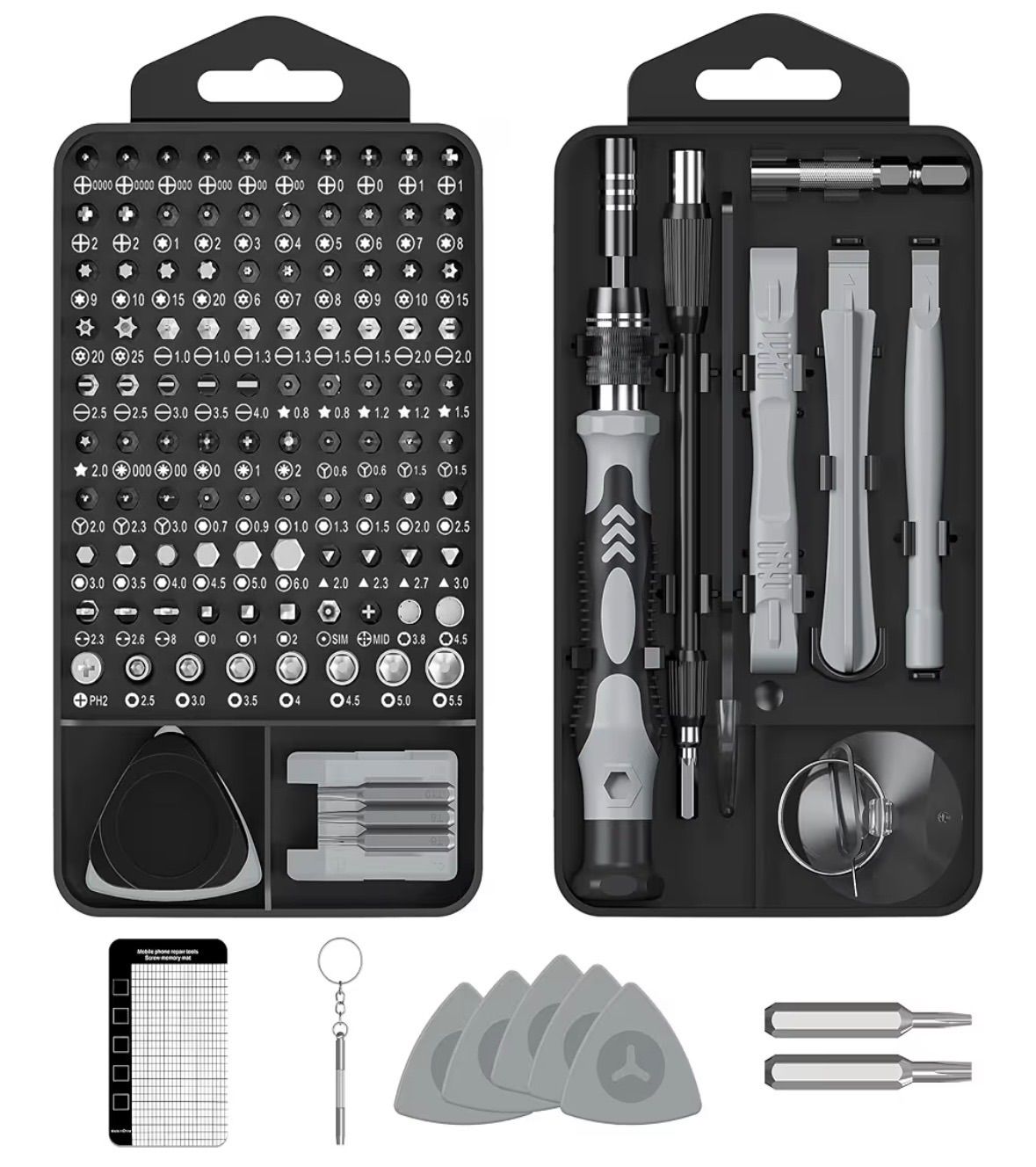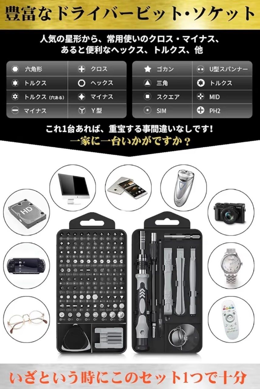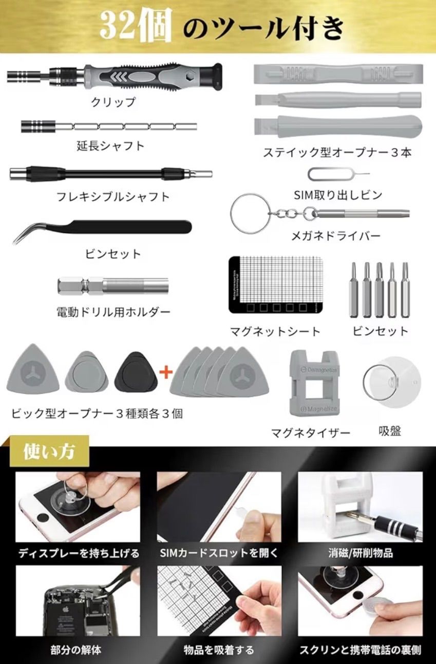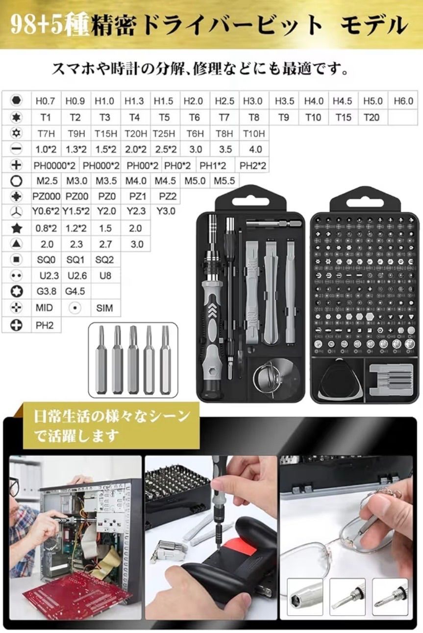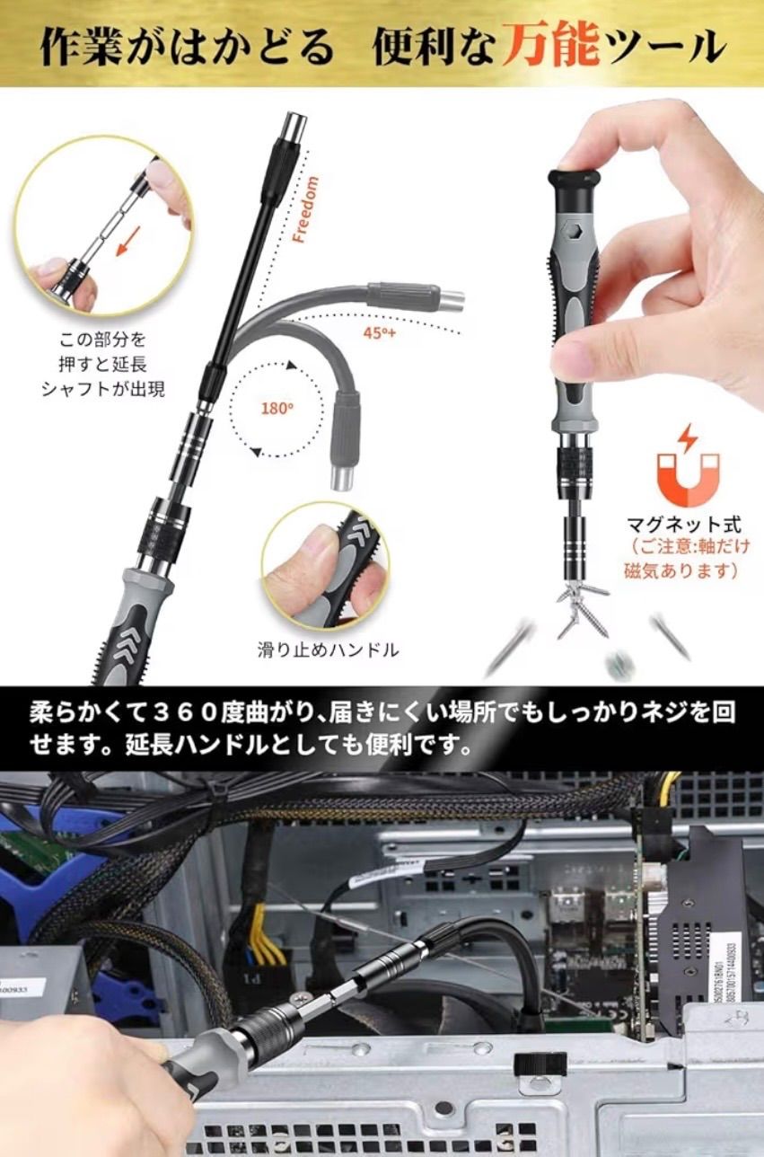 【130 in 1のドライバーキット】豊富なビット数で、これ1つで十分(switch可能)①103種精密ビット②グリップ*1③延長シャフト*1④フレキシブルシャフト*1⑤ピンセット*1⑥電動ドリル用ホルダー*1⑦吸着カップ*1⑧SIM取り出しピン*1⑨磁気シート(もう小ネジを探さなくて良い)*1⑩マグネタイザー*1⑪ケースオープナー*3⑫オープニングピック*14⑬収納ケースx1[ご注意:延長シャフトの位置-クリップの黒い部分を押して延長シャフトが出現!]