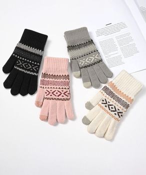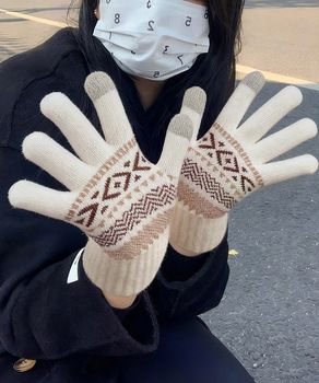 裏微起毛 暖かい手袋 レディース 北欧風 5本指ニットグローブ タッチパネル対応 ニット手袋 あったか 幾何学模様手袋冬毛糸手袋大人可愛い 防寒 防風てぶくろ 秋冬小物ギフト手袋
