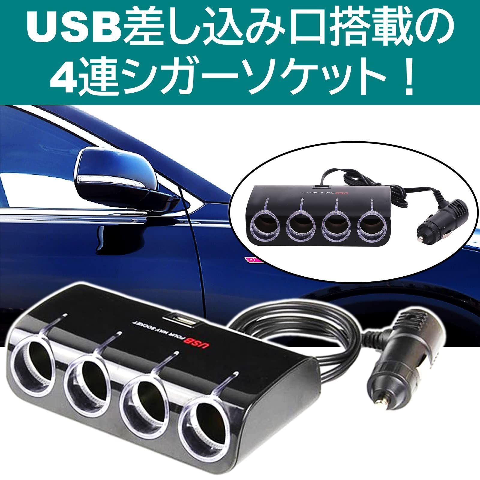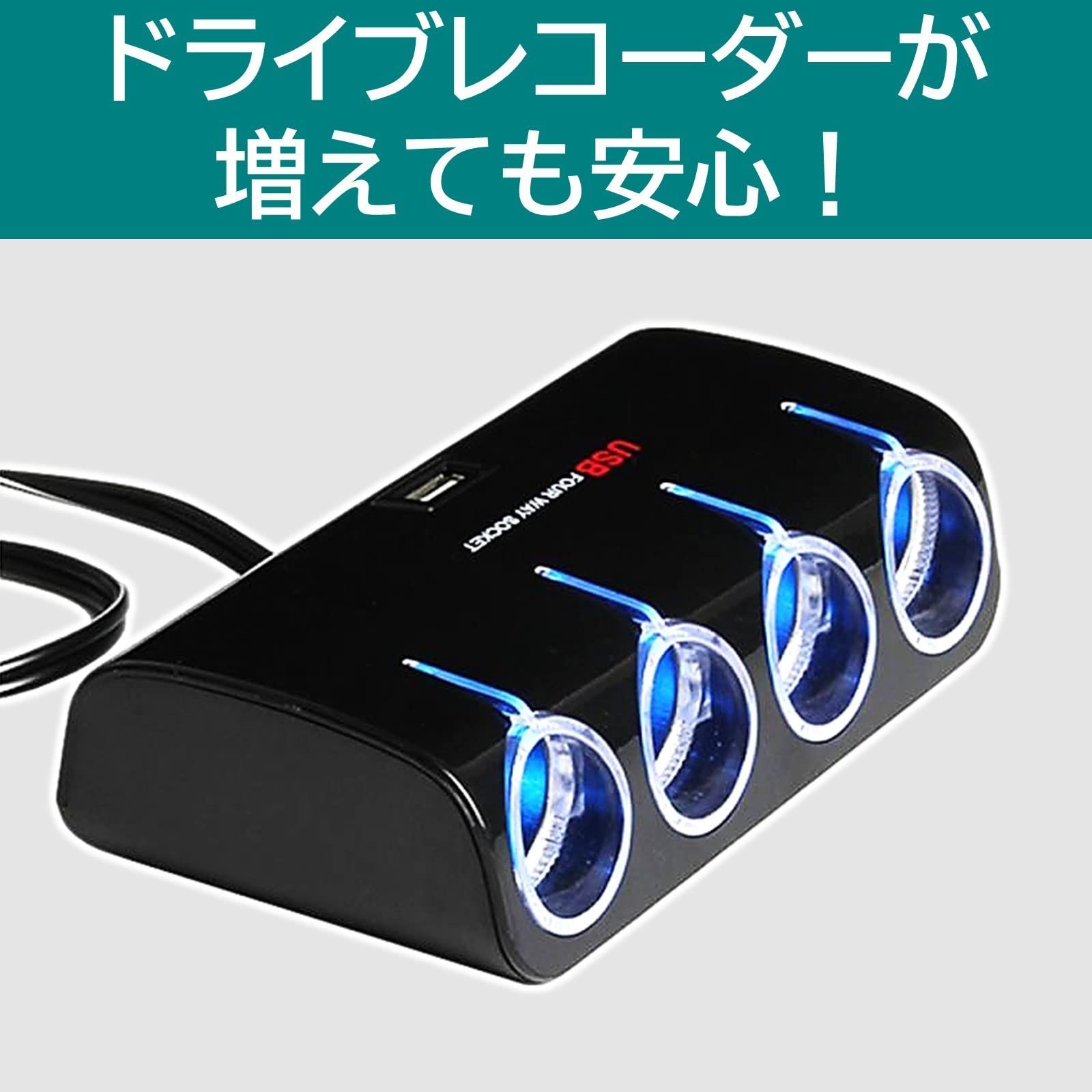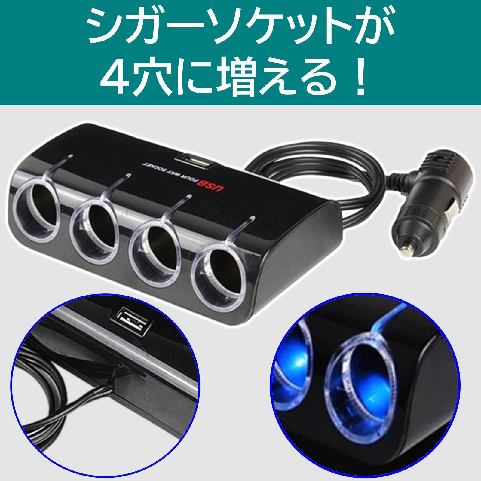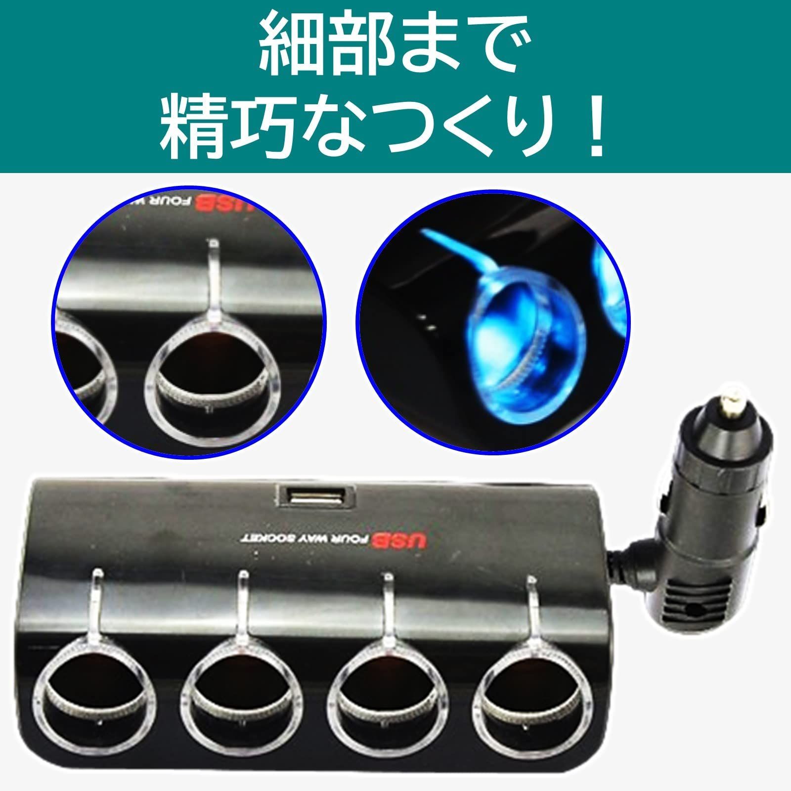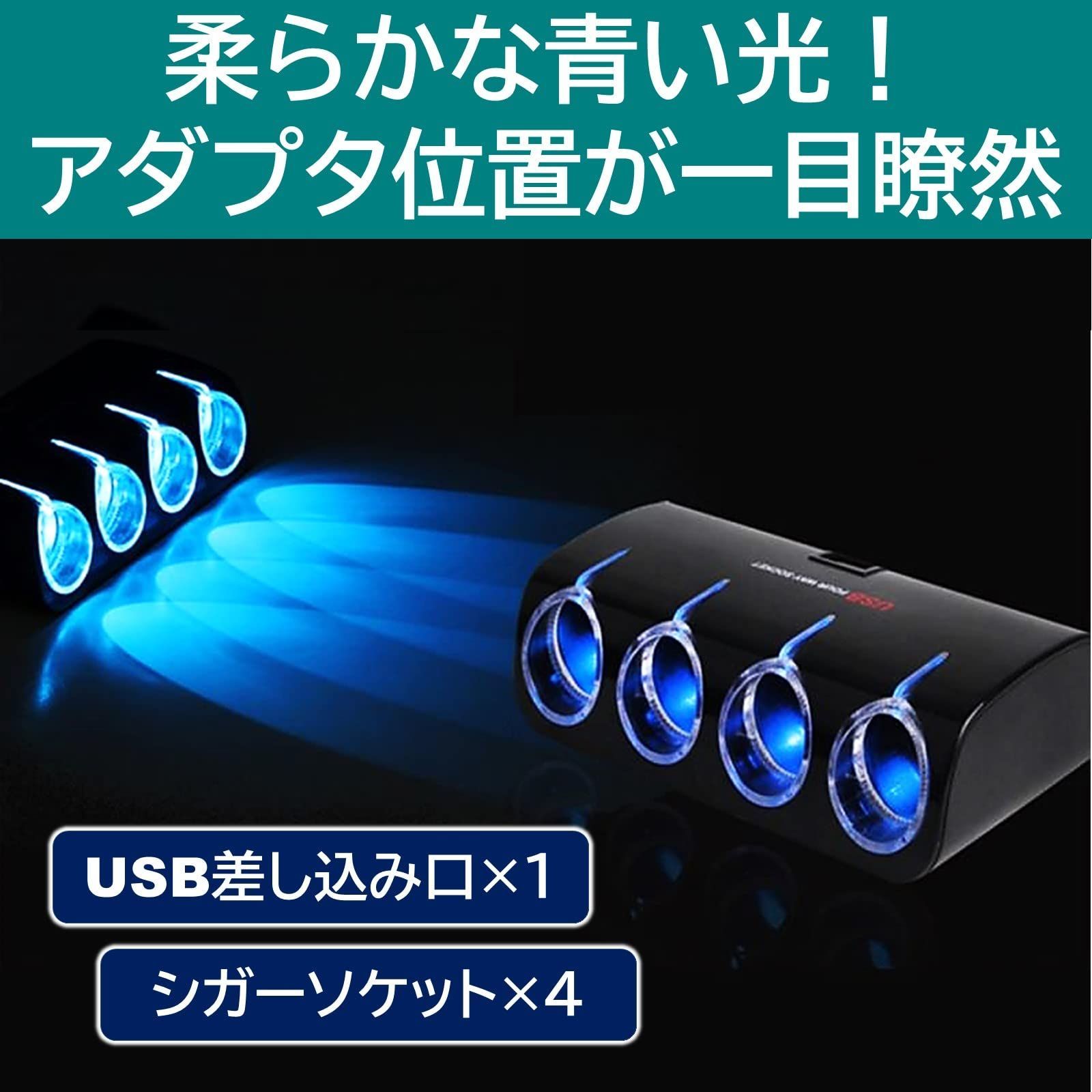 車内でお使いいただけるUSB差し込み口搭載の4連シガーソケット。通電中はブルーのLEDライトが点灯します。