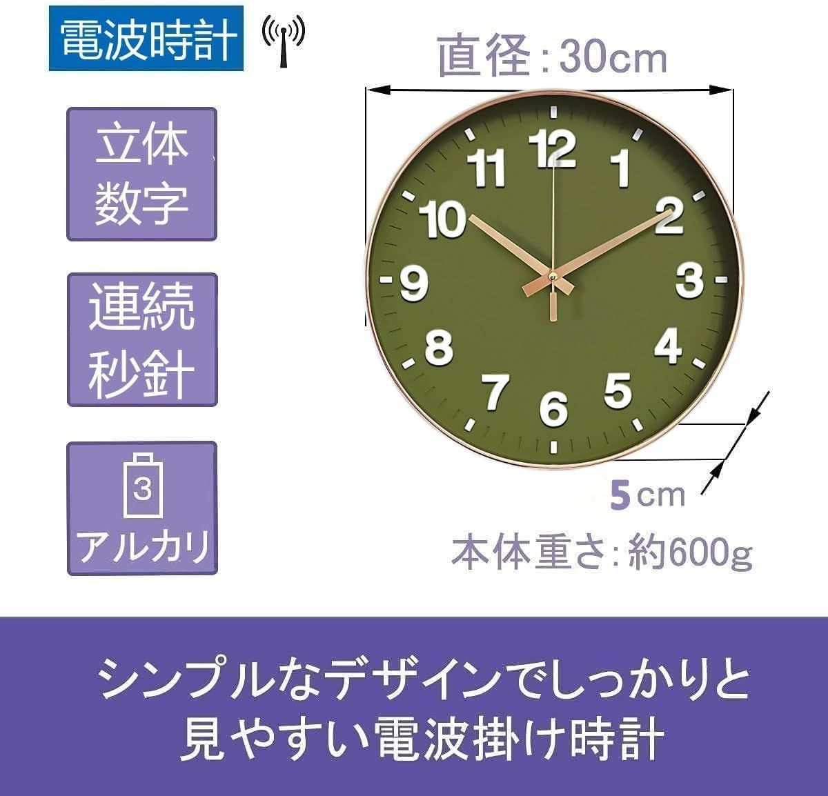 掛け時計 電波時計 静音 連続秒針 立体文字 おしゃれ DΦ30x3cm 壁掛け 北欧 wall clock(うすみどり)
