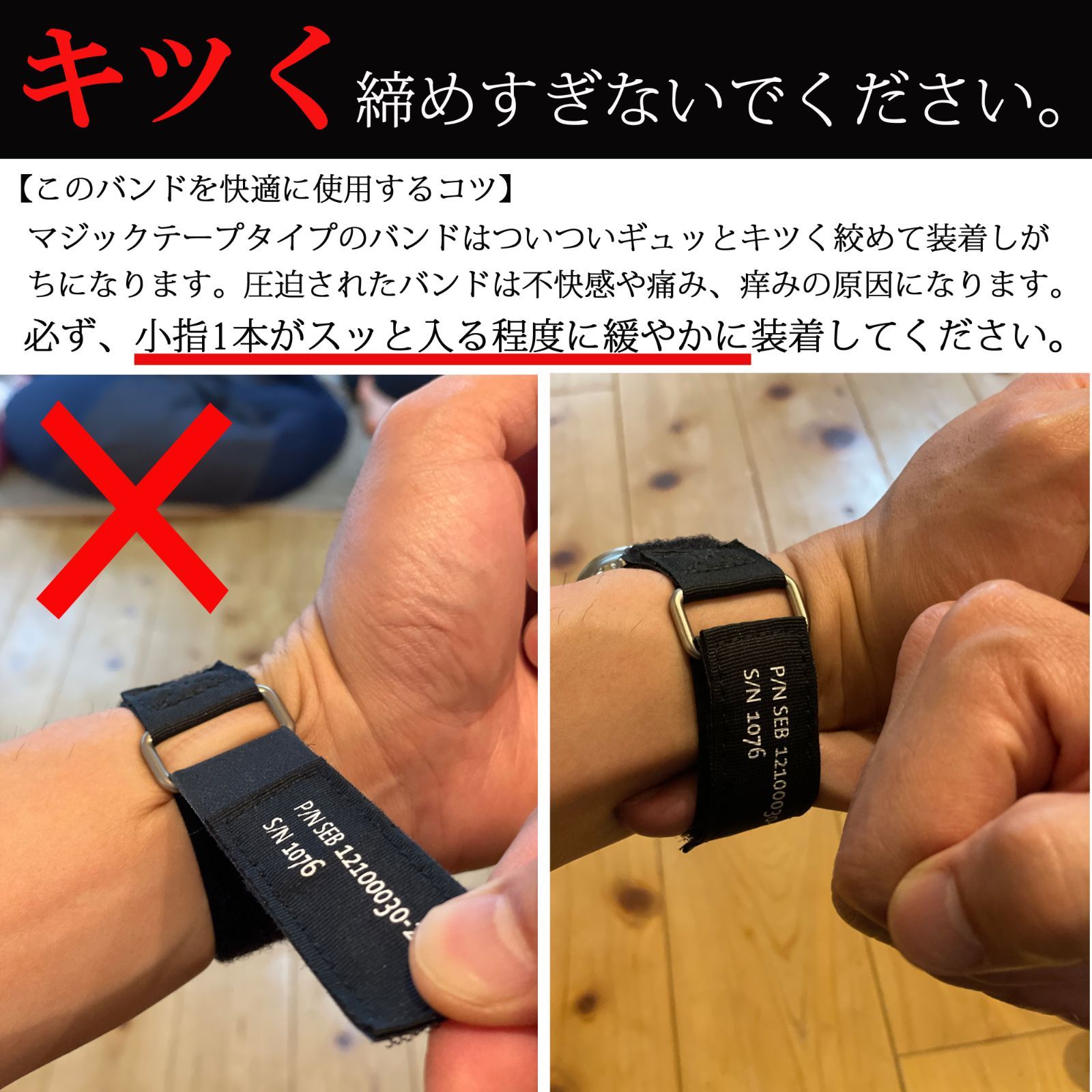 マジックテープタイプのバンドは無意識にキツく締めすぎてしまいます。キツク締めるとテープの縁が肌を刺激して不快感や痛み、痒みの原因になります。装着するときはできるだけ緩くフワッと締めるのをお勧めします。指がスッと一本入るくらいがおすすめです。