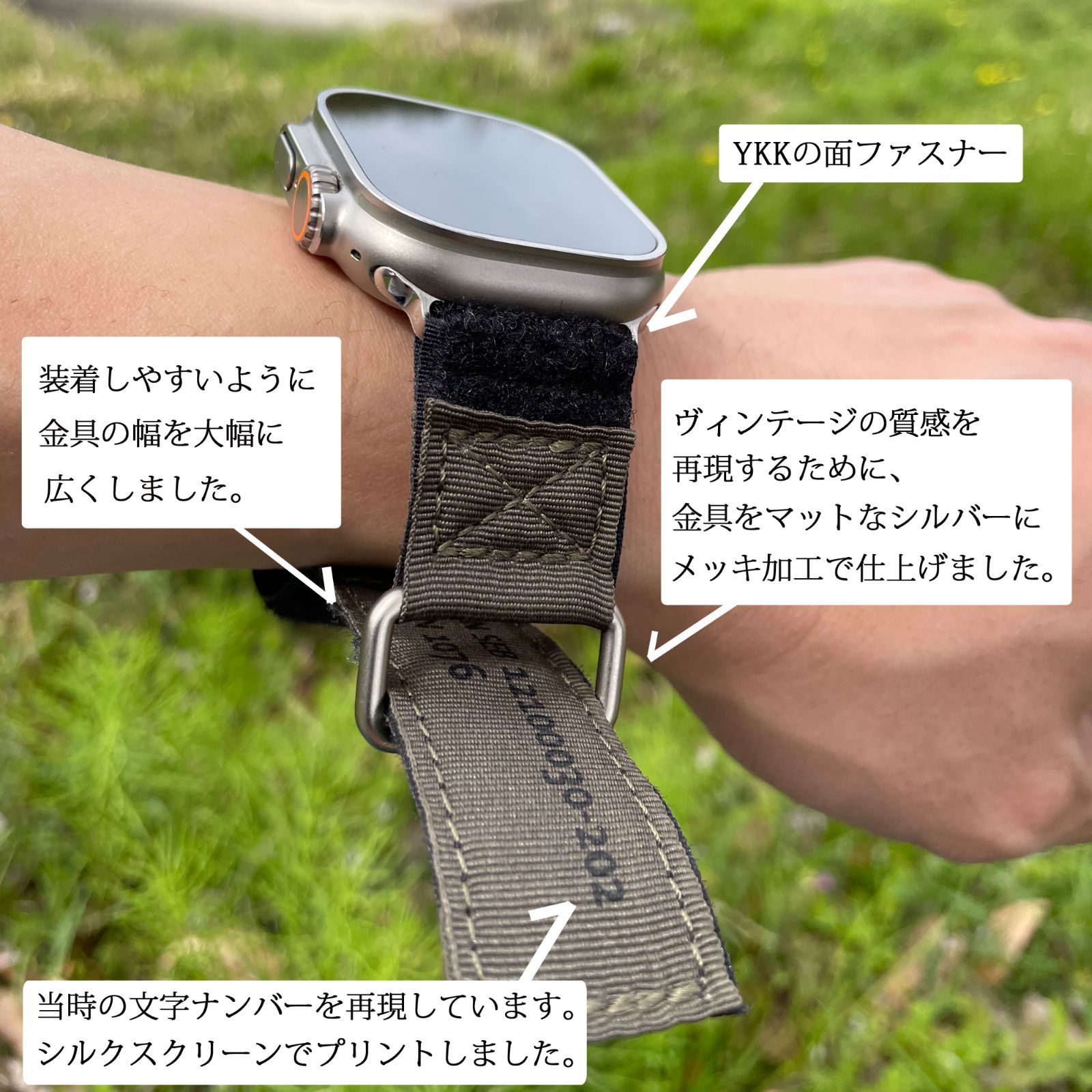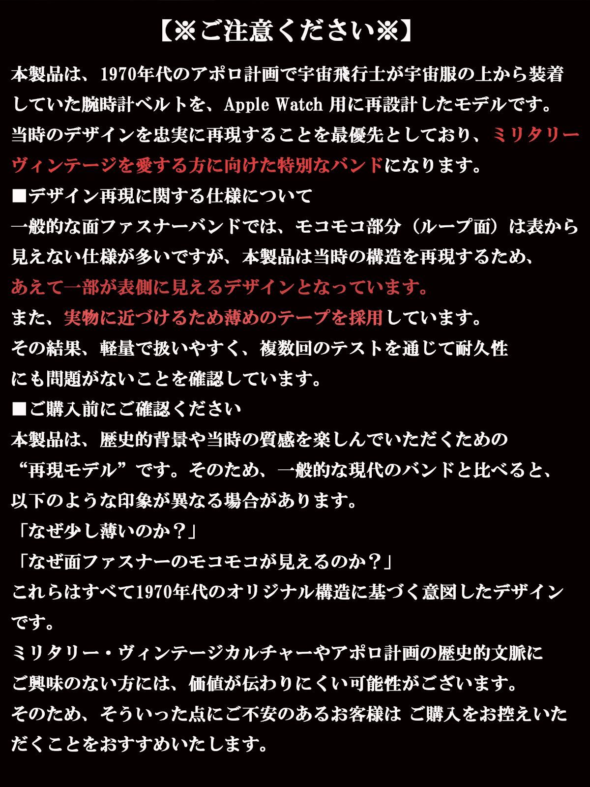 ✅【※※ご注意ください※※】このバンドは、1970年代のアポロ計画の宇宙飛行士が宇宙服の上からつけていた当時の腕時計ベルトを再現し、アップルウォッチ用に改良しデザインしました。当時のアポロの宇宙飛行士と同じデザインのバンドを付けるということに価値を見出していただけるヴィンテージ愛好家に向けてのバンドです。装着感や機能性ではなく当時のデザインを復刻(再現)することを第一優先しているので、あえてファスナーのモコモコ部位が一部表側から見えるデザインになります。そして、当時の薄いテープを、あえてそのまま復刻しているのでテープが薄い印象になります。その分軽いという利点もあります。ご理解ご了承の上でご購入下さい。