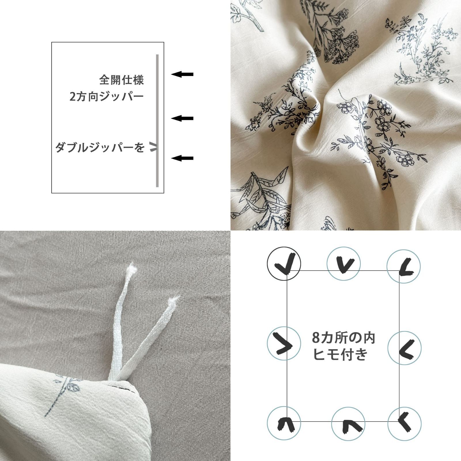 心を込めた設計:枕カバー:合わせ式。掛ふとんカバー:片側全開仕様と良いダブルジッパーを採用、スムーズな開閉と出し入れを実現、8カ所の内ヒモ付きでズレにくい、ボックスシーツ:全周ゴム付き、和洋兼用。