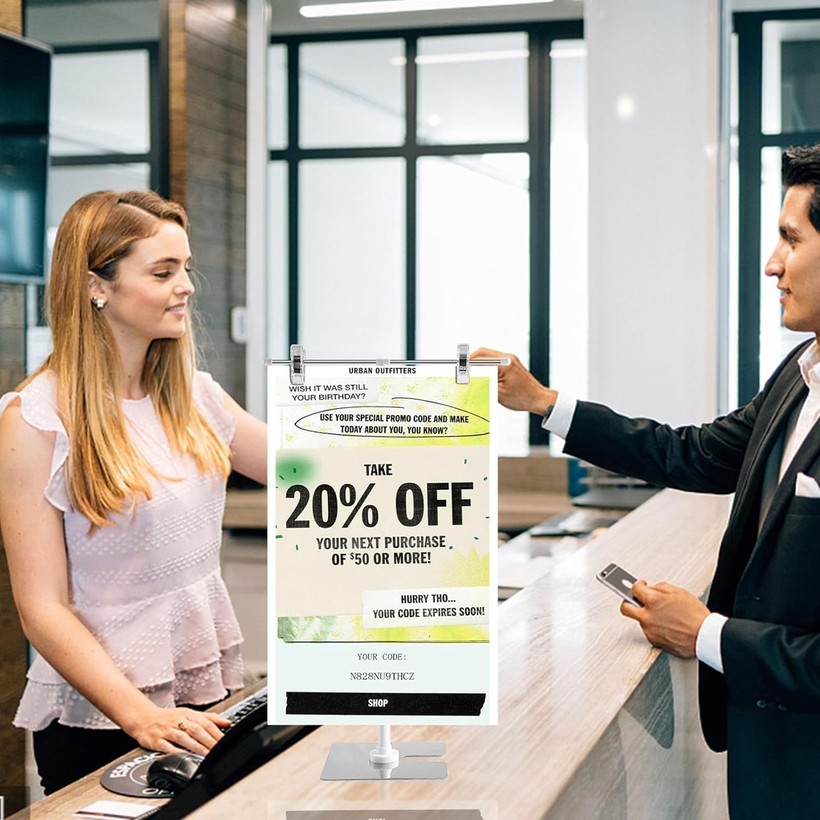 【伸縮調整可能】ポスタースタンドの高さは20-90cmまで伸縮調整可能です。両側の透明なクリップはポスターの大きさ(A2/A3/A4/B2/B3/B4)に合わせて調整幅約27cmで左右にスライドして調整可能です。