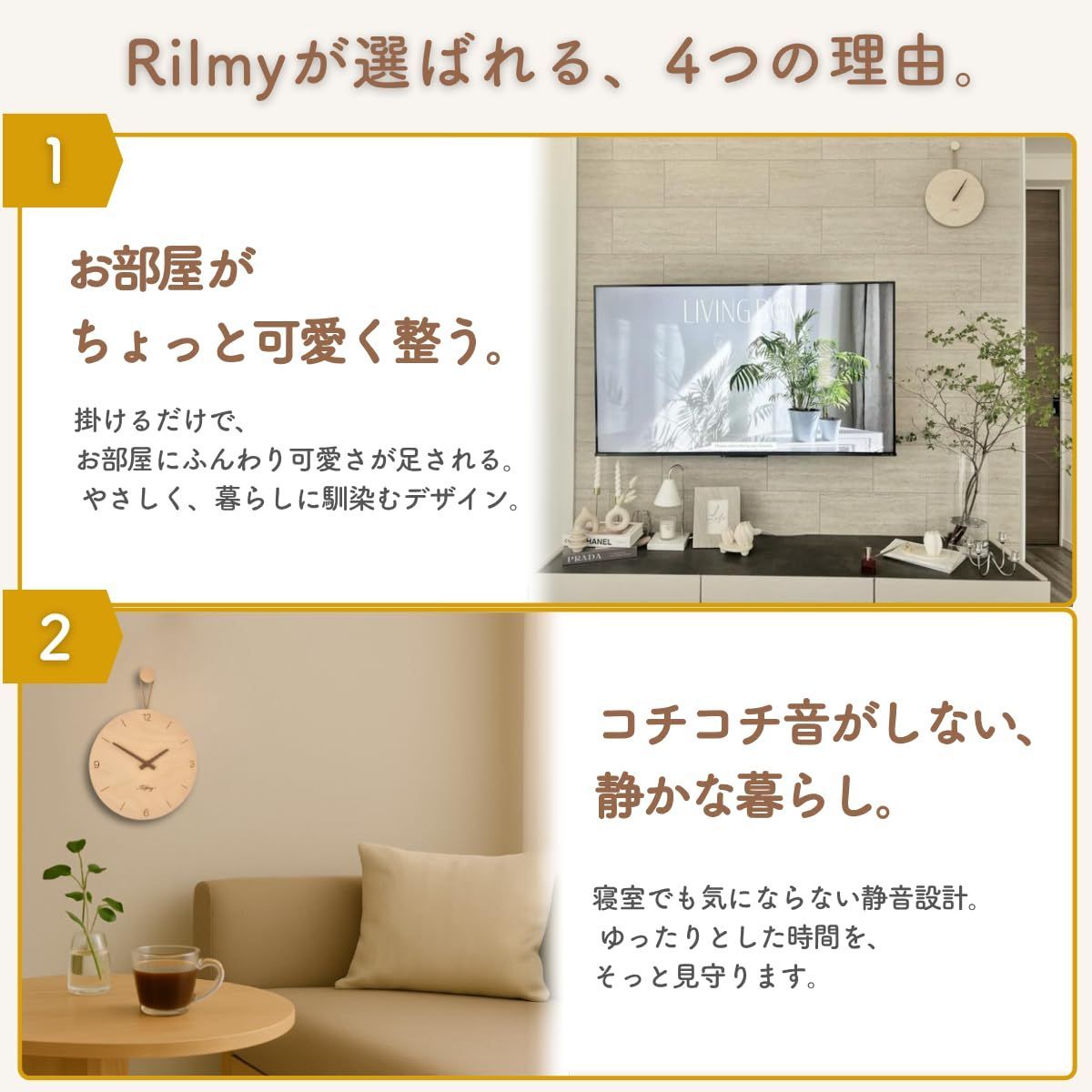 【静音】秒針がないため、カチカチ音がない静かな壁時計です。
