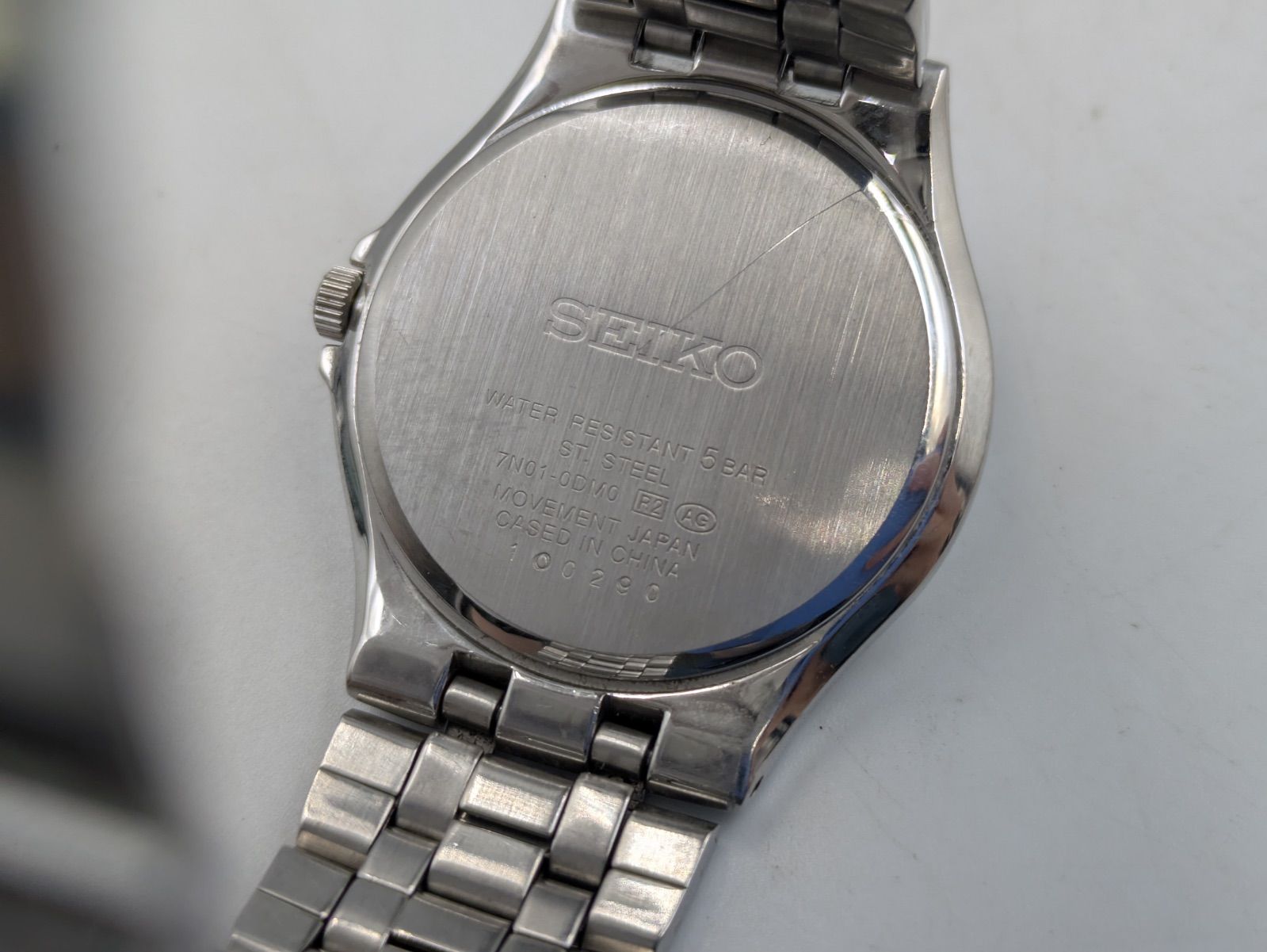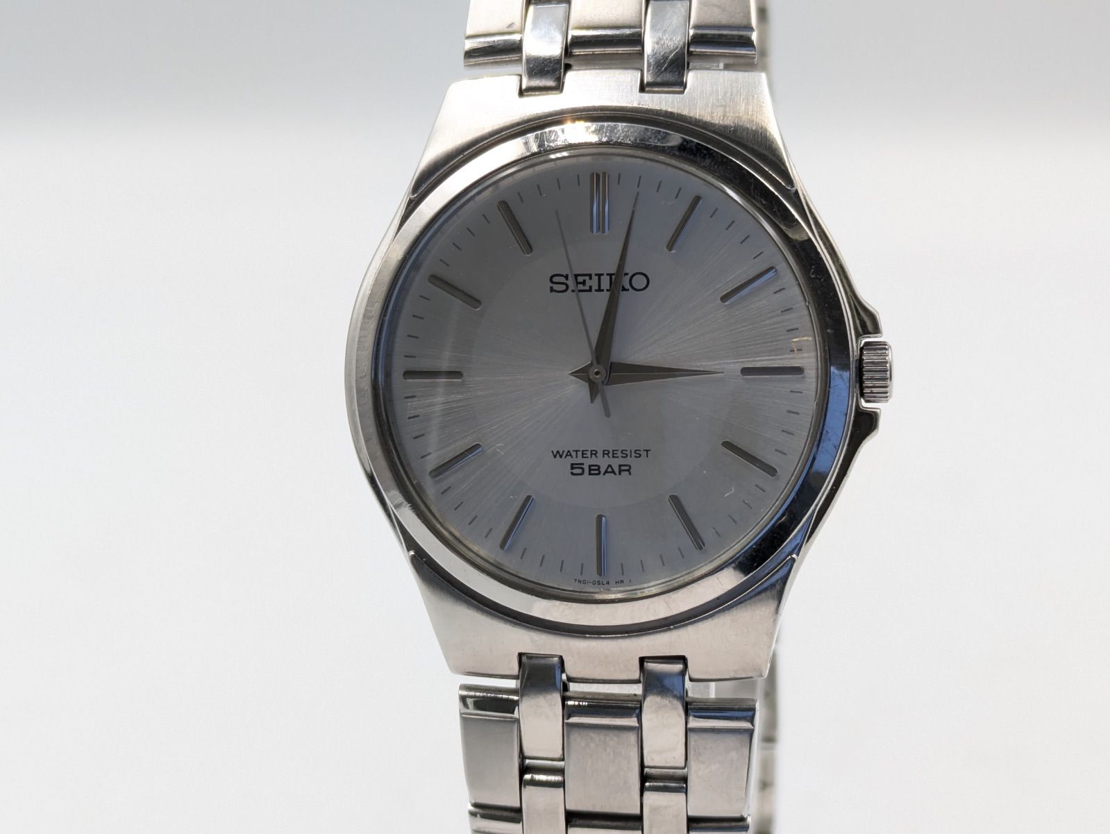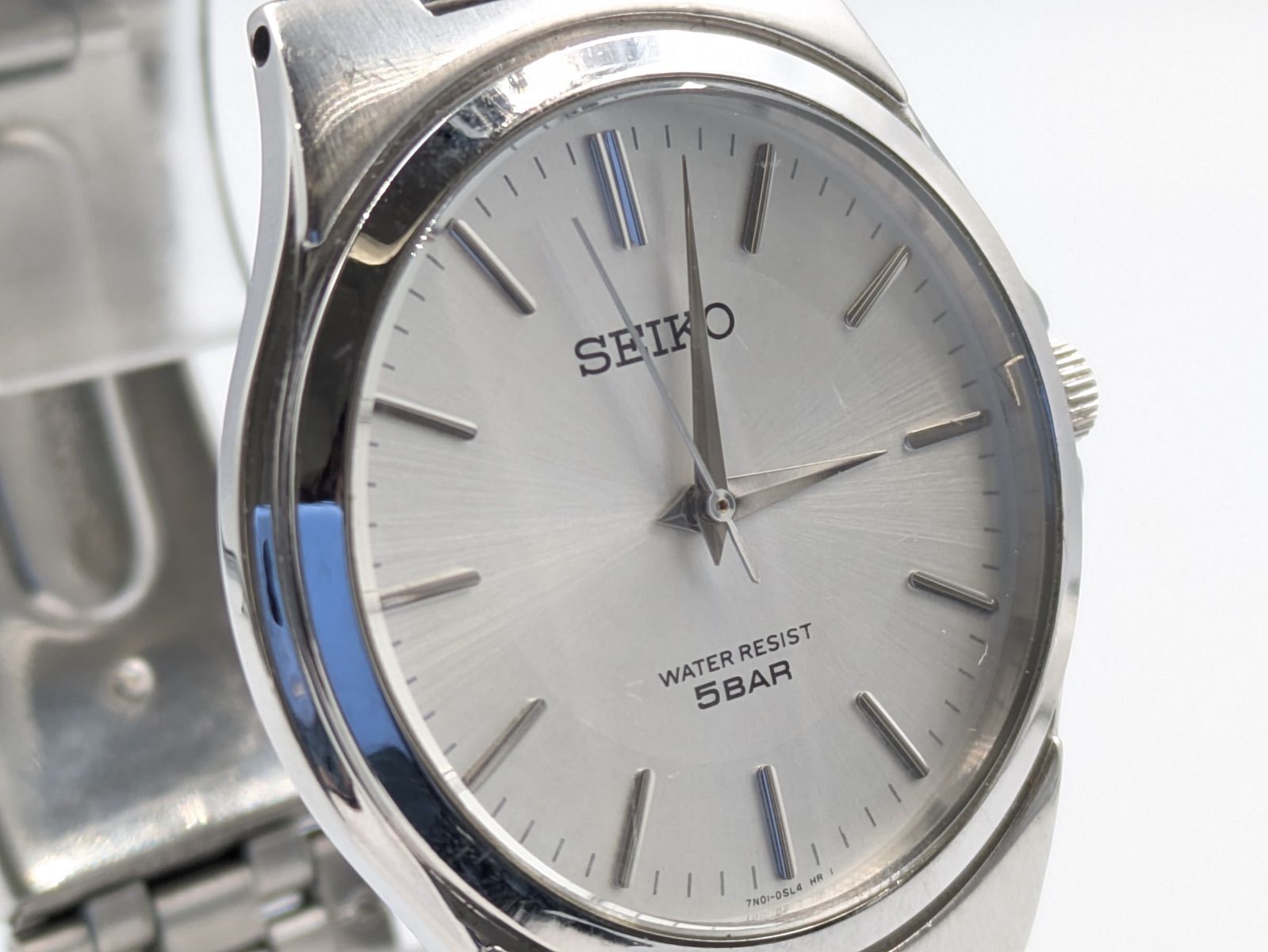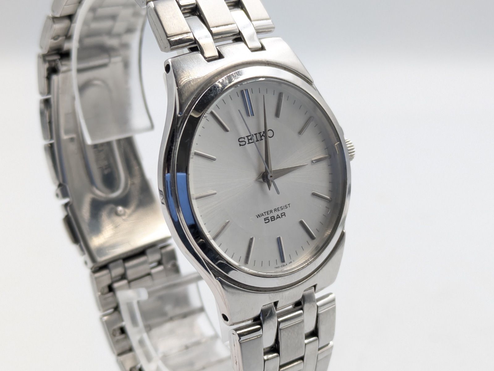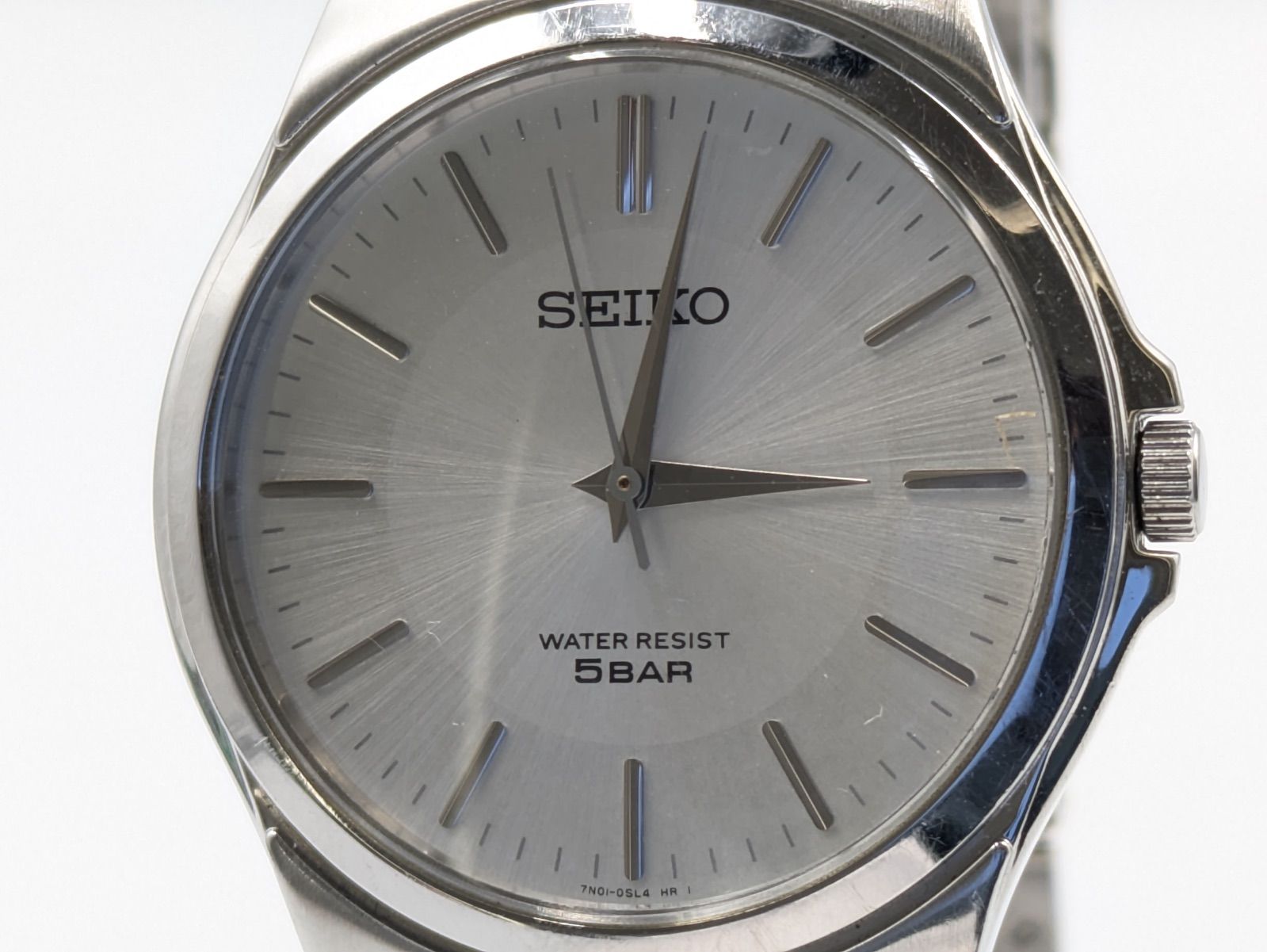 SEIKO(セイコー)のクオーツ腕時計です。シンプルな3針タイプで、シルバー系のサンレイ文字盤にバーインデックスを組み合わせたベーシックなデザインです。文字盤には「SEIKO」「WATER RESIST 5BAR」表記が確認できます。裏蓋刻印より、型番は「7N01-0AM0」、クオーツ式、防水性能は5BAR仕様であることが確認できます。ケースおよびブレスレットはステンレススチール製です。