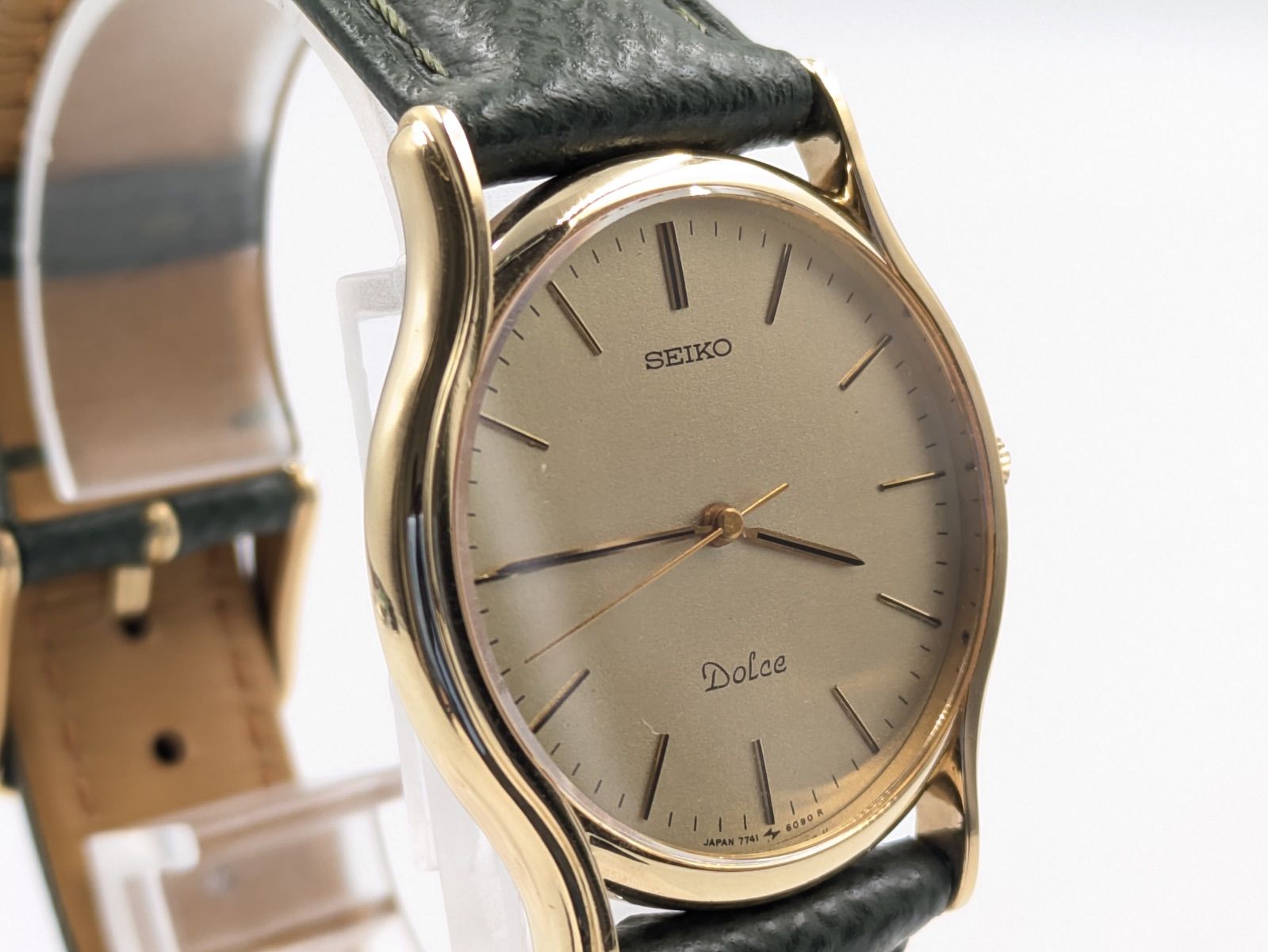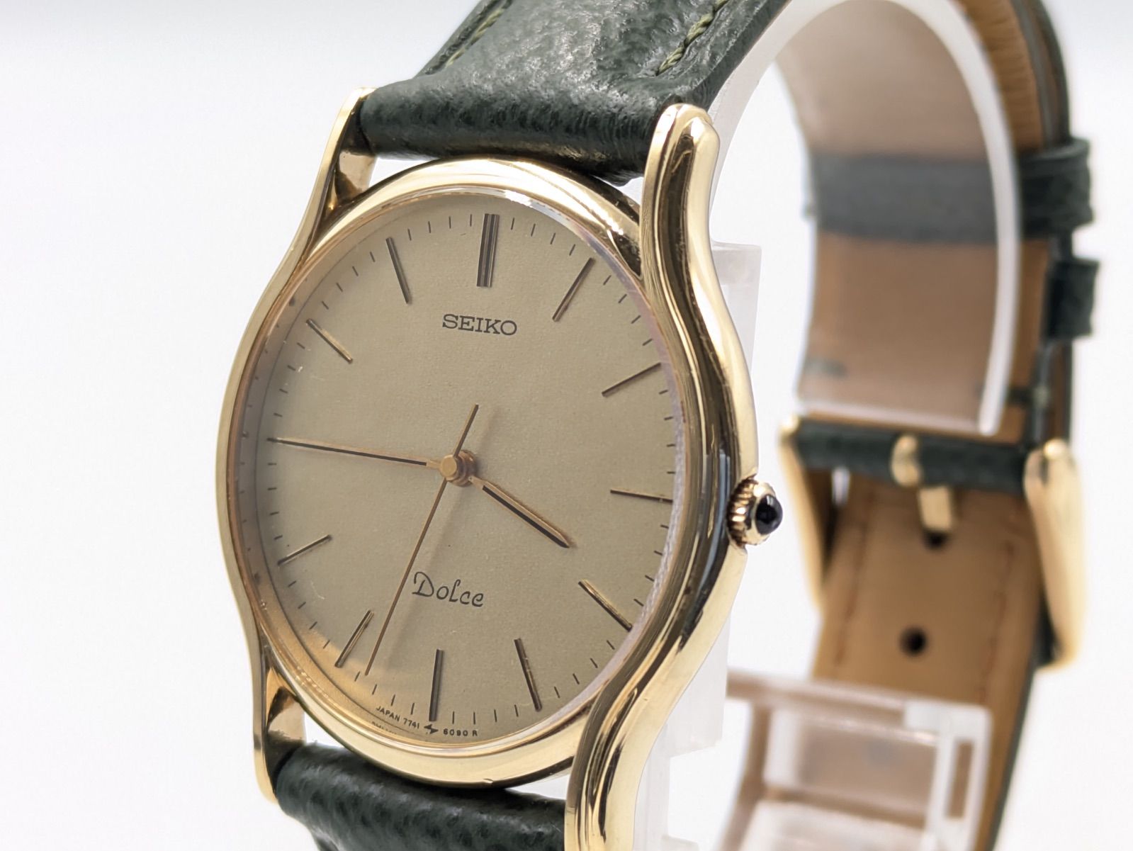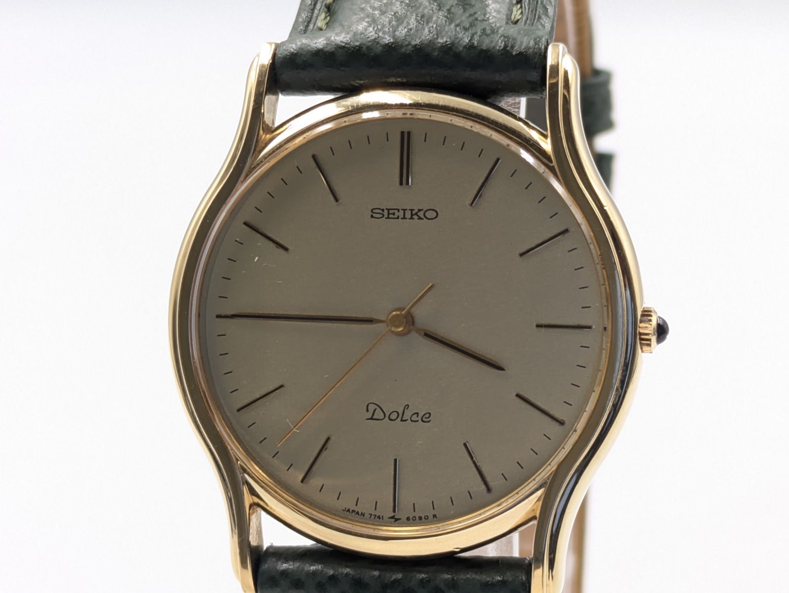 SEIKO(セイコー)のDolce(ドルチェ)シリーズのクオーツ腕時計です。文字盤には「SEIKO」「Dolce」表記が確認できます。シンプルなバーインデックスのシャンパン系文字盤に、ゴールドカラーケースを組み合わせたドレスウォッチデザインです。裏蓋刻印より、型番は「7741-6030」、クオーツ式、防磁仕様(ANTIMAGNETIC 60G)であることが確認できます。