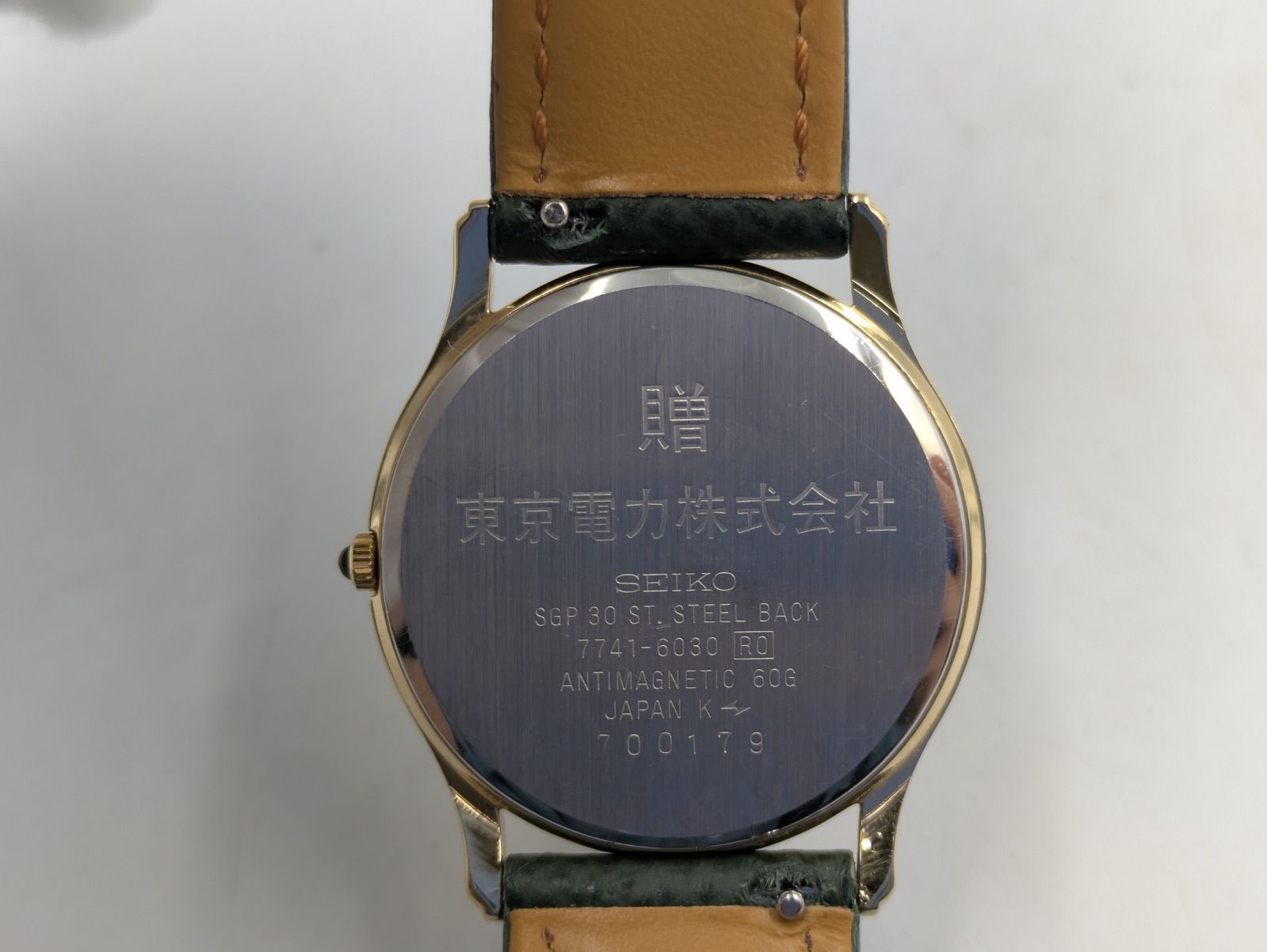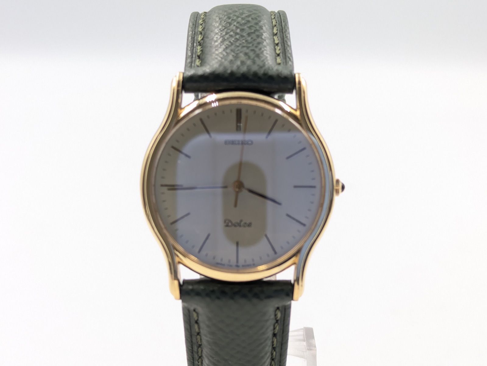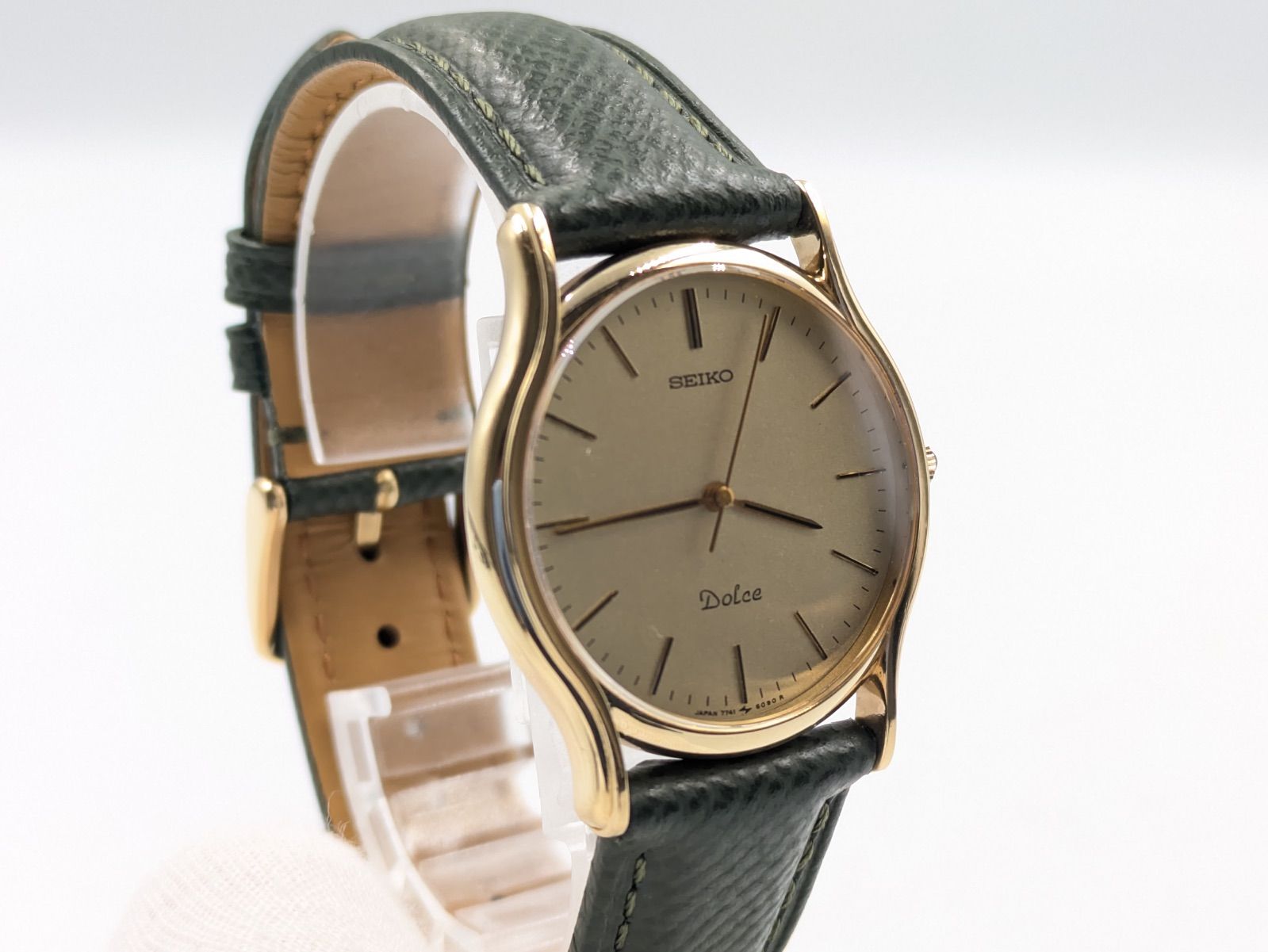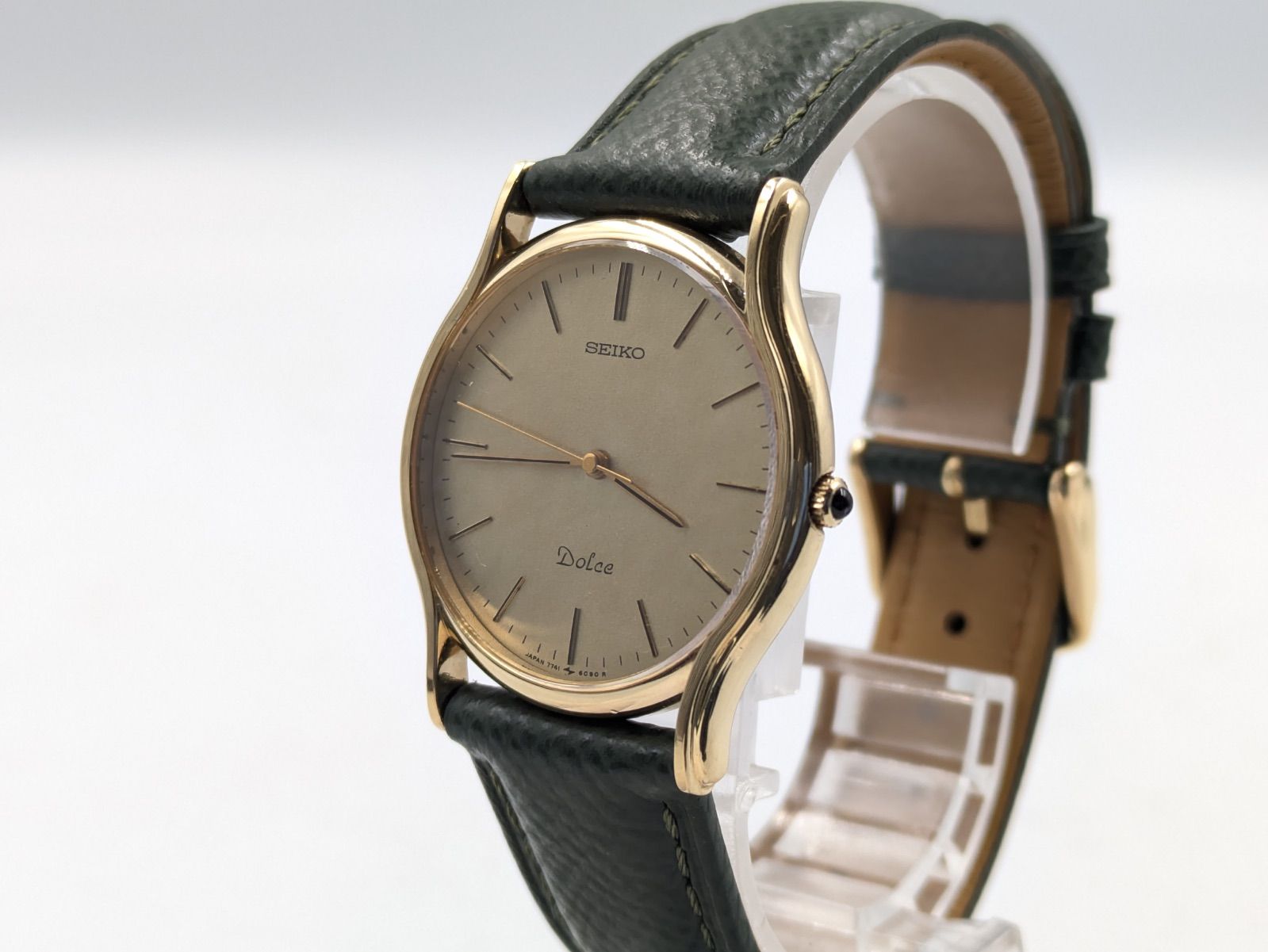 SEIKO(セイコー)のDolce(ドルチェ)シリーズのクオーツ腕時計です。文字盤には「SEIKO」「Dolce」表記が確認できます。シンプルなバーインデックスのシャンパン系文字盤に、ゴールドカラーケースを組み合わせたドレスウォッチデザインです。裏蓋刻印より、型番は「7741-6030」、クオーツ式、防磁仕様(ANTIMAGNETIC 60G)であることが確認できます。