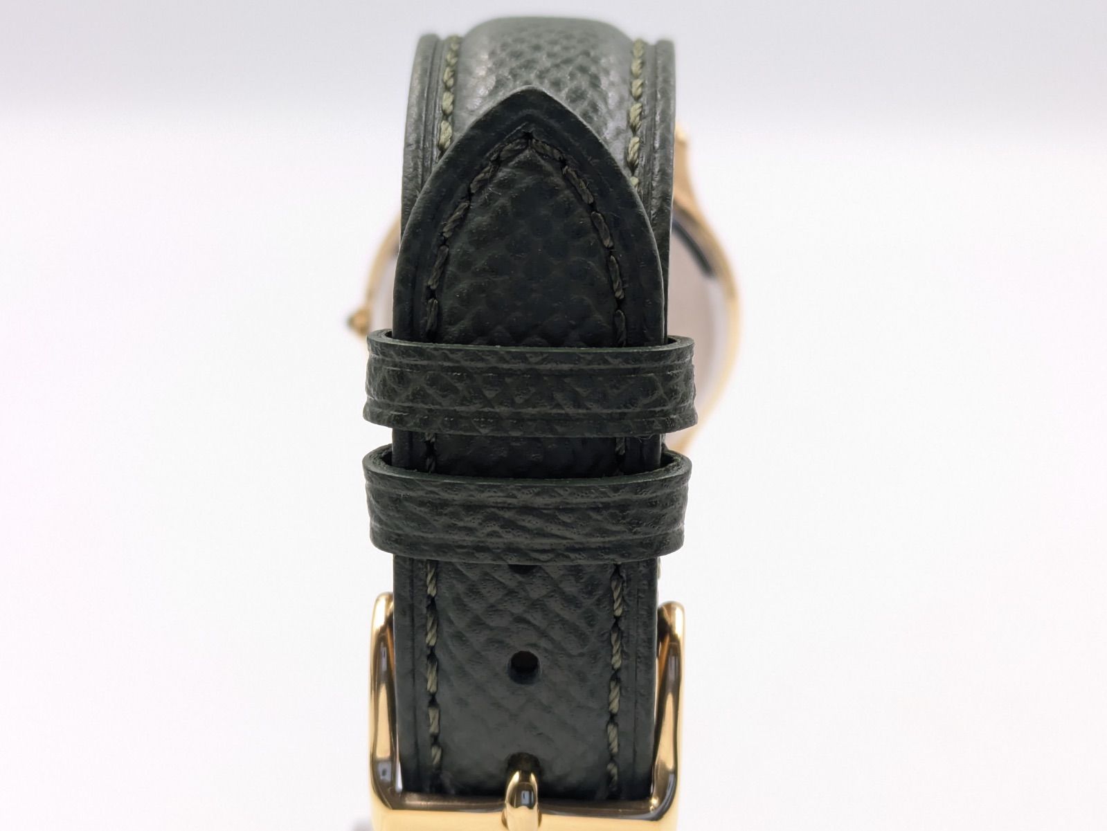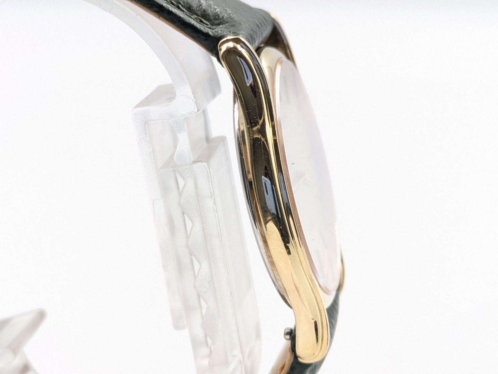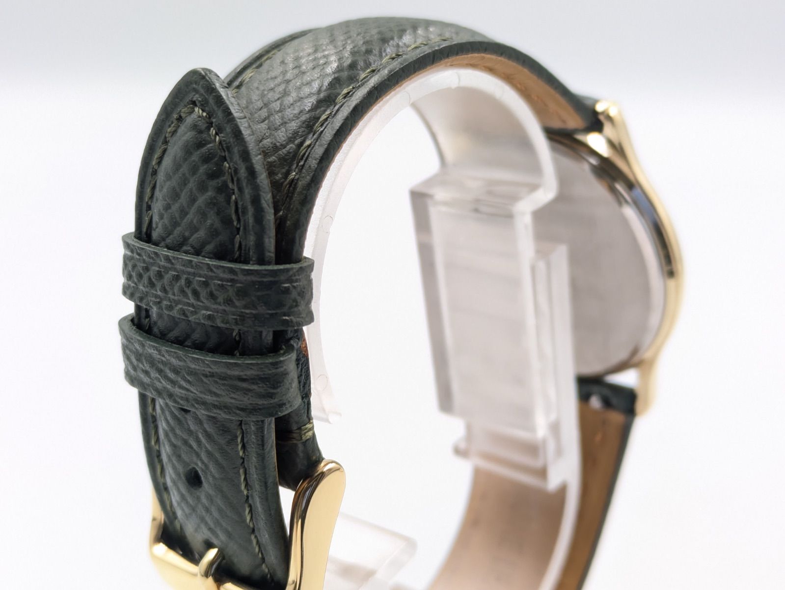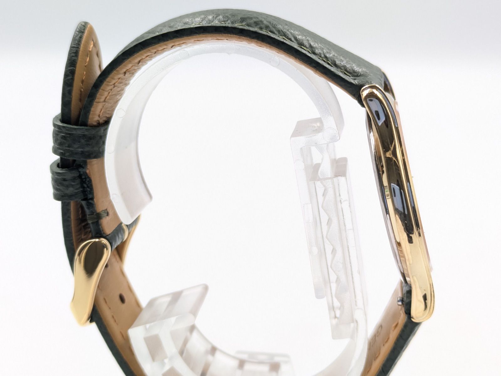 中古品のため、ケース・裏蓋に小傷やスレが見られます。ゴールドカラー部分には使用に伴う擦れがあります。風防に目立つ大きな割れや欠けは見受けられません。レザーベルトは使用感があり、シワやスレが確認できます。バックルにも細かな傷があります。全体的に使用感のある状態ですので、詳細は掲載写真をご確認ください。