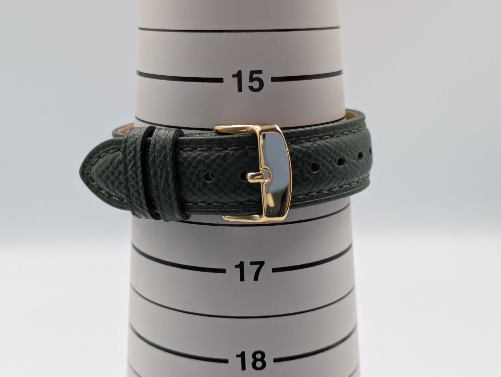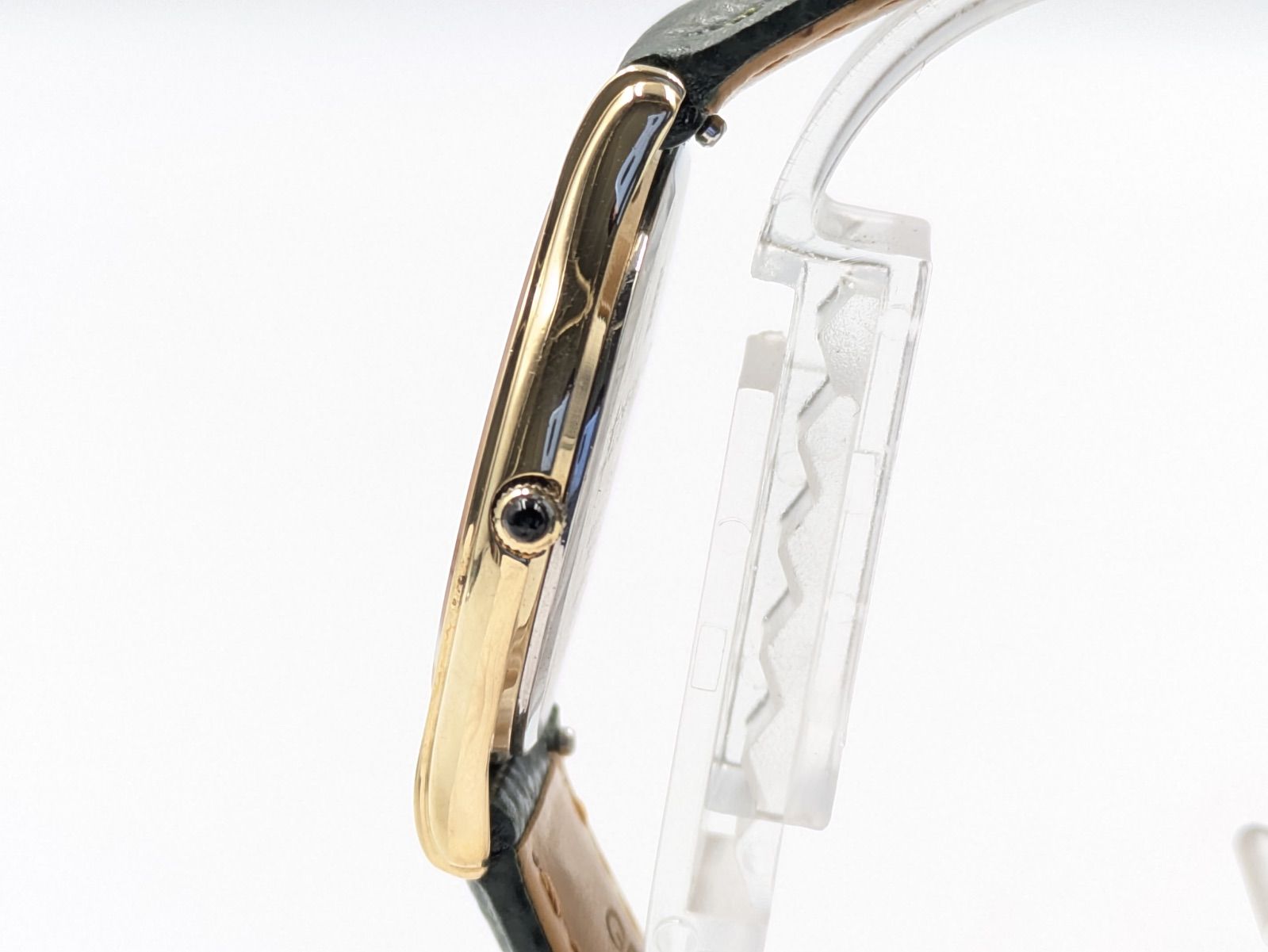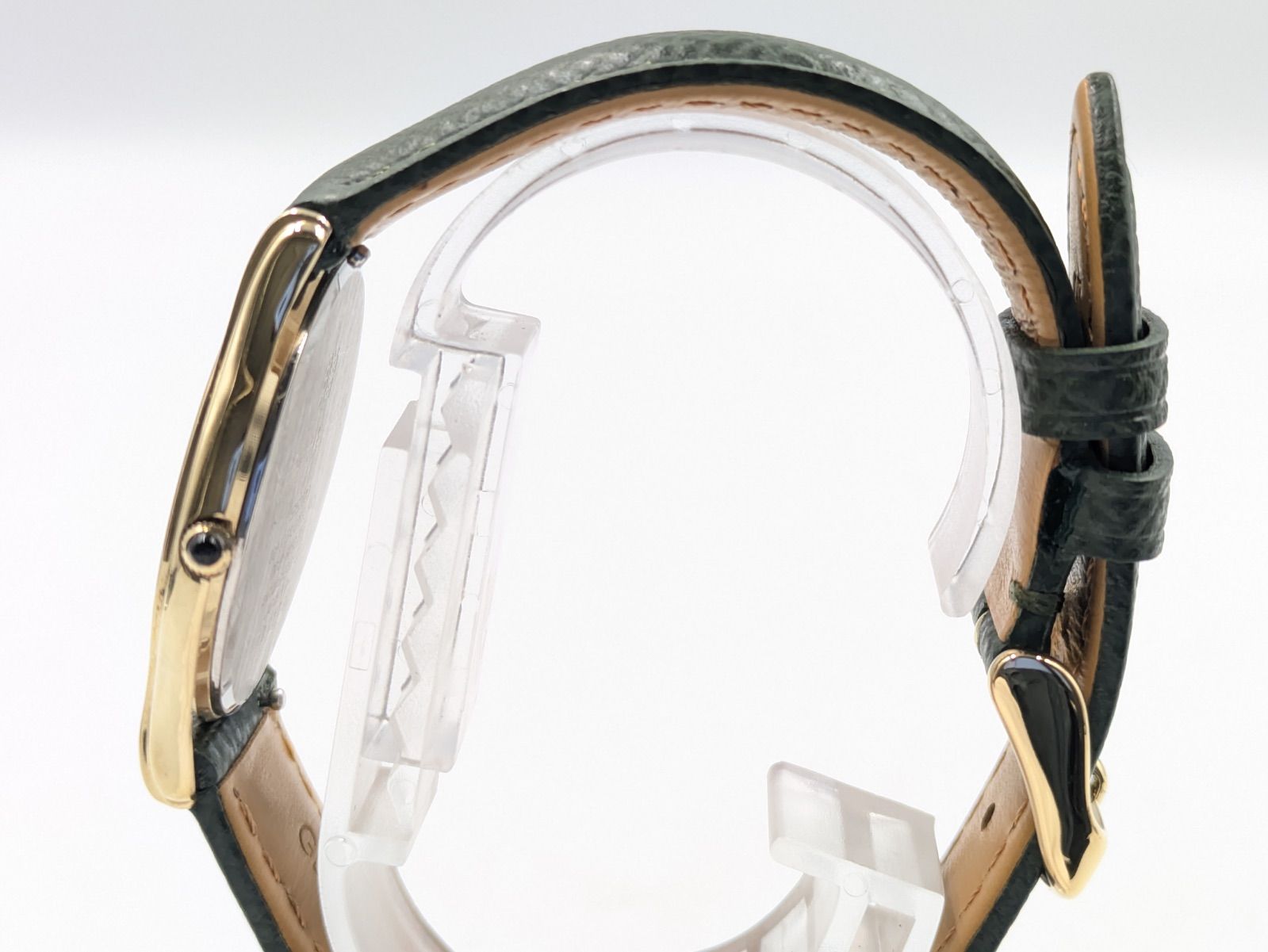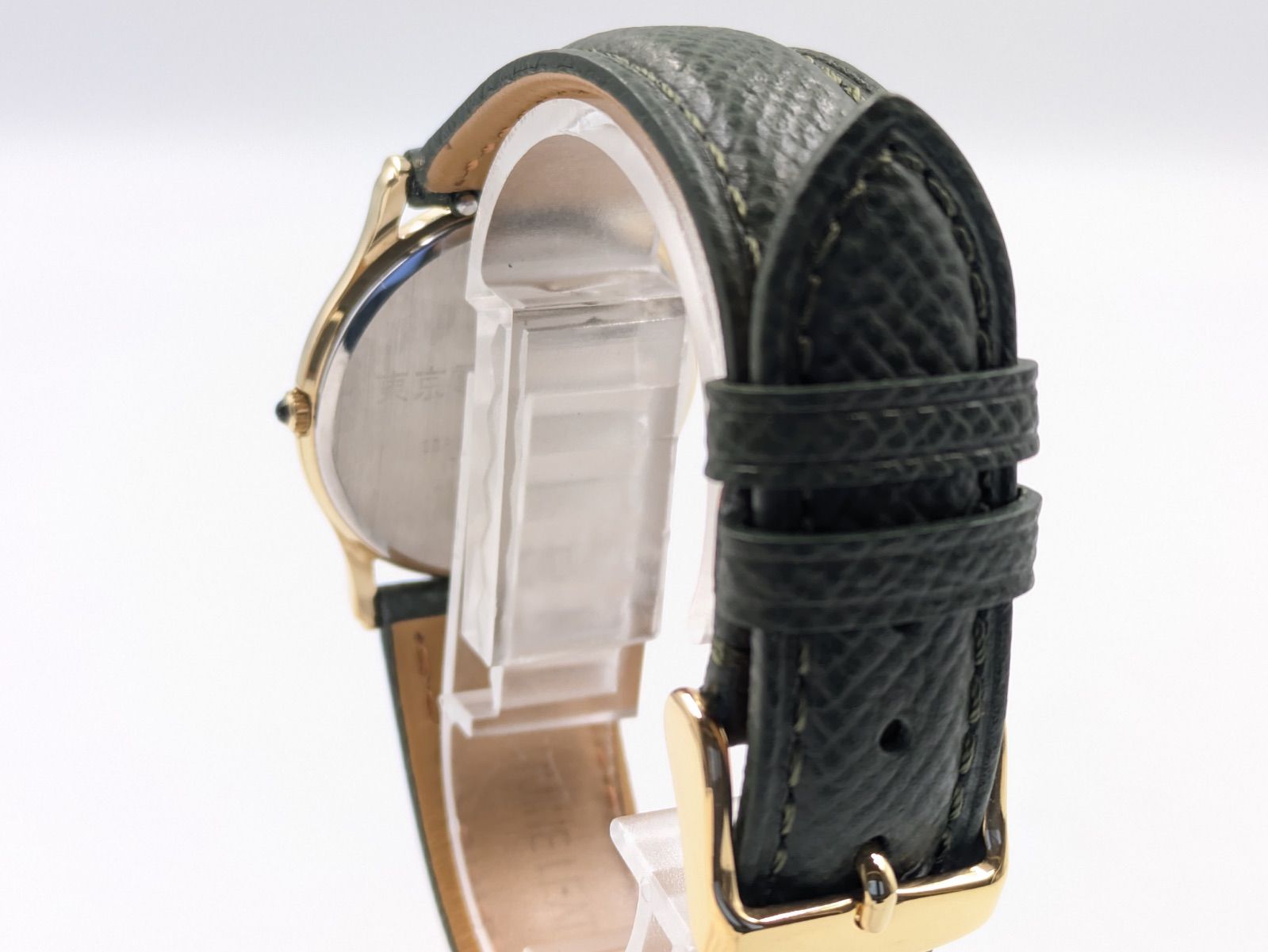 中古品のため、ケース・裏蓋に小傷やスレが見られます。ゴールドカラー部分には使用に伴う擦れがあります。風防に目立つ大きな割れや欠けは見受けられません。レザーベルトは使用感があり、シワやスレが確認できます。バックルにも細かな傷があります。全体的に使用感のある状態ですので、詳細は掲載写真をご確認ください。
