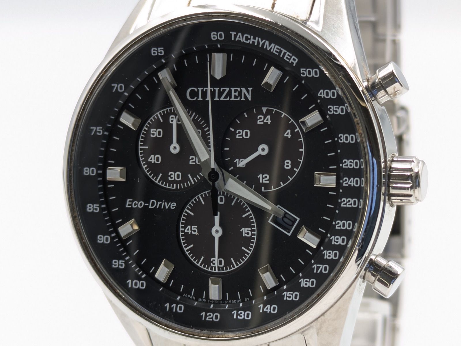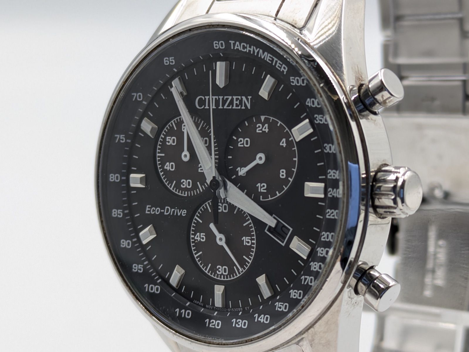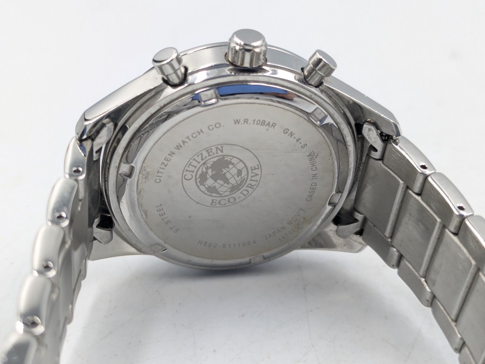 CITIZEN(シチズン)のエコ・ドライブ搭載クロノグラフ腕時計です。文字盤には「CITIZEN」「Eco-Drive」の表記が確認できます。ブラック文字盤に3つのサブダイヤルを備えたクロノグラフ仕様で、外周にはタキメータースケールが配置されています。裏蓋刻印より、型番は「H500-S111064」、エコ・ドライブ(ソーラー)駆動、防水性能は10BARであることが確認できます。ケース・ブレスレットはステンレススチール製です。