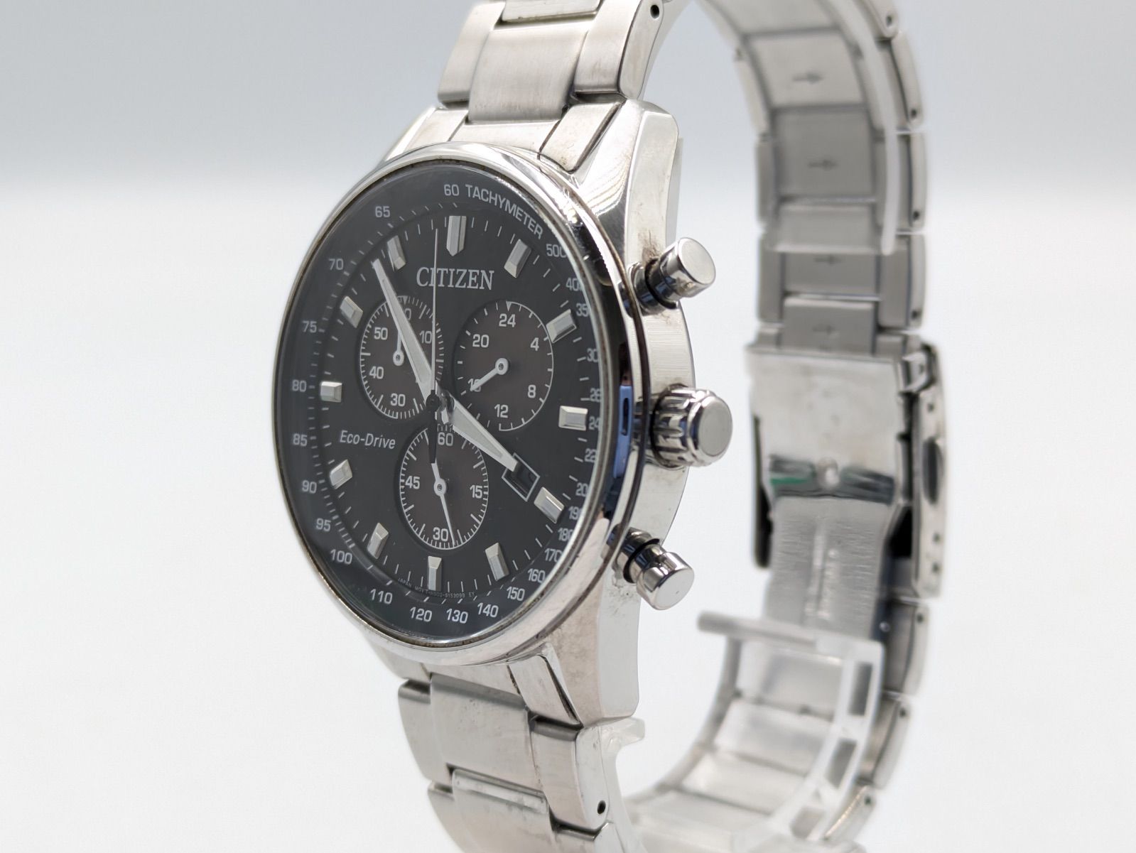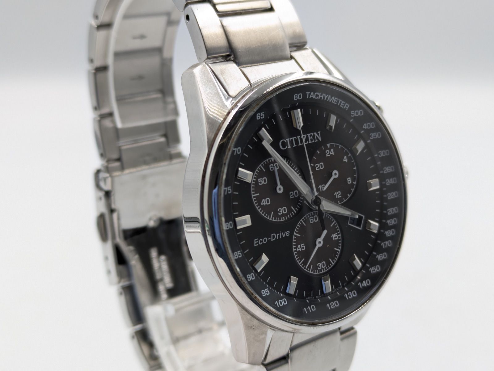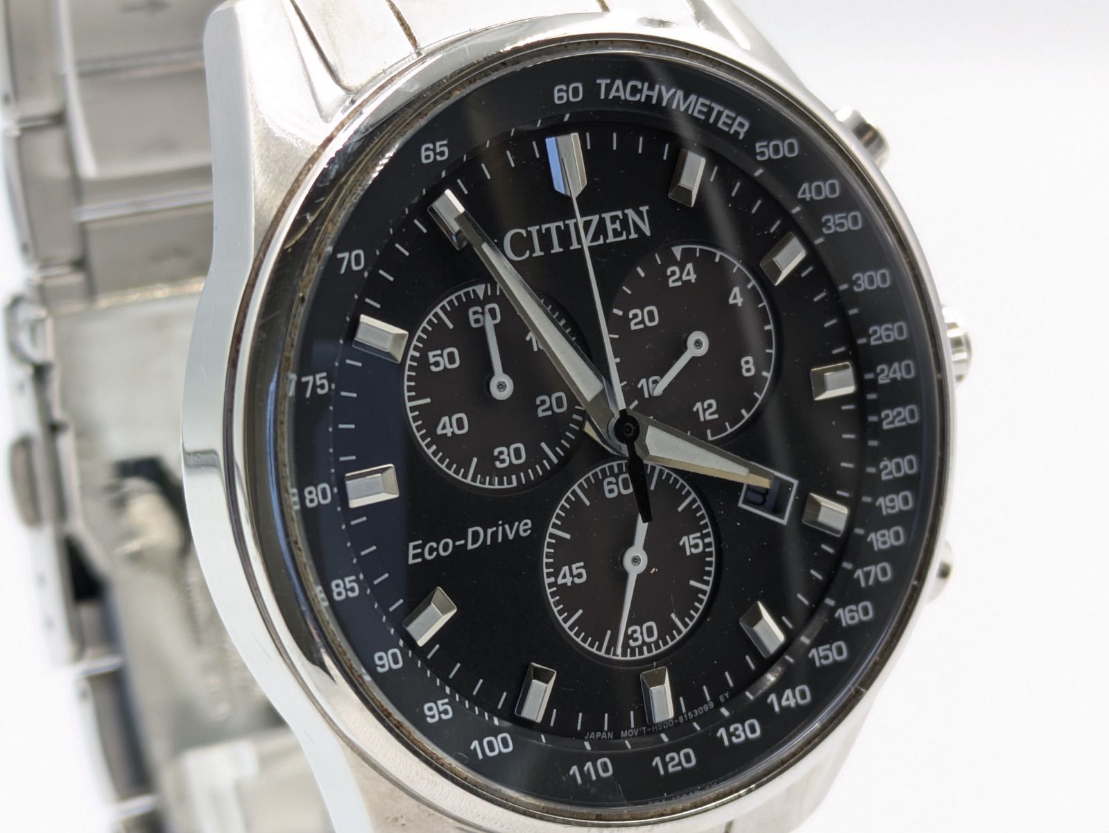 CITIZEN(シチズン)のエコ・ドライブ搭載クロノグラフ腕時計です。文字盤には「CITIZEN」「Eco-Drive」の表記が確認できます。ブラック文字盤に3つのサブダイヤルを備えたクロノグラフ仕様で、外周にはタキメータースケールが配置されています。裏蓋刻印より、型番は「H500-S111064」、エコ・ドライブ(ソーラー)駆動、防水性能は10BARであることが確認できます。ケース・ブレスレットはステンレススチール製です。