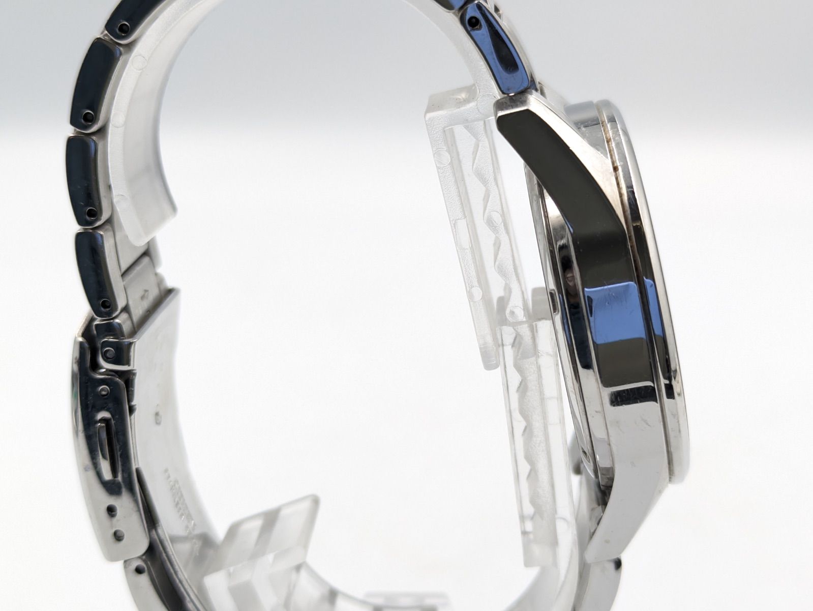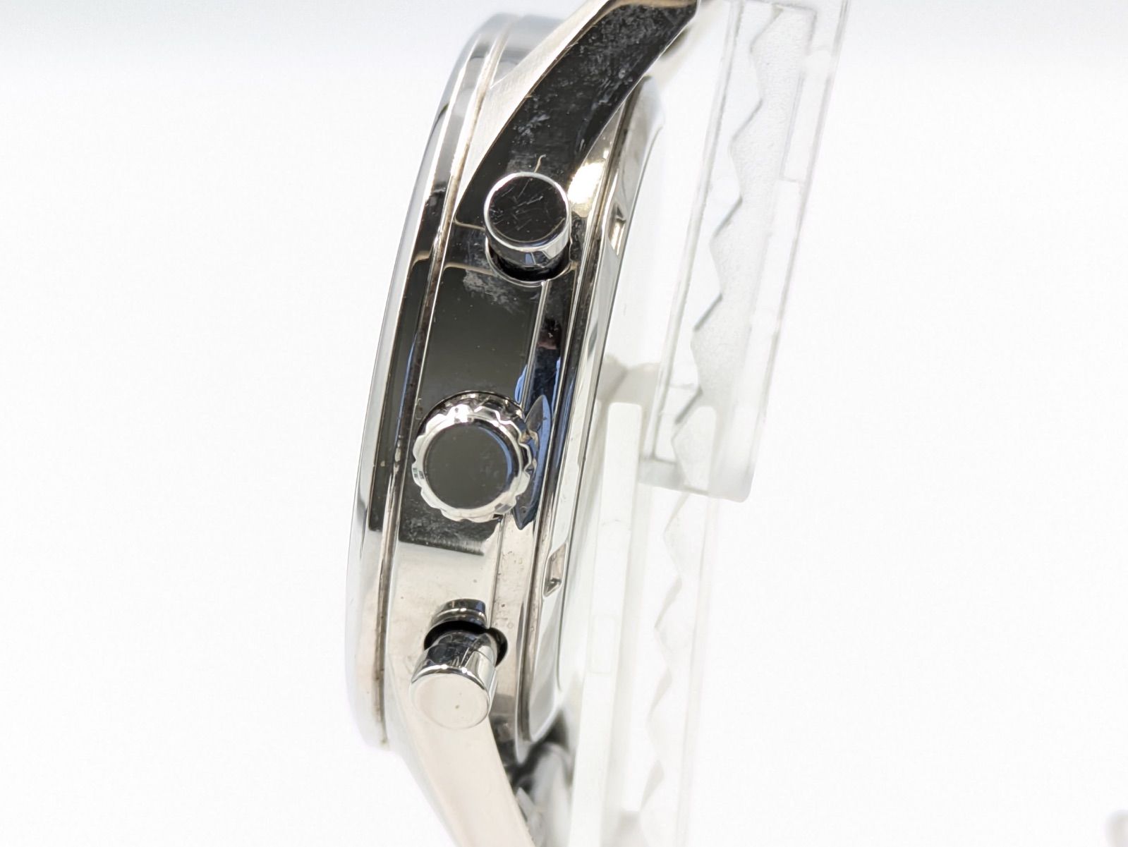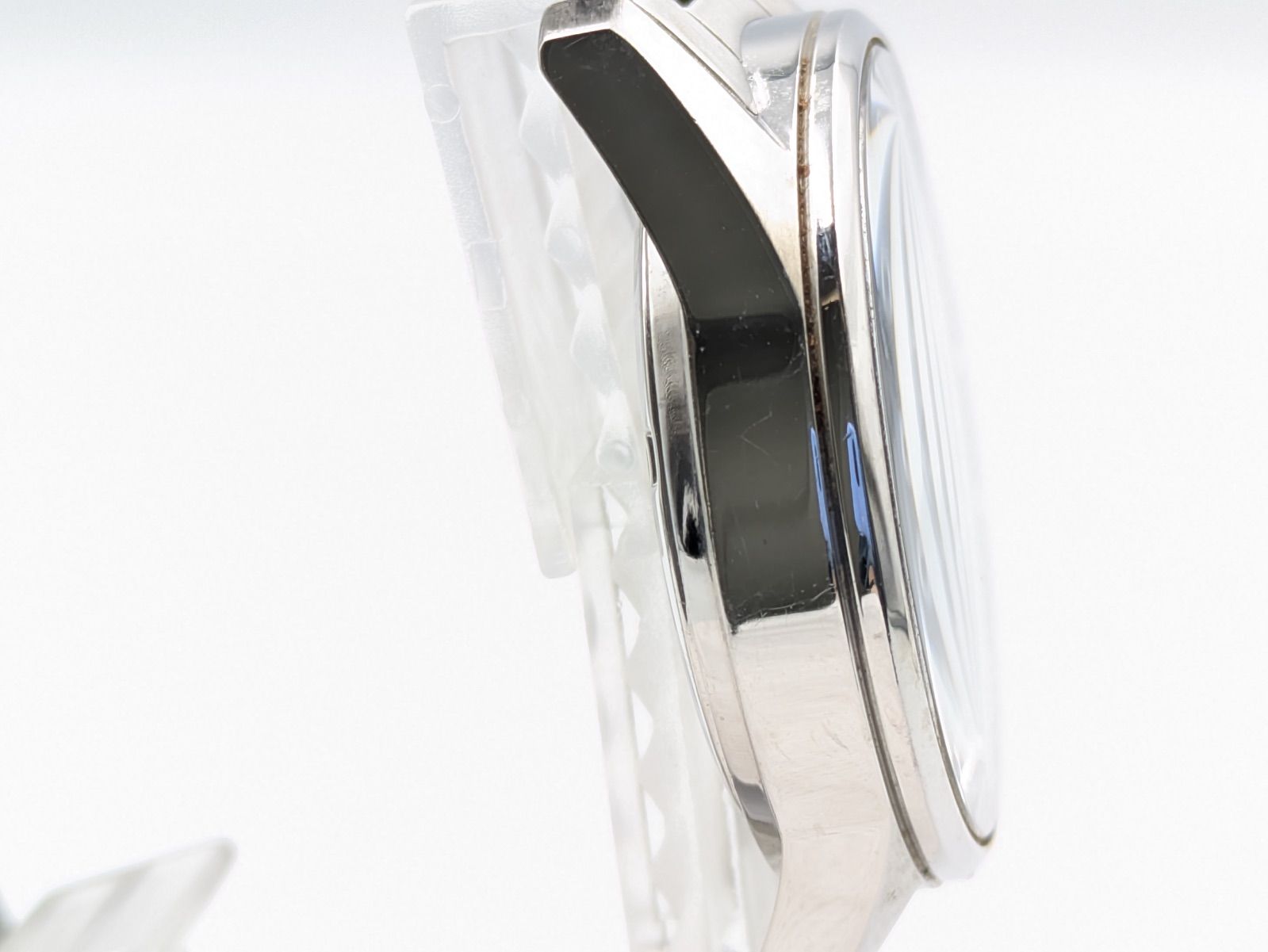 中古品のため、ケース・ベゼル・裏蓋・ブレスレットに小傷やスレ、使用に伴うくすみが見られます。バックル部分にも擦れがあります。風防に大きな割れや欠けは見受けられませんが、細かな傷はございます。全体的に使用感のある状態です。詳細は掲載写真をご確認ください。