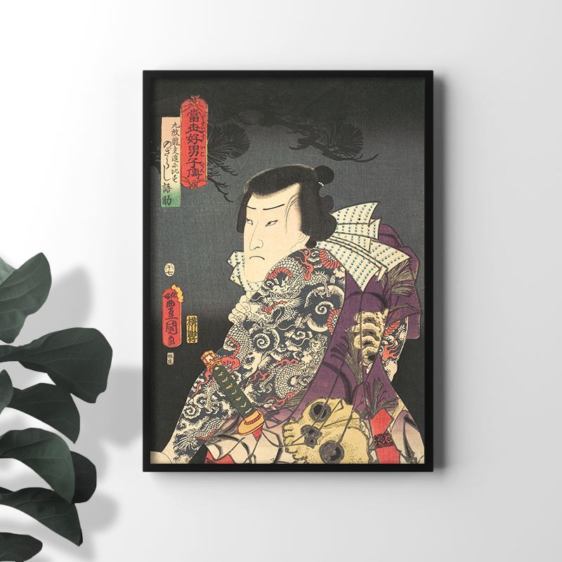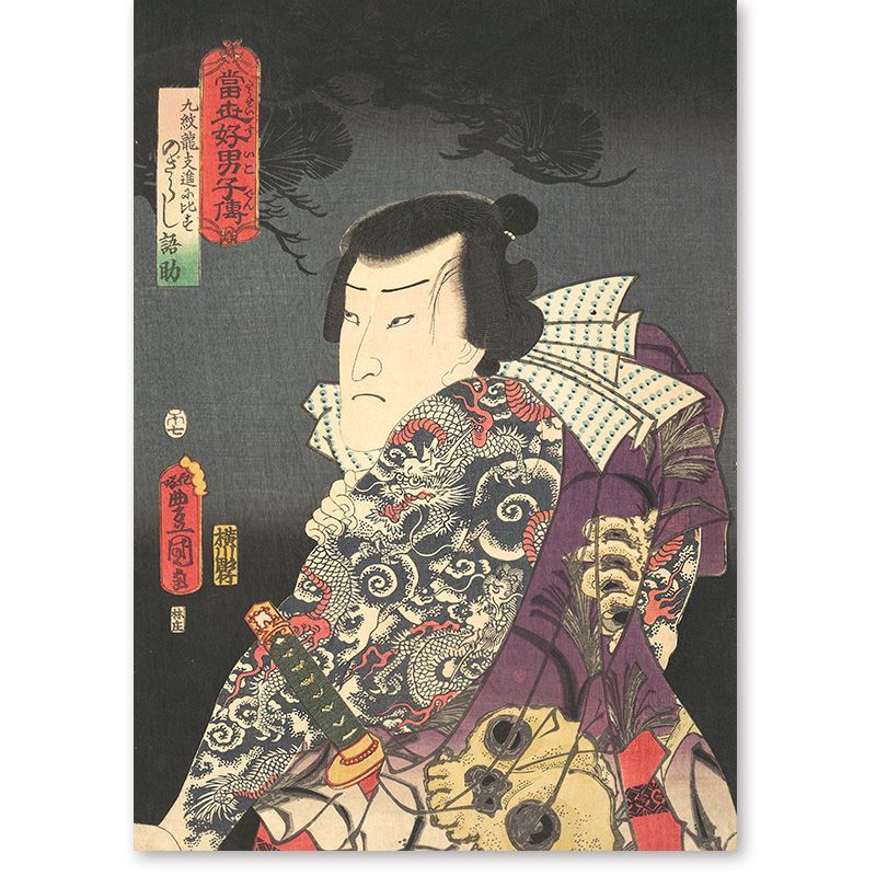 中国の英雄譚『水滸伝』に登場する九紋龍史進のイメージを、江戸のヒーローである野ざらし悟助に投影した見事な見立てです。肩から背中を覆う九匹の龍の刺青は、緻密な木版技術によって生命力溢れる姿で描かれており、内面に流れる剛勇さを視覚的に証明しています。