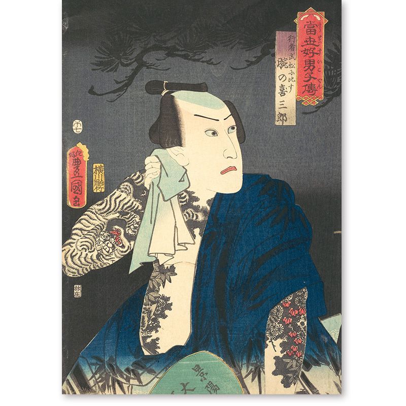 『水滸伝』に登場する虎退治の英雄・武松のイメージを、江戸の侠客である腕の喜三郎に投影した見事な趣向です。首筋を拭う何気ない動作の中に、これから始まる波乱を予感させる緊張感が漂っています。