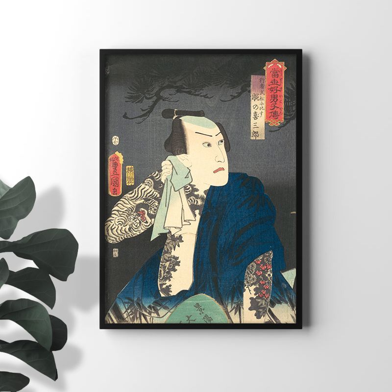 江戸時代の日本文化において、英雄の剛勇さを描いた錦絵は、庶民に大きな娯楽を提供しました。本作は『水滸伝』の行者武松に見立てた腕の喜三郎を、名優の河原崎権十郎が演じる姿を捉えた役者絵です。右腕に彫られた虎の刺青は武松の伝説である虎退治を象徴しており、木版画特有の色彩豊かな構図で表現されています。忍者のような隠密的な魅力とは異なる、堂々とした立ち姿の様式美は、伝統芸能としての歌舞伎の歴史を感じさせます。シリーズ『当盛好男子傳』の一枚として、見立の技法を用いた洗練された意匠は、現代においても高い芸術的価値を誇っています。