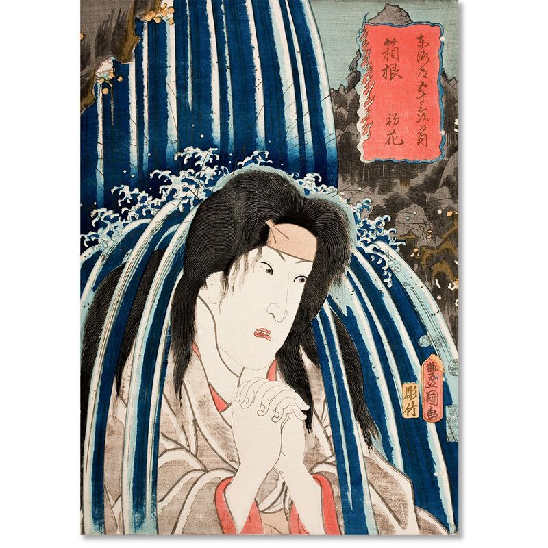 江戸時代の日本文化において、復讐や慈愛をテーマにした物語は歌舞伎の演目として人気を博しました。この浮世絵は『箱根霊験?等織』の初花を描いた錦絵であり、不動明王への願掛けとして滝行に励む貞女の姿を色彩豊かに描写しています。忍者の物語とは異なる趣を持ちつつも、伝説的な英雄譚のような強固な意志が、木版画特有の緻密な構図で表現されました。箱根の厳しい滝の描写や、役者絵としての洗練された意匠は、当時の伝統芸能が持っていた高い芸術性と歴史を今に伝えています。
