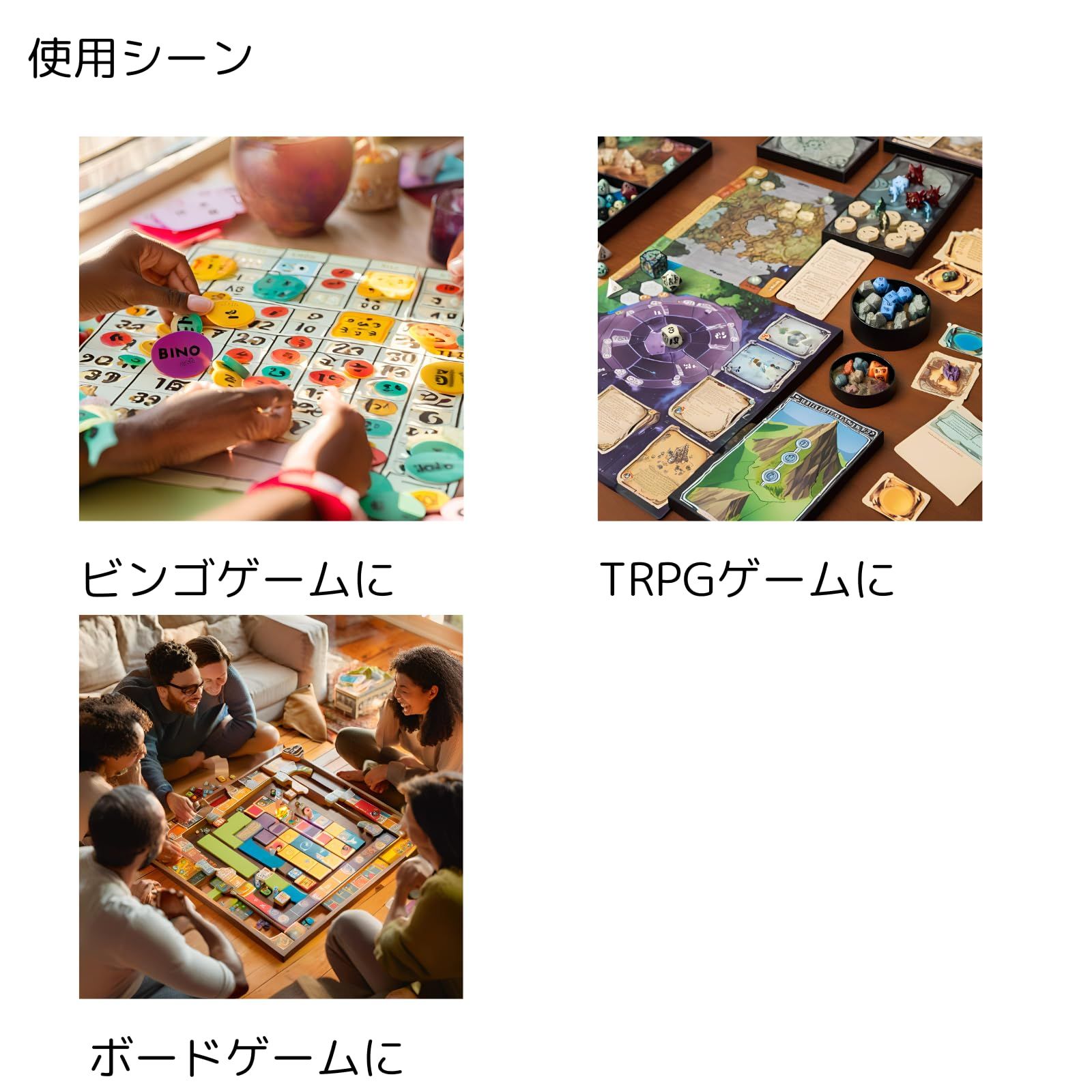 ボードゲーム、TRPG(ダンジョンズ&ドラゴンズ、クトゥルフ神話など)、マジック・ザ・ギャザリング、占い、教育ツールなど幅広いシーンで活躍します。新年会や誕生日会、クリスマスパーティーなどのイベントでも盛り上がること間違いなし!