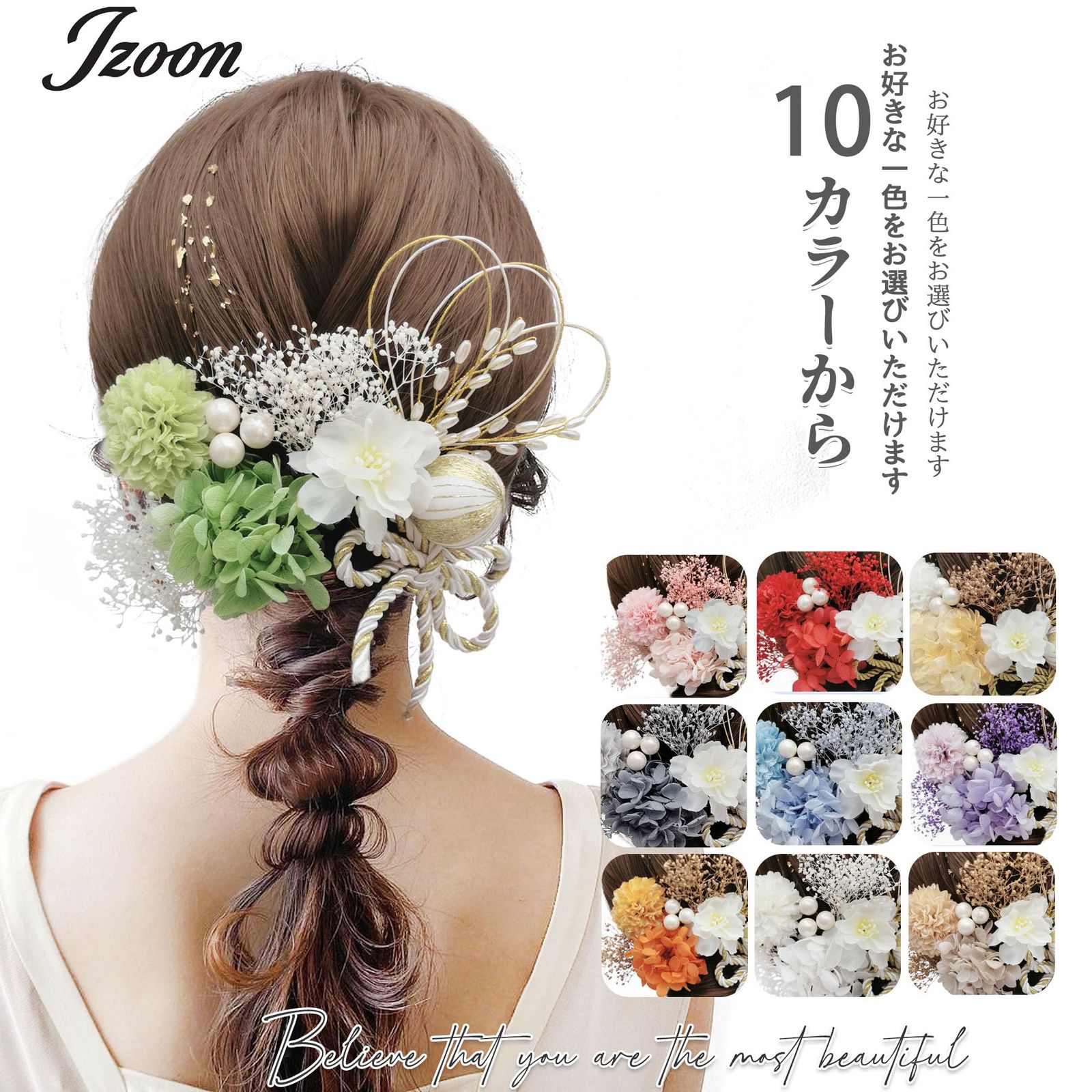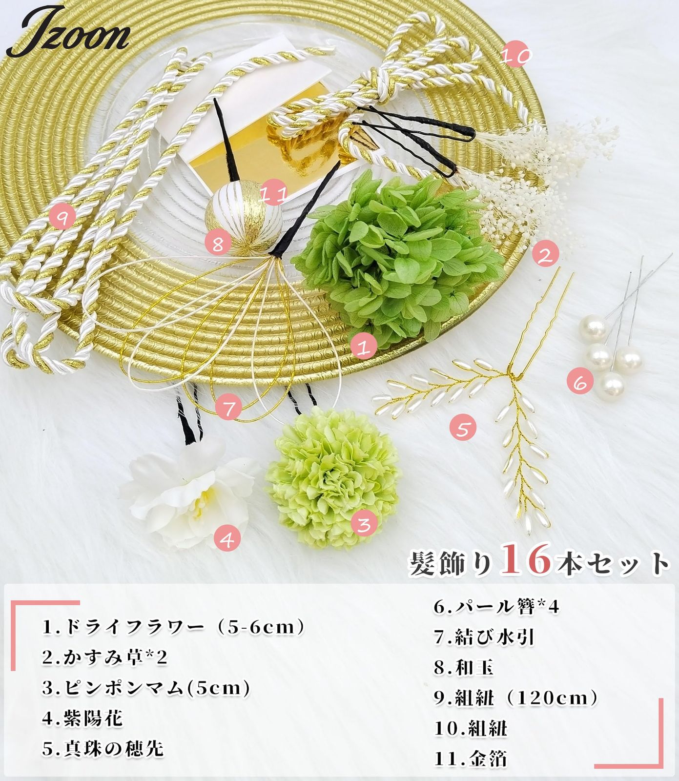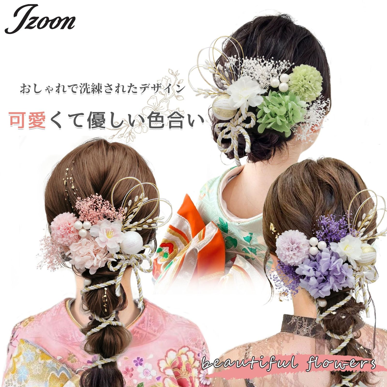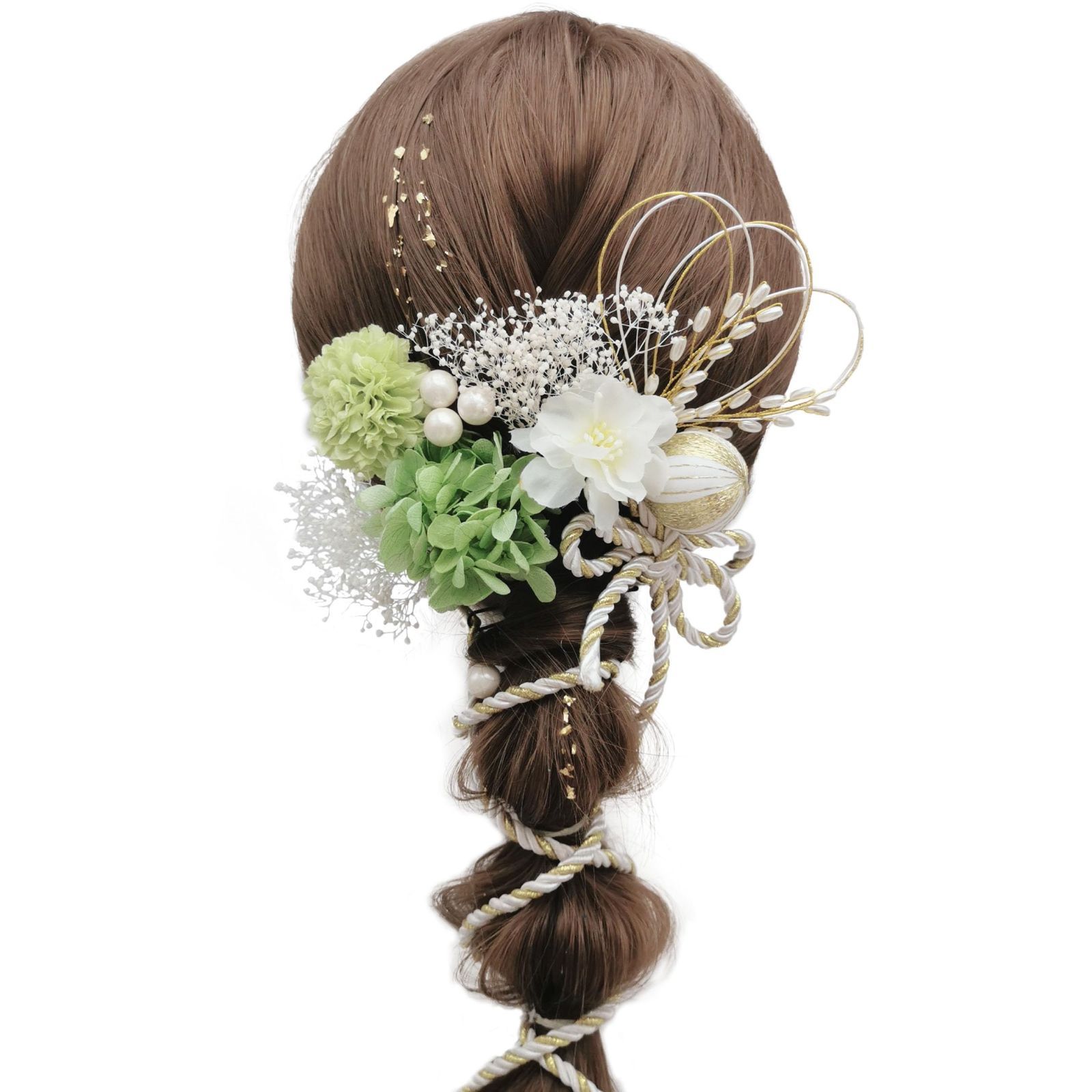 [JZOON] 髪飾り ヘアアクセサリー ドライフラワー 紫陽花 カスミソウ ピンポンマム 真珠の穂先 パール 水引 和玉 組紐 金箔 結婚式 入学式 卒業式 成人式 花火大会 着物 浴衣 袴 振袖 洋服 上品 華やか キラキラ 立体感 おしゃれ 緑 Y4408