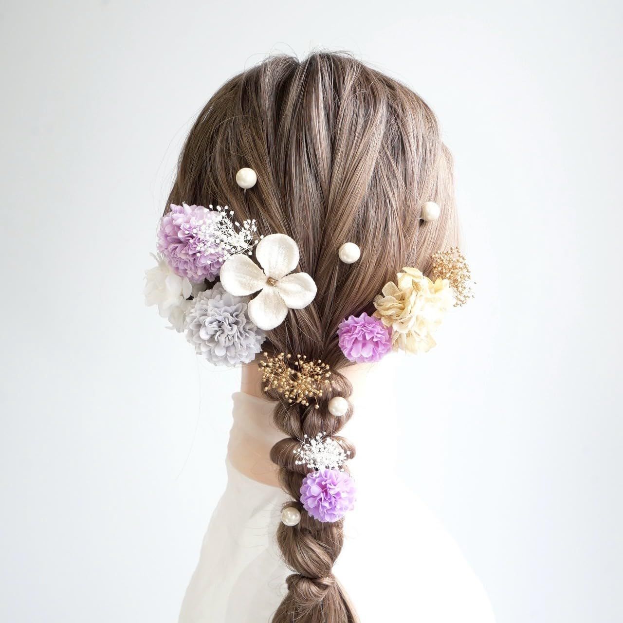・マムにドライフラワー、パールピックを組み合わせた髪飾りです。 編みおろしだけでなく、アップスタイルにもお使いいただけます。