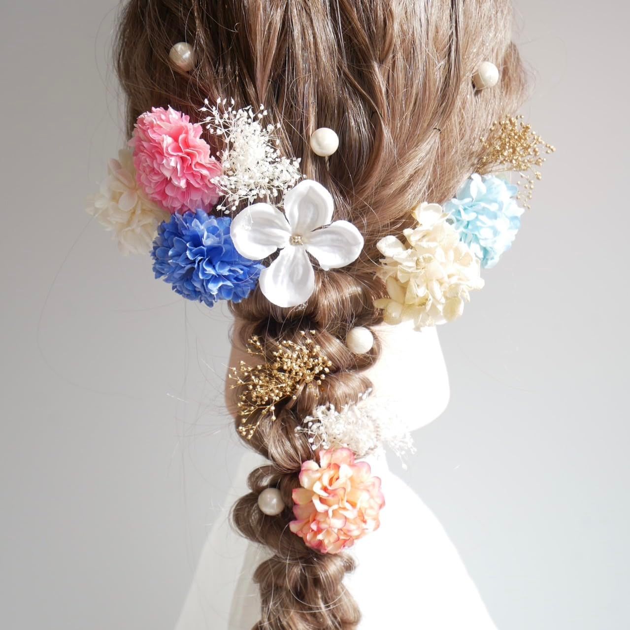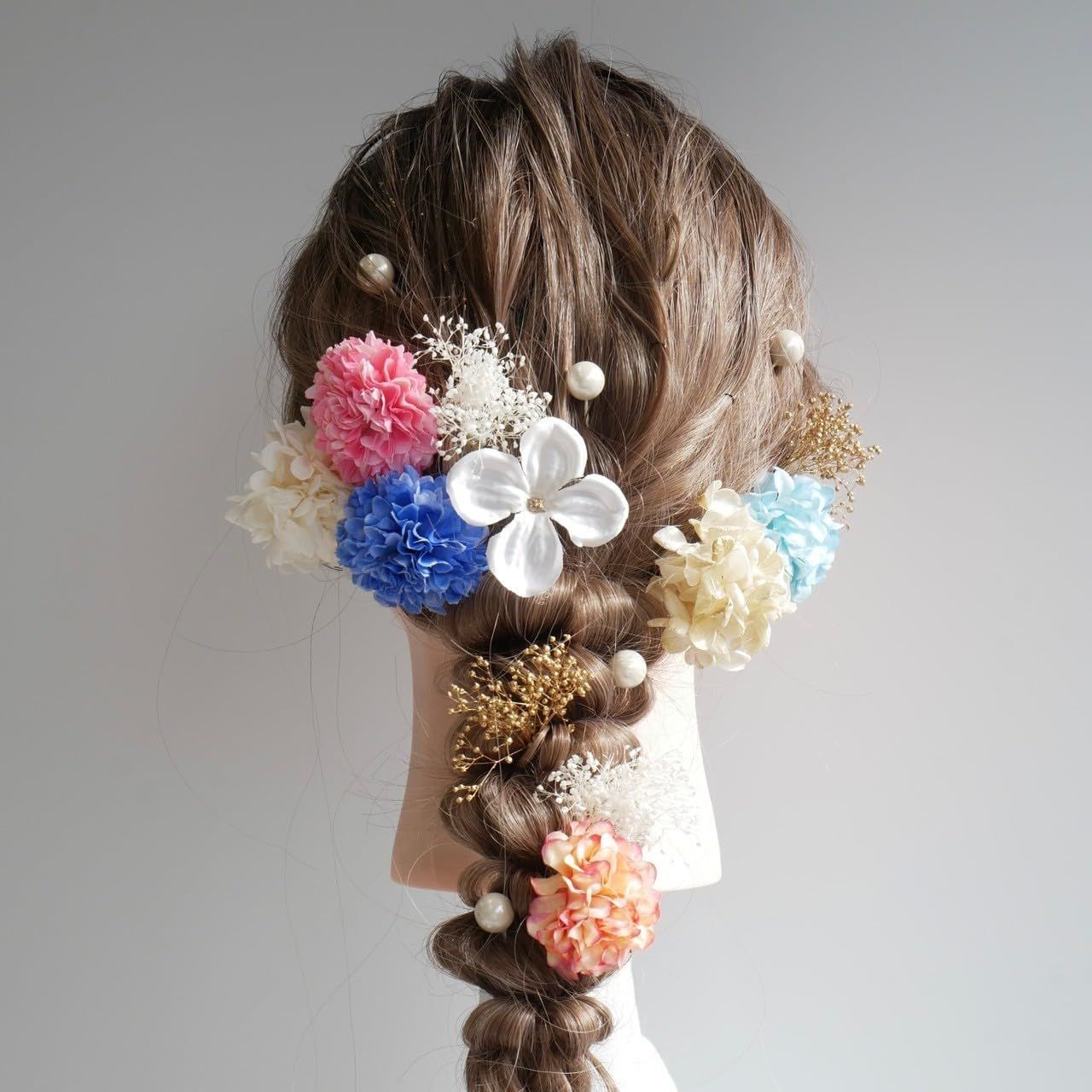 ・マムにドライフラワー、パールピックを組み合わせた髪飾りです。 編みおろしだけでなく、アップスタイルにもお使いいただけます。