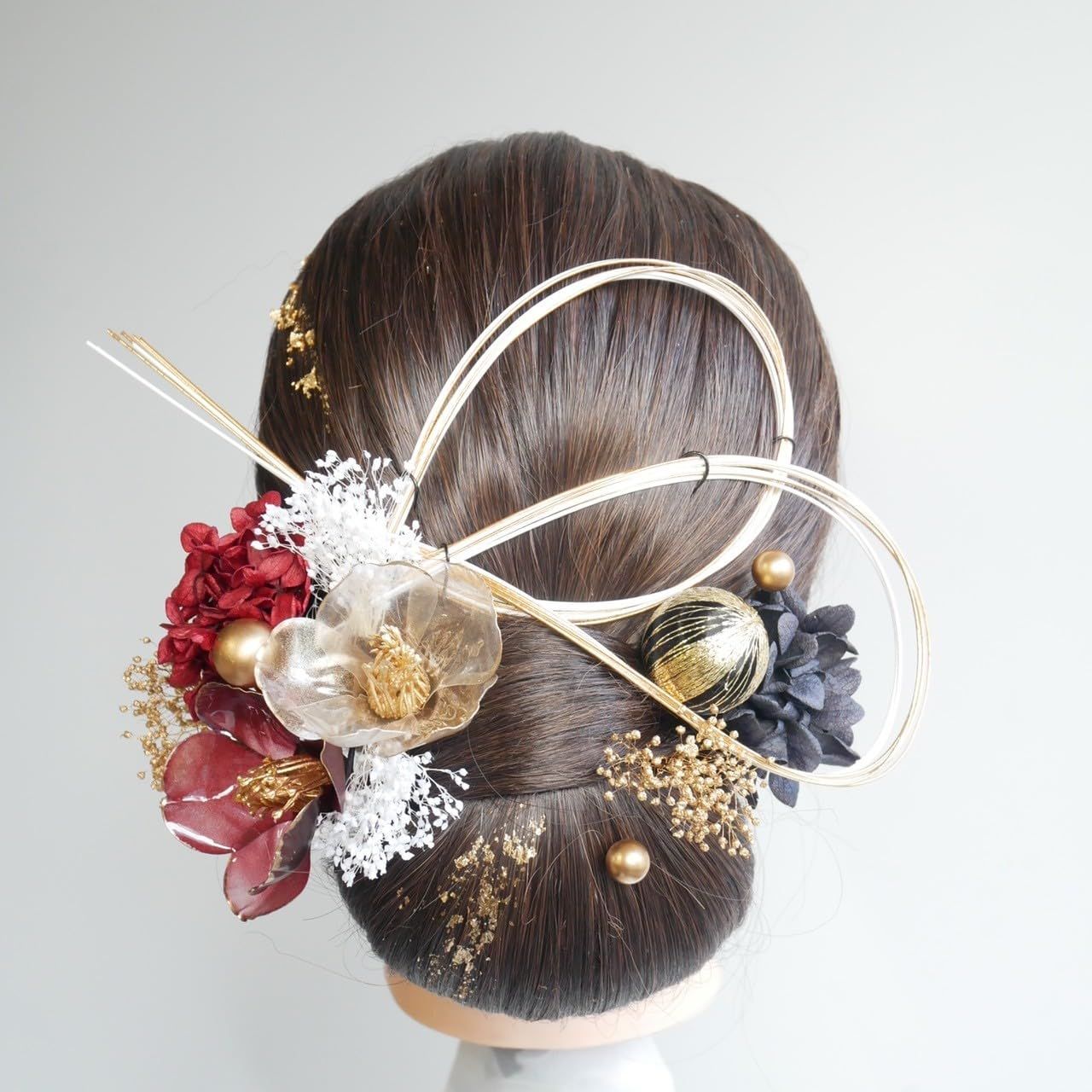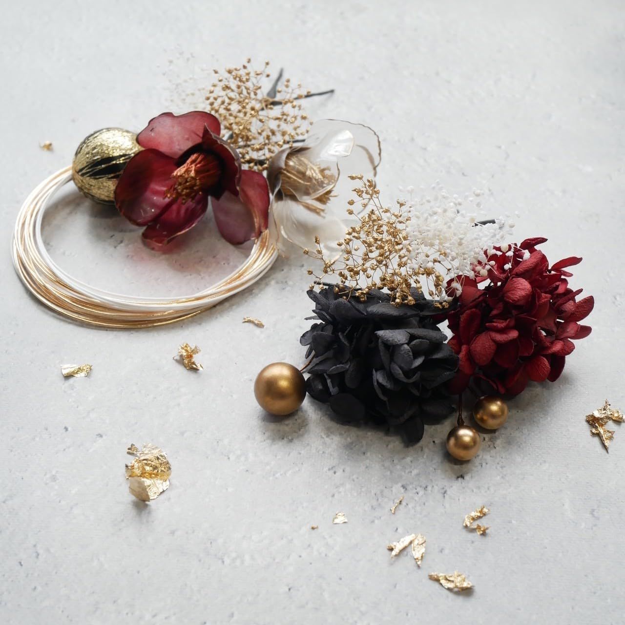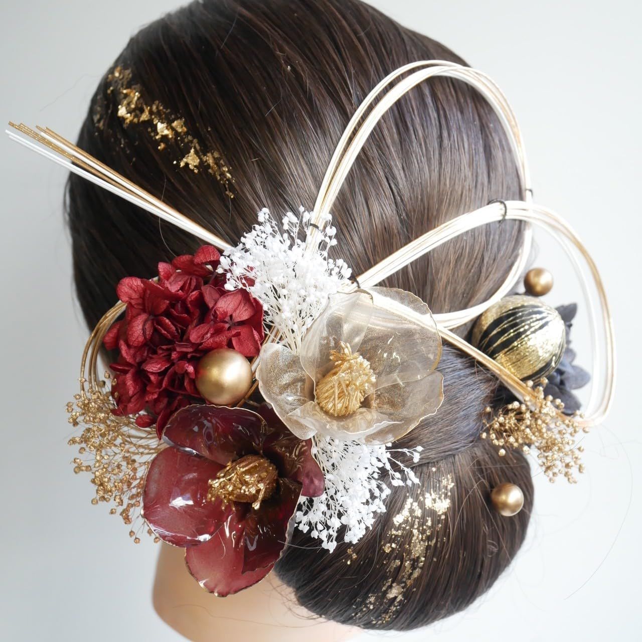 ・赤ゴールドのクリア椿と水引(7本)和玉 ドライフラワーを組み合わせた華やかなセットです。