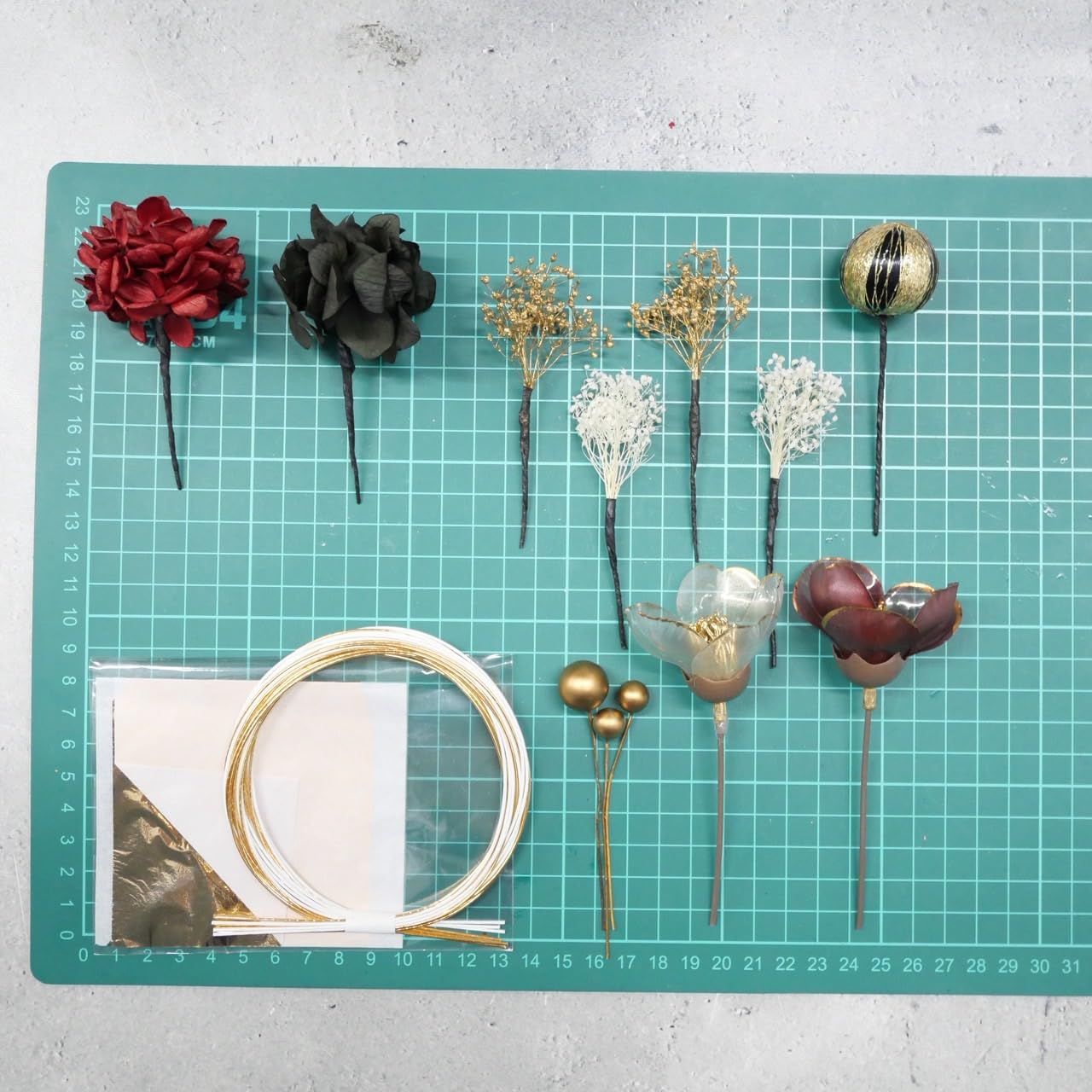 ・♦︎パーツ詳細♦︎水引 ブロンズ4本 白3本(約90センチ)、ドライフラワー6パーツ クリア椿2パーツ、ゴールドパール、和玉小 黒ゴールド、ブロンズ箔シート