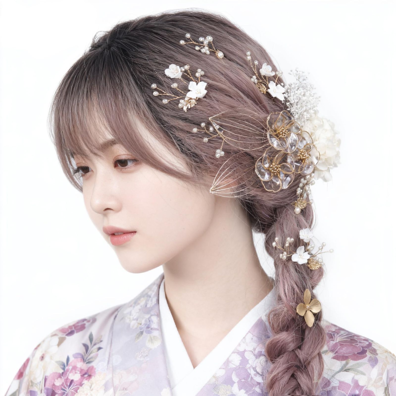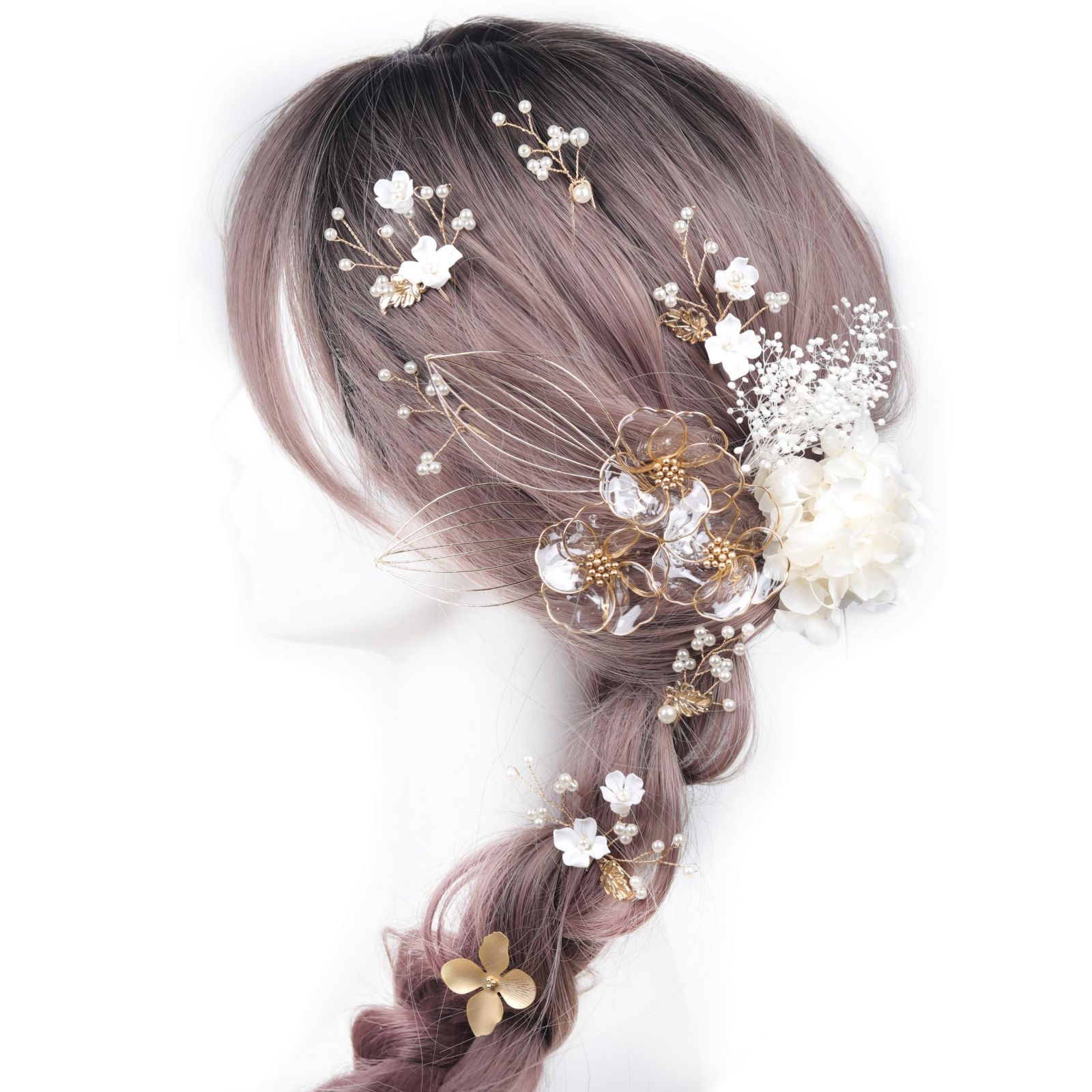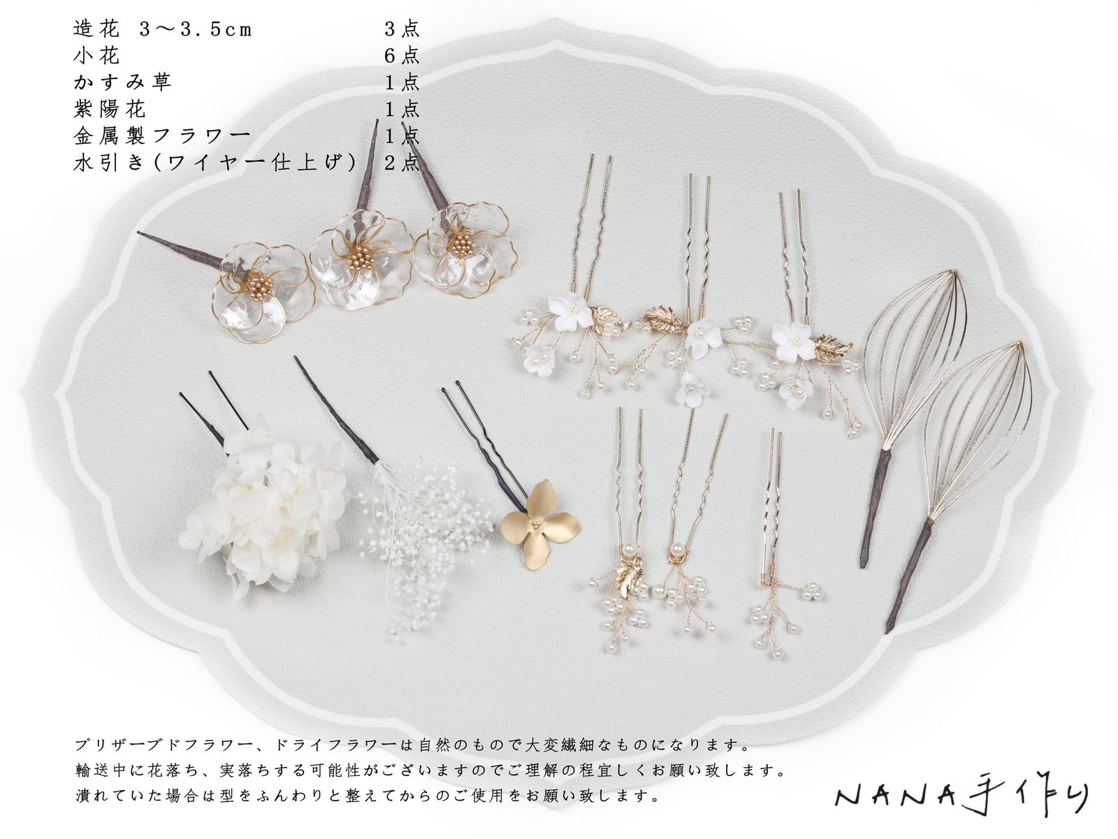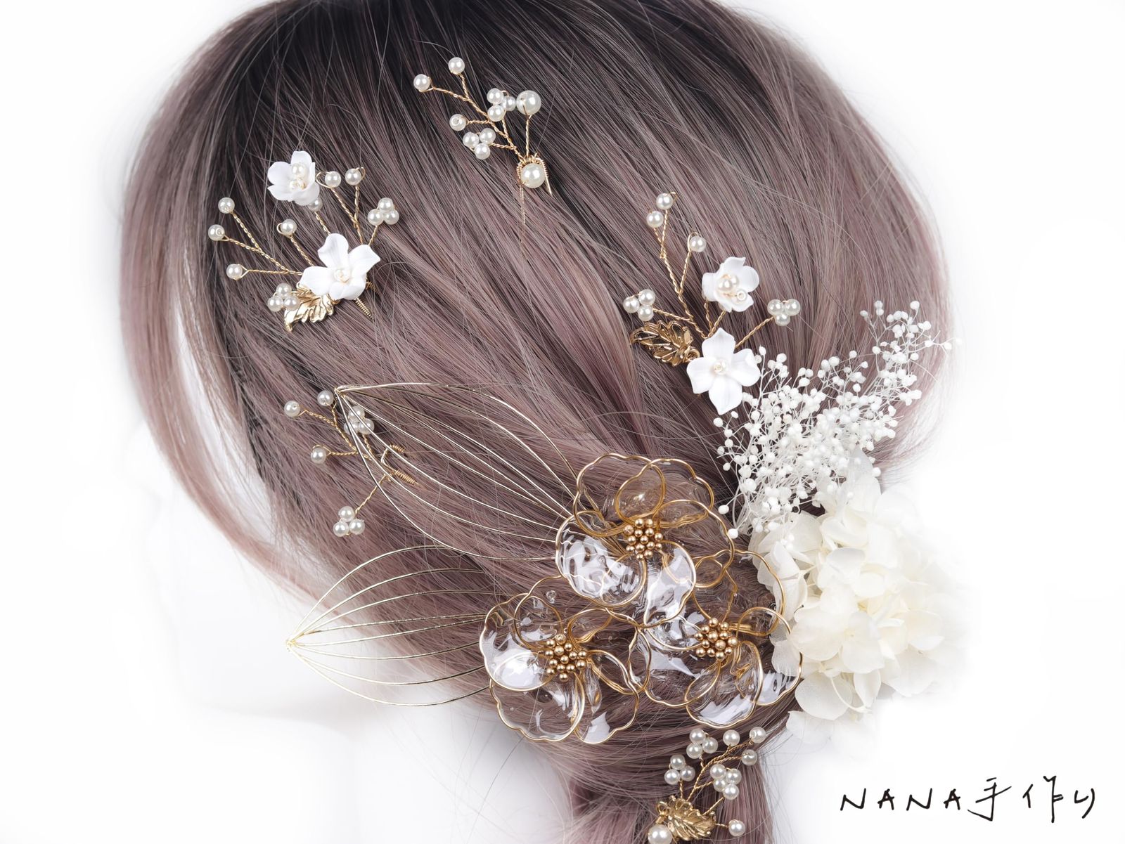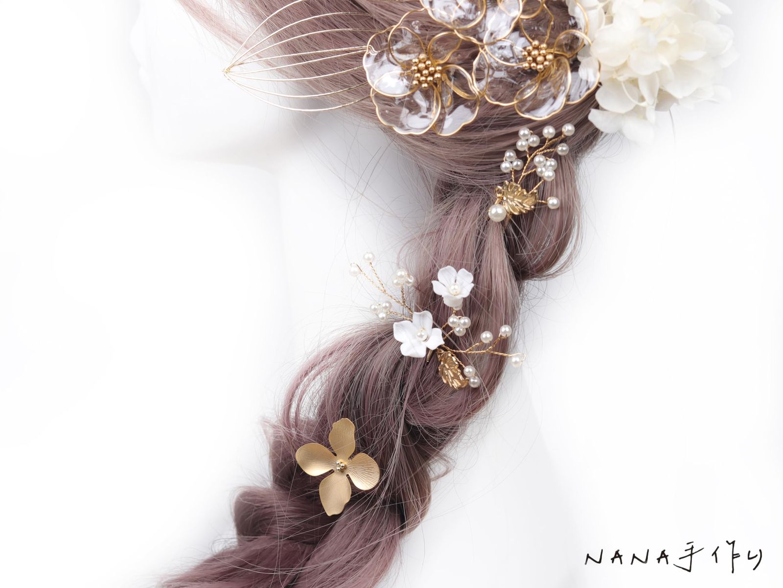[NANA手作り]髪飾り ゴールド シルバー 造花 かすみ草 紫陽花 水引き 成人式 結婚式 卒業式 入学式 夏祭り 花火 浴衣 七五三 振袖