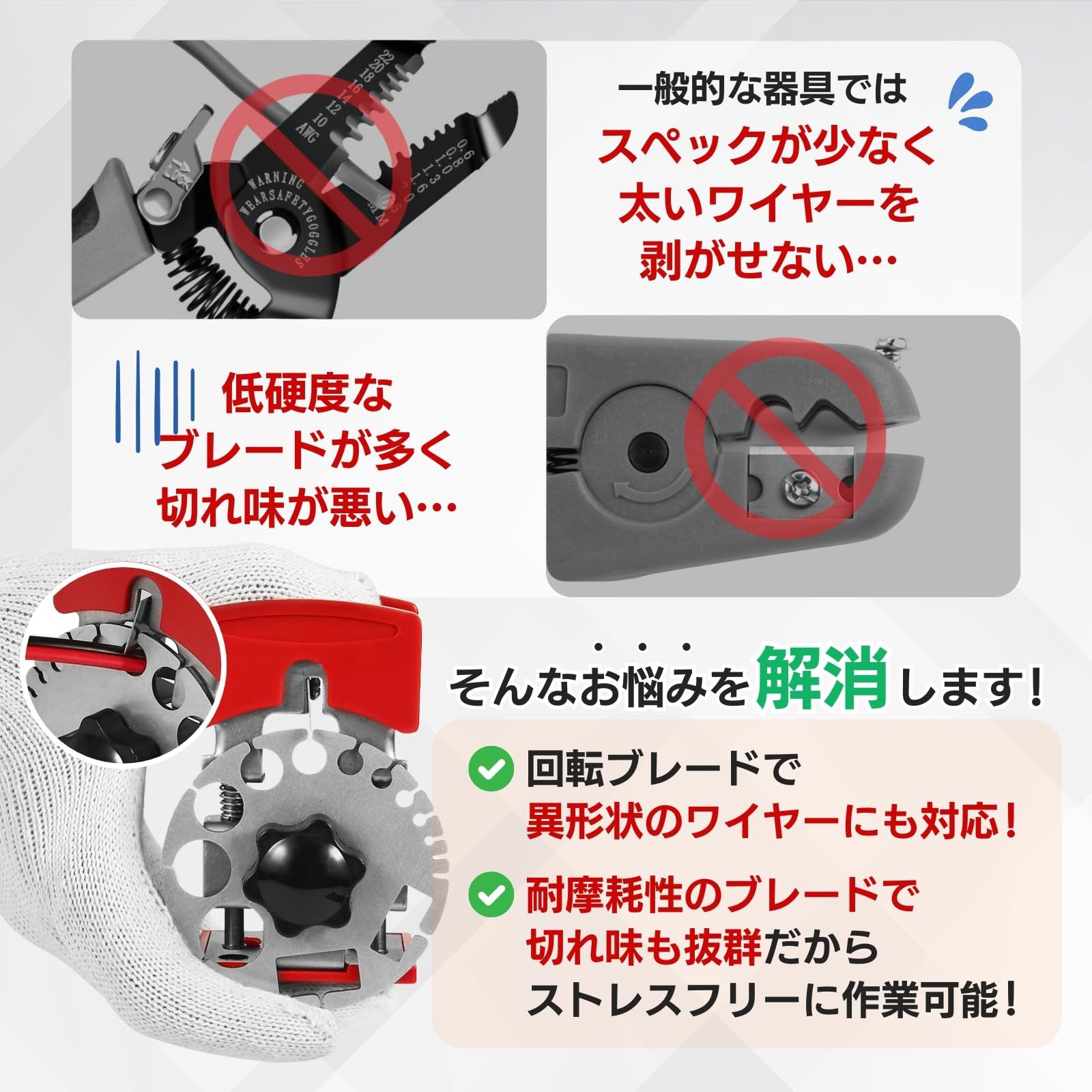 このワイヤーストリッパーで、24AWGから0AWGまでのワイヤーを、シャープで調整可能なブレードで簡単に剥くことができます。コンパクトで頑丈なデザインにより、DIYからプロの電気工事まで幅広く対応。あなたの作業効率を向上させること間違いなし!