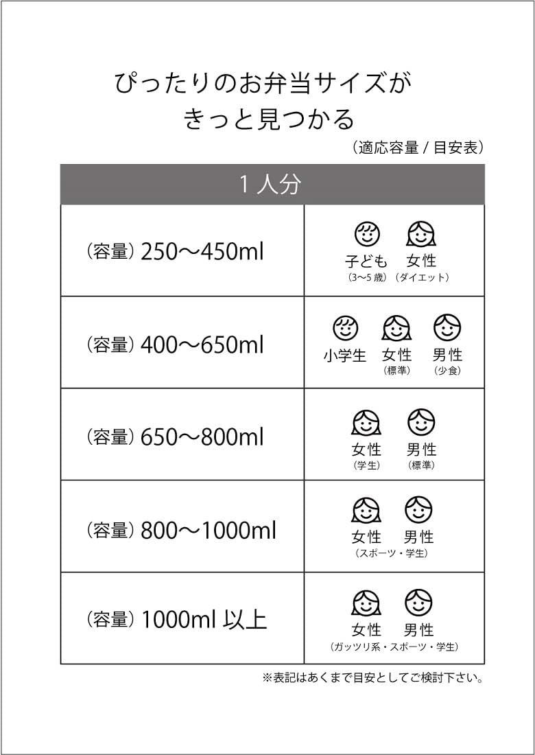 JP0122581X0010B銀イオンAG+抗菌お弁当箱/ドーム型のフタなので食材が押されずふわっと盛り付け。お弁当箱半分に入るご飯の量はお茶碗(約200ml)約1.1杯分、高い仕切りでおかずが片寄りにくく中子付きなのでおかずとご飯をすっきり分けて盛れる素材・材質:フタ=AS樹脂、本体・仕切り=ポリプロピレン、止具=ABS樹脂、パッキン=シリコーンゴム