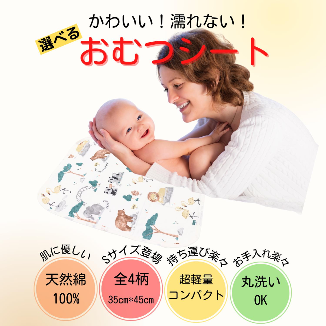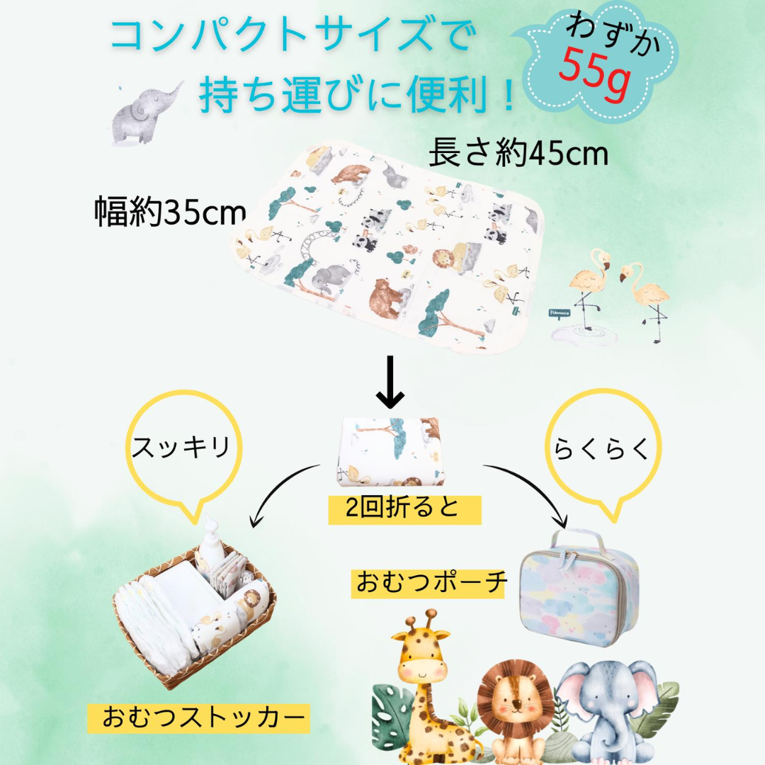 35cm×45cmと超コンパクトサイズなので、外出時におむつポーチに入れて、ベビーカーやチャイルドシートに、ベビーシートとして敷いたりサッと取り出して手軽にお使いいただけます。