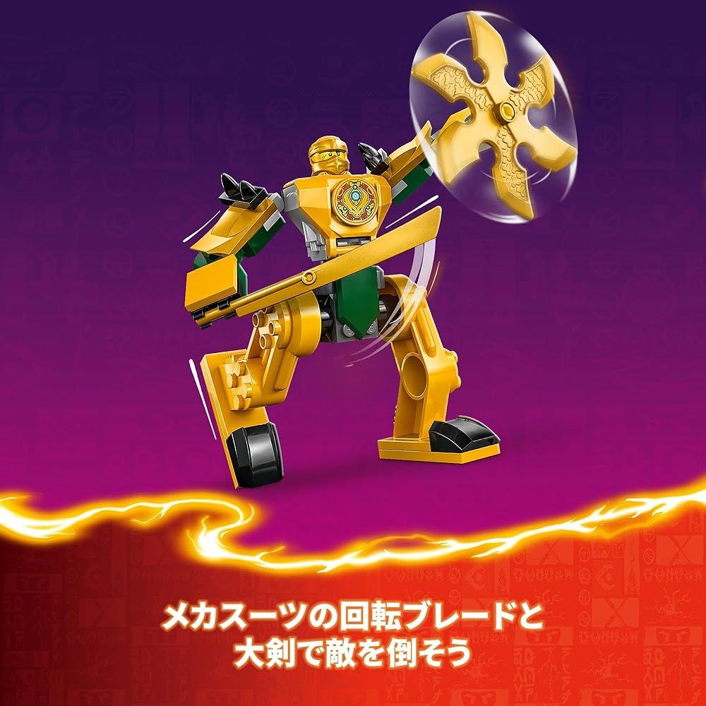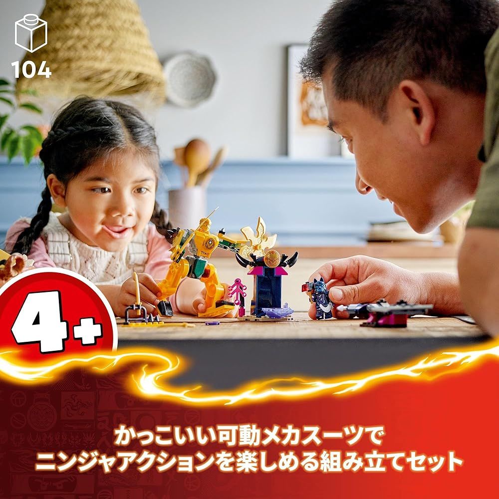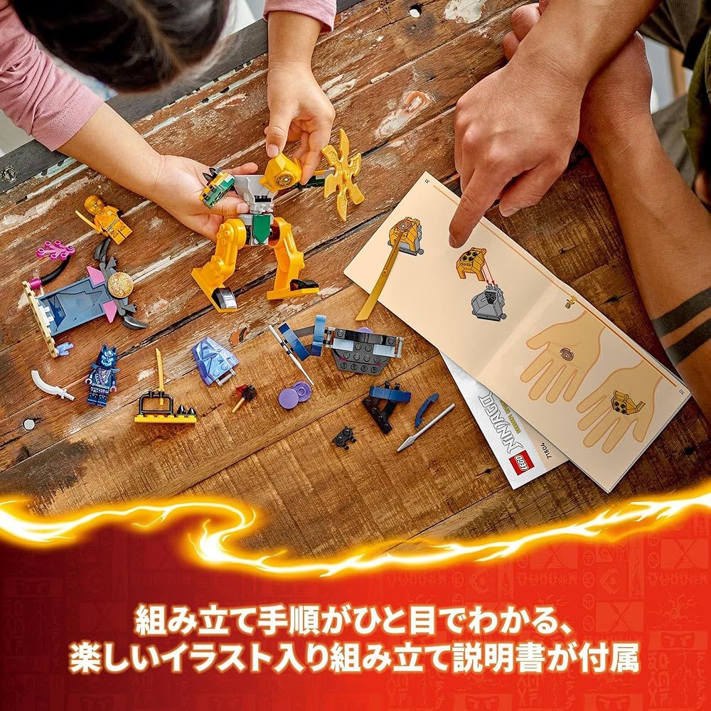 エリンのバトル・メカスーツ(71804)は、ドラゴンを守るために戦うニンジャの物語を通じて、組み立てスキルを学べる組み立てセットです。カッコいいメカスーツを使い、『ニンジャゴー ドラゴンライジング』のアクションを再現できます。(対象年齢:4才以上) エリンと敵のミニフィギュアは、それぞれ剣のアクセサリー付き。エリンのミニフィギュアが入るメカスーツは回転ブレードと大剣を構え、敵が乗るグライダーはディスクシューターと槍2本を搭載し、翼の向きを変えられます。魔法の木槌が隠された水晶の洞窟やゴールドの剣2本を収納する武器棚などもごっこ遊びを盛り上げます。 お子さまの年齢に応じた組み立てとごっこ遊びを念頭に特別開発されたプレイセットです。大きめの基礎ブロックを土台にして、お子さま一人でも自信をもって簡単に組み立てられます。(対象年齢:4才以上)