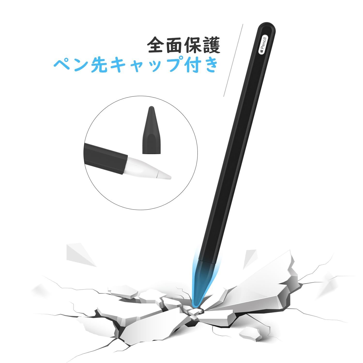 「落下防止」 Apple Pencilは丸型で転がり落ちやすく、ケースを着装後机に置いても簡単に転がりで落ちることありません。ペン先を保護してくれるキャップも付属しており、ペンシルを全体保護しているため、うっかりしてペンシルを落としたときも心配なく、ペンシル全体完璧に守られて、バッグの中に気軽に入れて持ち歩けます。