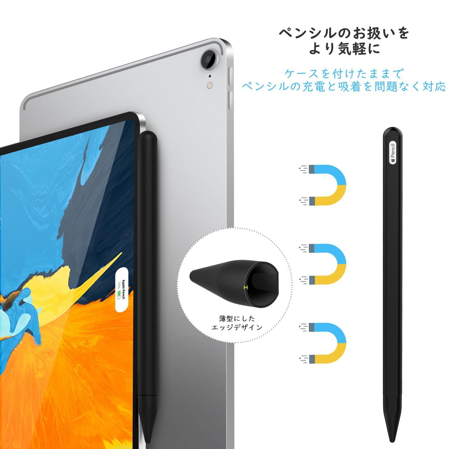 「装着簡単」 カバーのロゴ切り口と合わせて簡単にペンシルを着装できます。取り外すことが必要なくケース着装したままペンシル本体のマグネットを妨げられなくiPadにしっかりと吸着対応できてスムーズに充電されます。