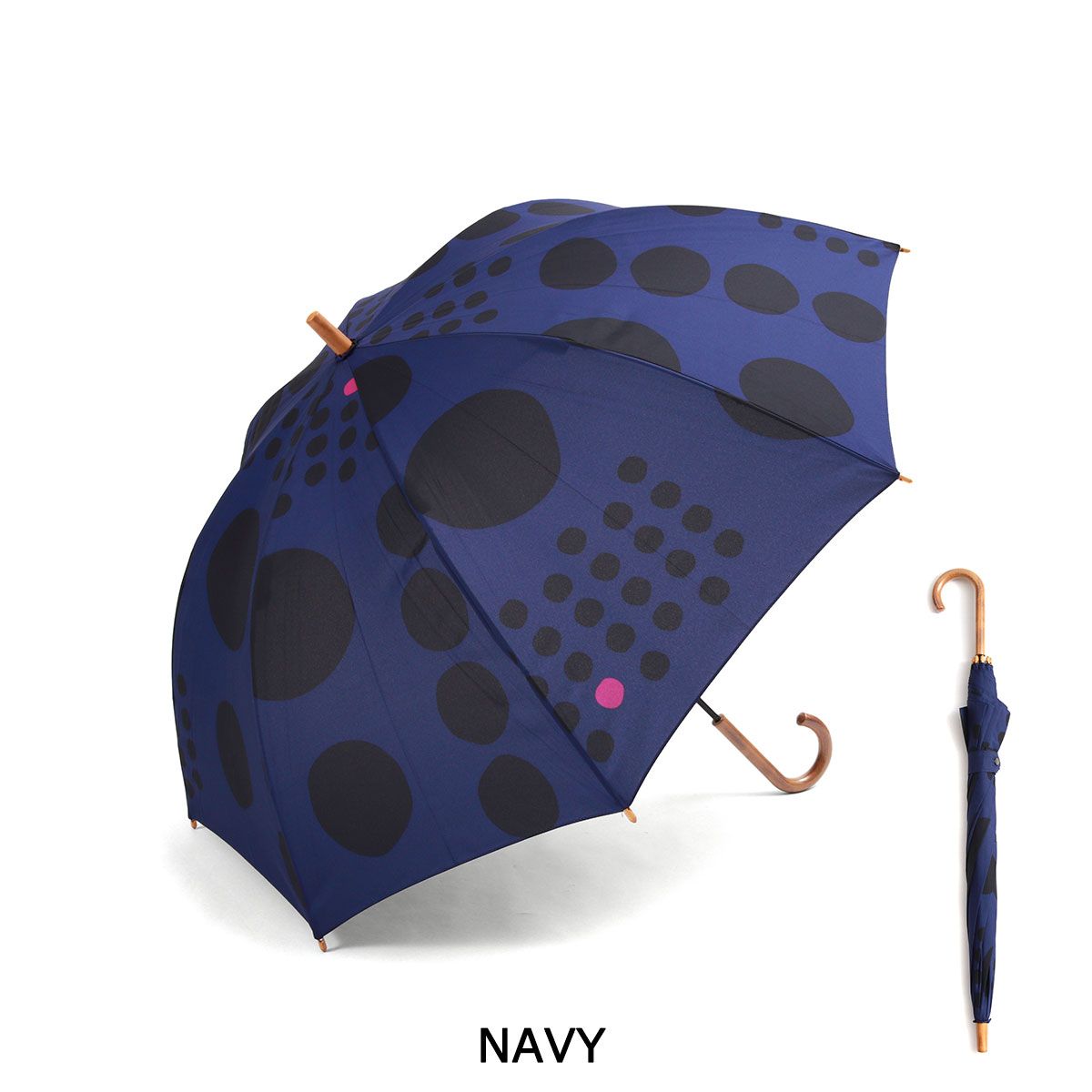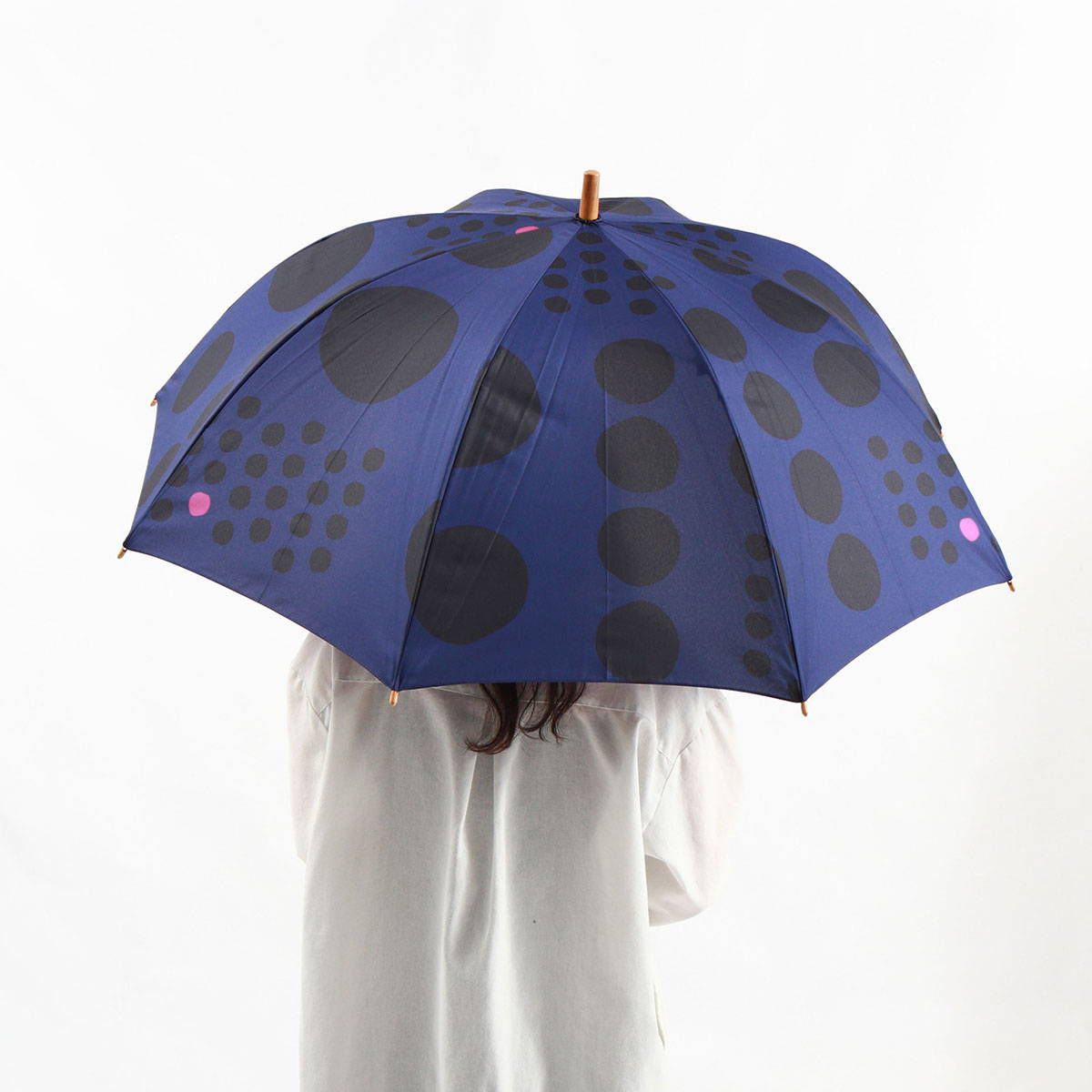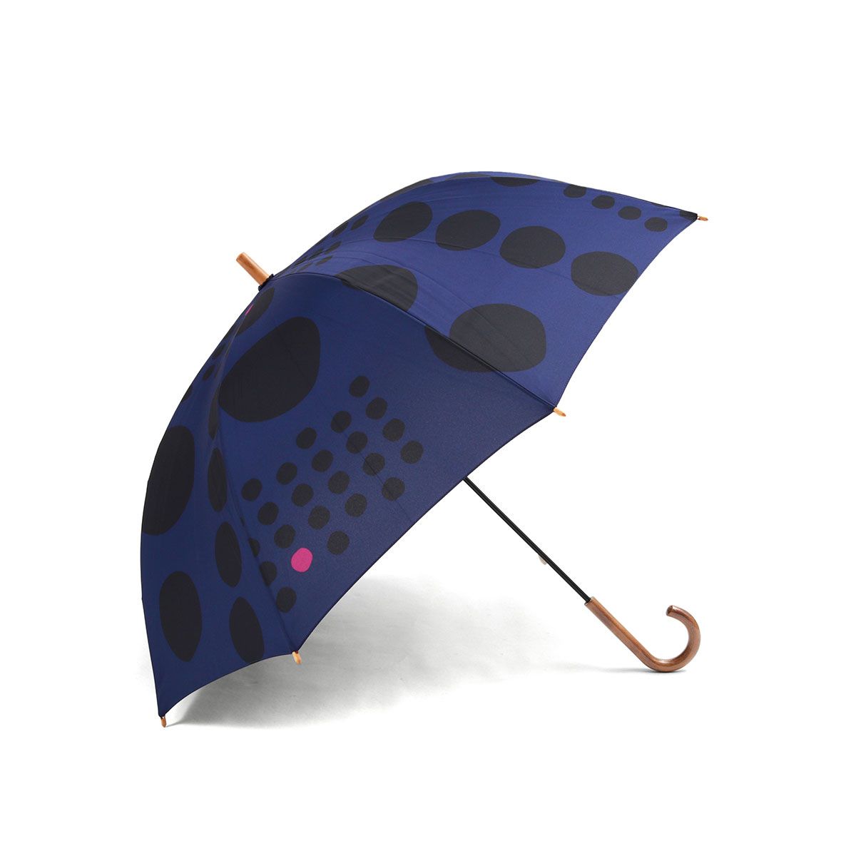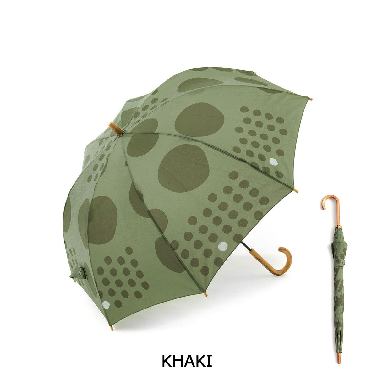 大小さまざまな丸型模様が目を引く、ポップな雰囲気の長傘。親骨と受骨には、丈夫で軽いグラスファイバーを使用し、風に煽られても耐えることができる耐久性を持っています。ハンドルや石つき、つゆ先部分には木製パーツが施され、上品かつナチュラルな印象に。個性と落ち着きを感じさせるデザインが魅力のアイテムです。