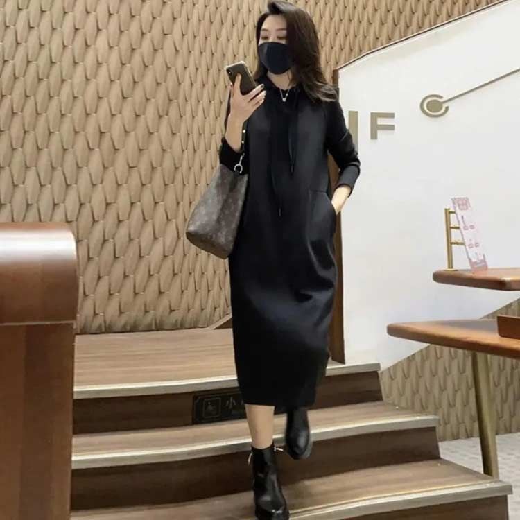 秋冬にぴったりのフード付きパーカーワンピース。