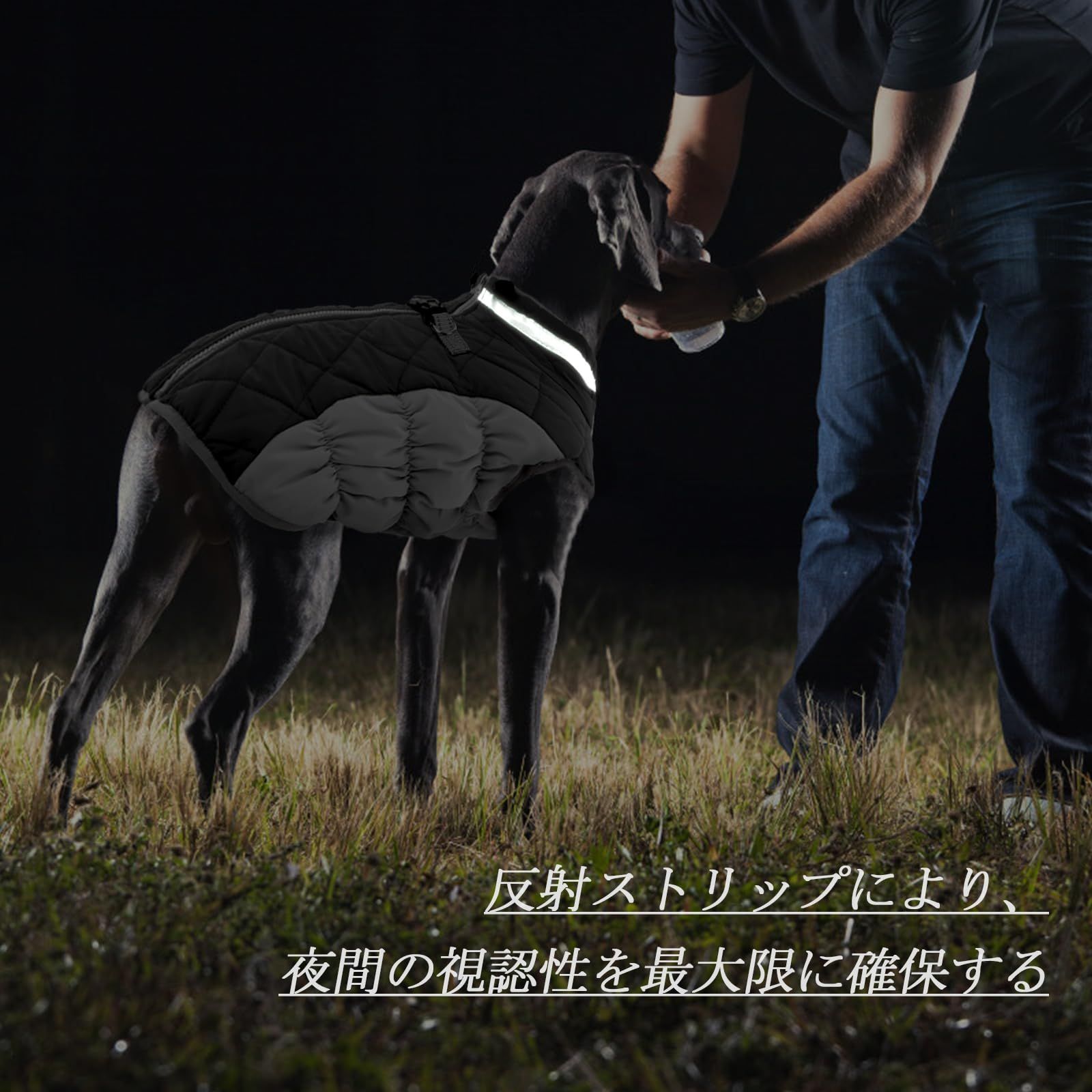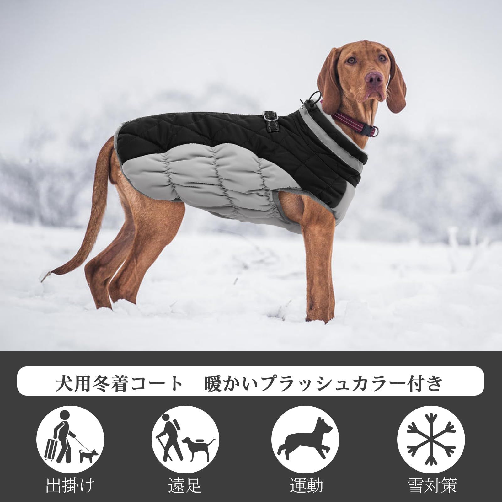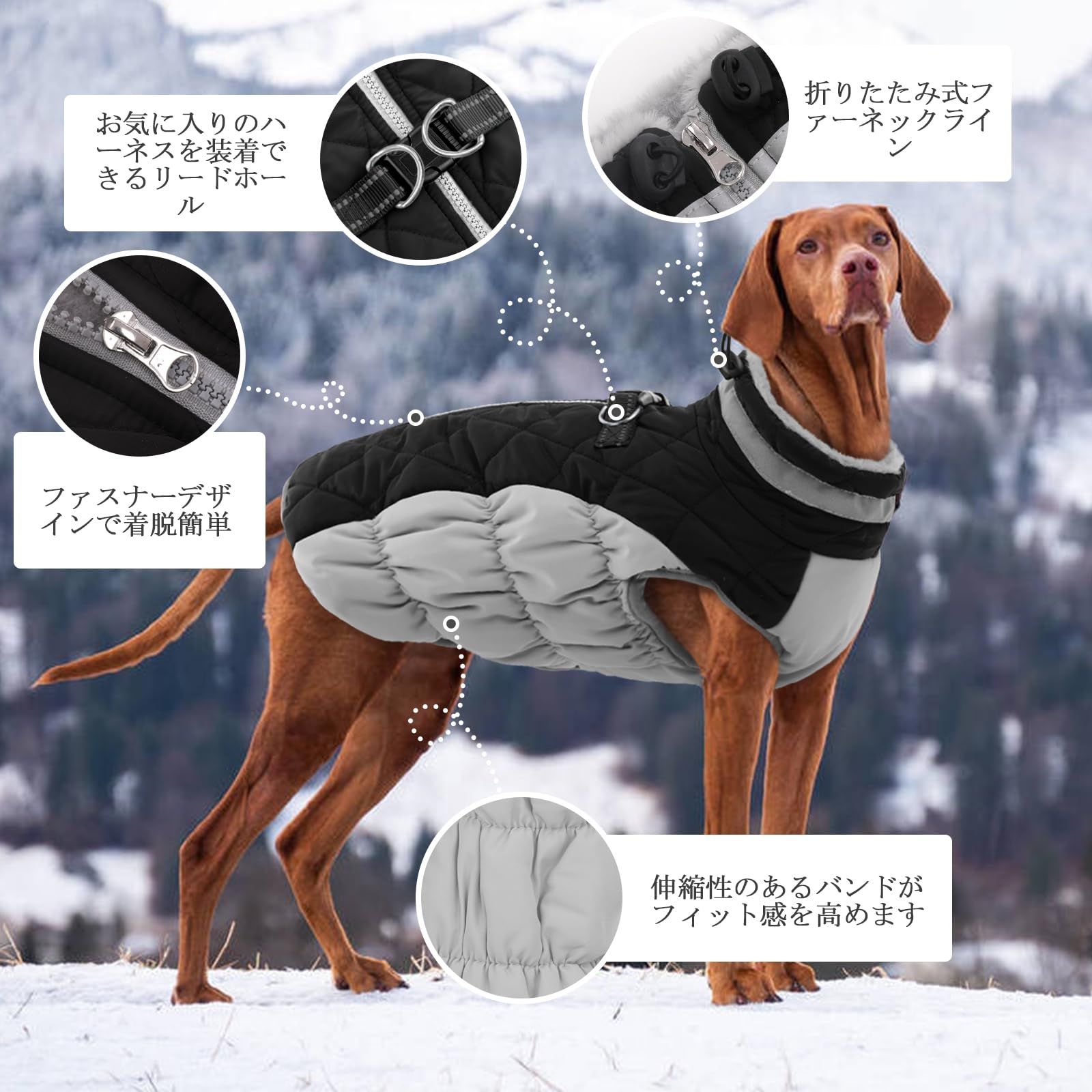 Dリングと反射ストラップ: 犬用防寒ジャケットの首元には、リードを首輪やハーネスに簡単に取り付けられるダブルDリングが付いています。 ジッパー開閉で冷気をシャットアウトです。 首と背中のバックルストラップには視認性の高い反射トリミングが縫い付けられているので、緊急時にペットを素早く見つけることができ、夜間でも愛犬をより安全に守ることができます。