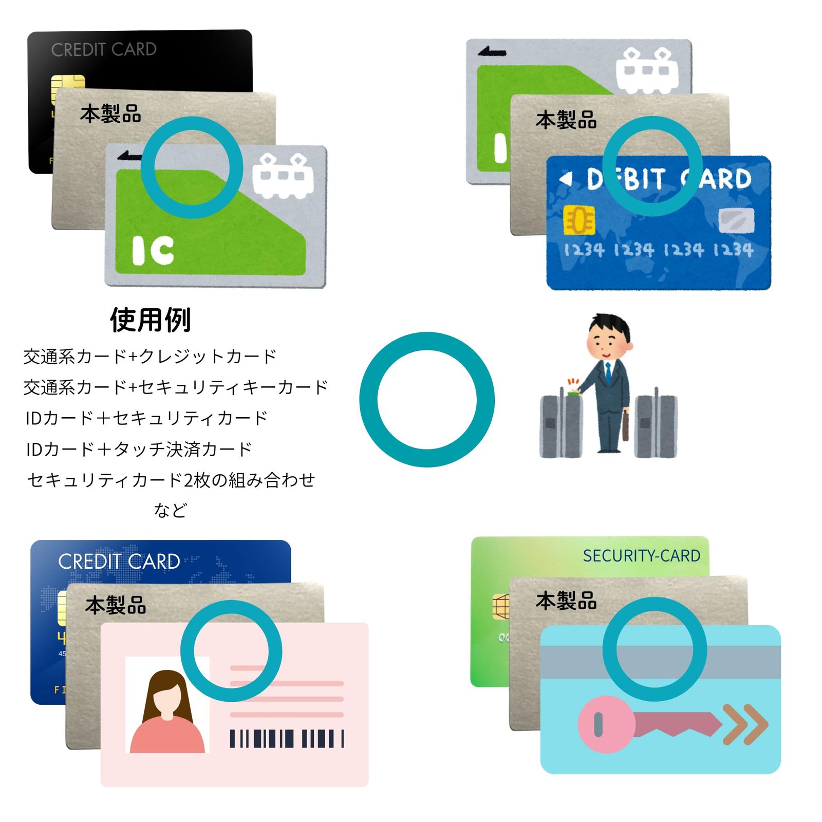 カードを重ねでも安心:社員証などやICカードなどとの干渉を低減し、改札や入退室ゲートでの読み取りエラーを抑えます。使い方は挟むだけ:カードとカードの間にシートを1枚挟むだけ。ケースやパスホルダーに入れたまま使えます。一般的なカードサイズ:**85×53mm(角丸)**で多くのID・ICカードに対応。薄型、軽量で収納性を損ないません。身近な利用シーンで活躍:入退室ゲート、倉庫電気錠、社員食堂のキャッシュレス決済など、社内ユースに最適。ご注意:すべてのカード/リーダー環境での動作を保証するものではありません。カードの種類・リーダー出力・ケース材質により結果が異なる場合があります。